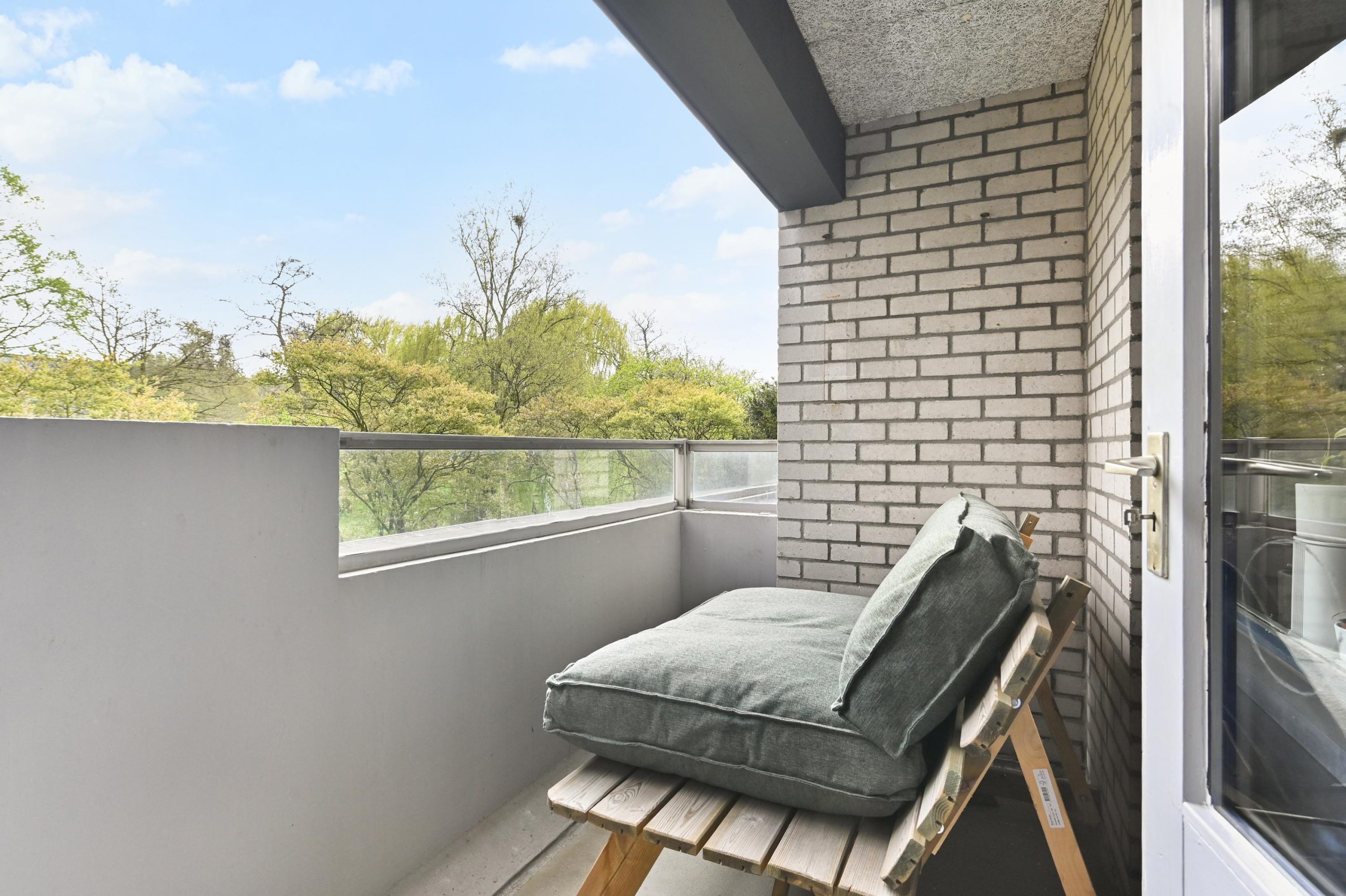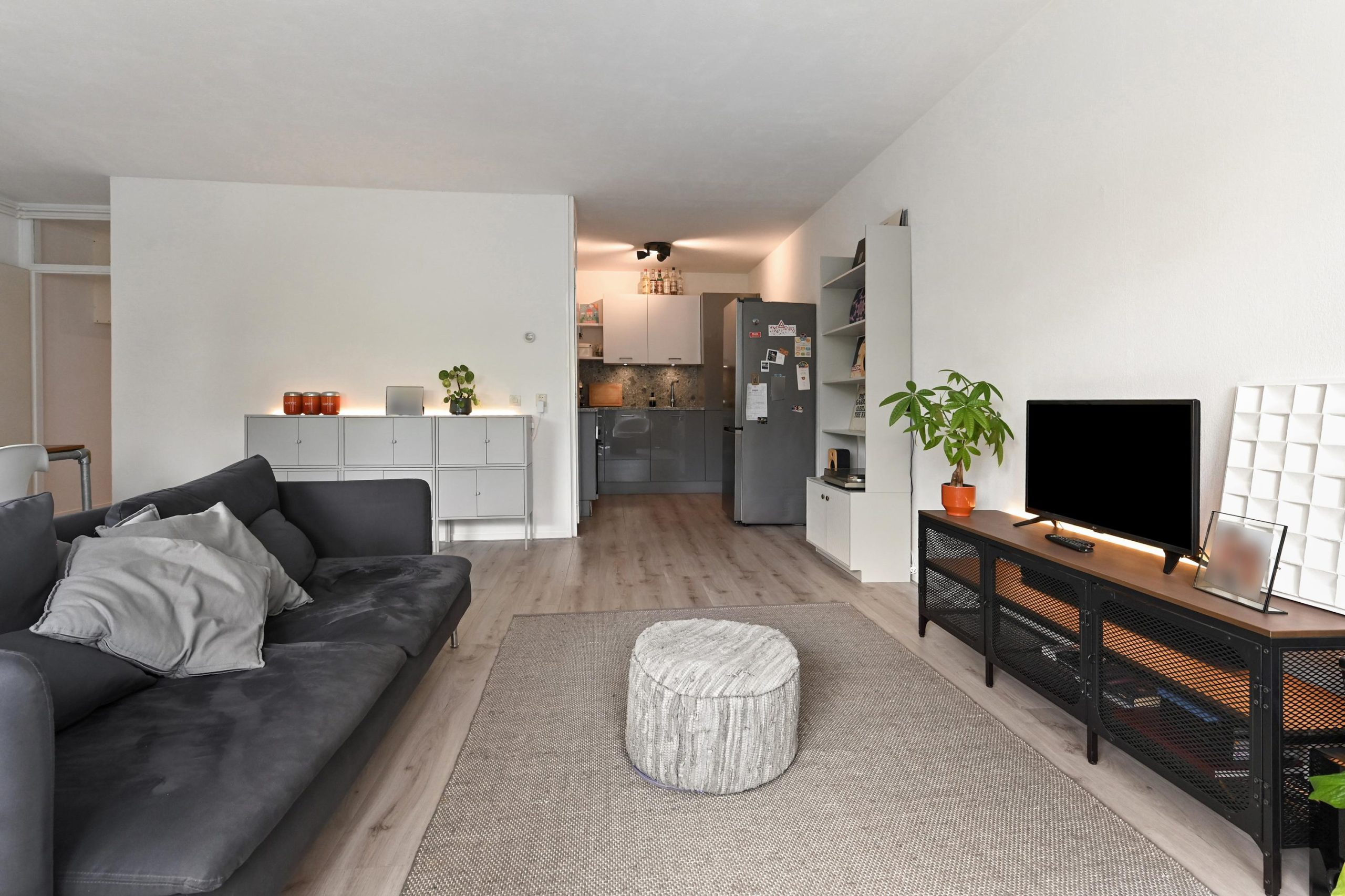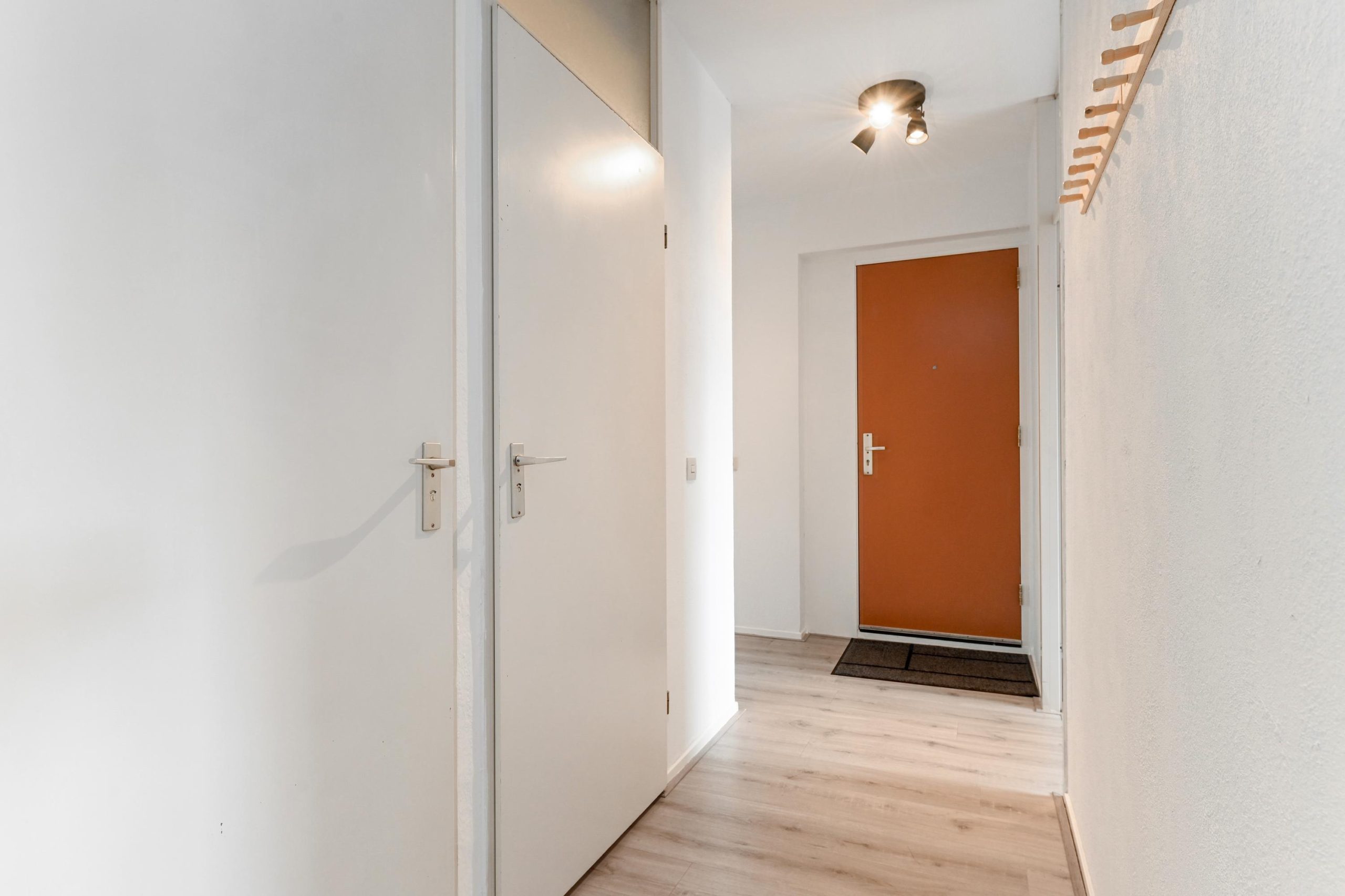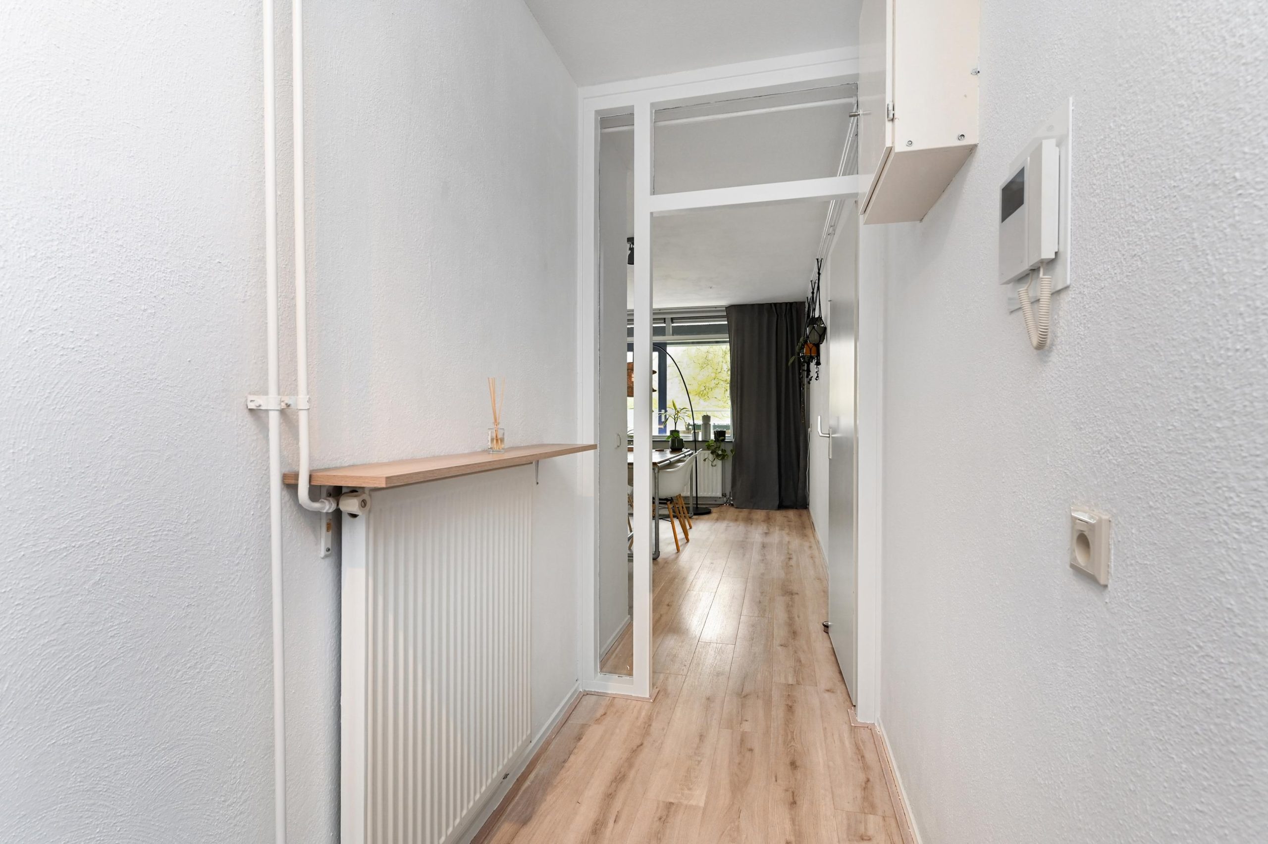 De L-vormige hal geeft toegang tot een modern toilet (voorzien van wastafel), badkamer en twee slaapkamers van resp. 12.5m² en 11m². De badkamer is voorzien van een douchecabine, wastafel met meubel en handdoekradiator. Ook biedt de badkamer voldoende ruimte voor het plaatsen van een wasmachine en droger. De woonkamer heeft een oppervlakte van 34 m², plafondhoogte bedraagt 2.55 meter. Het aangrenzende balkon van 5m² ligt op het zuidoosten. De halfopen keuken beschikt over een vier pits inductie kookplaat met afzuigkap, oven, losse koelvries combi en magnetron. Ook bevindt zich hier een kast met de cv-installatie.
