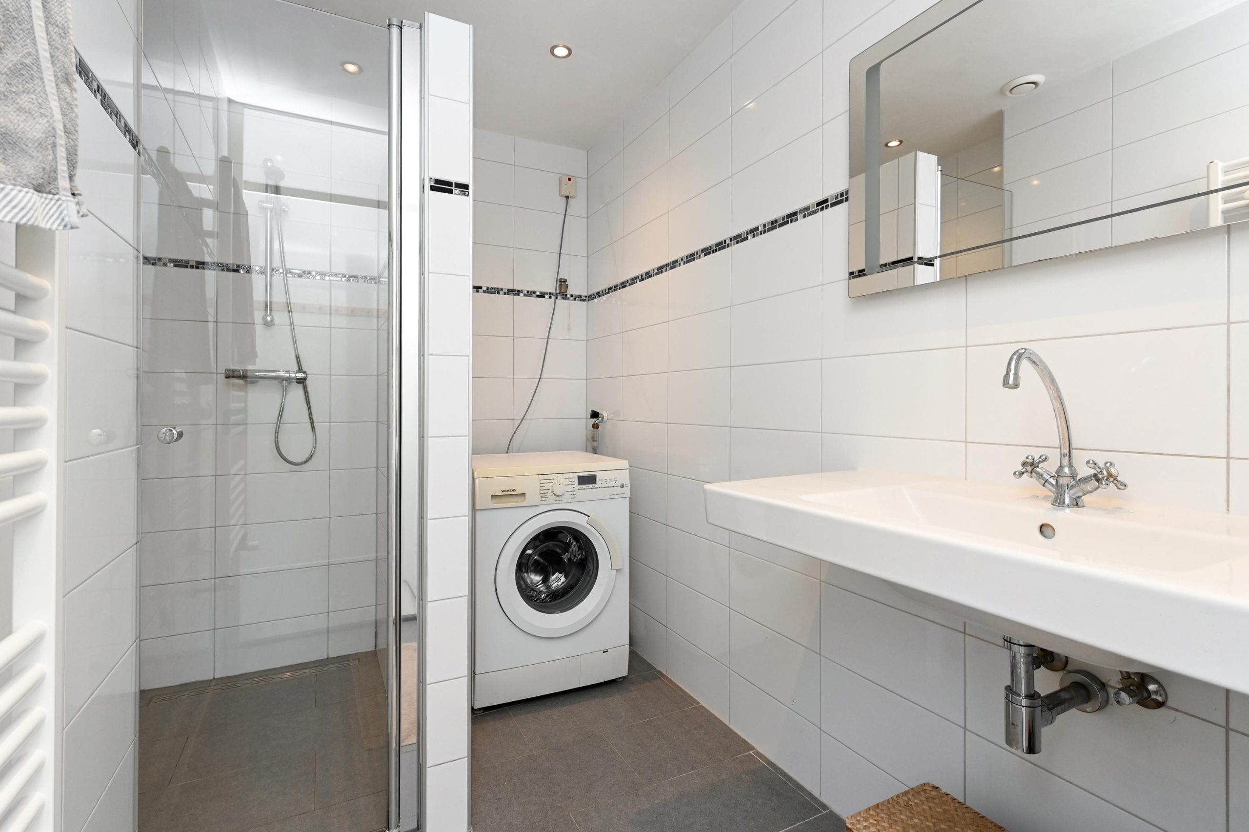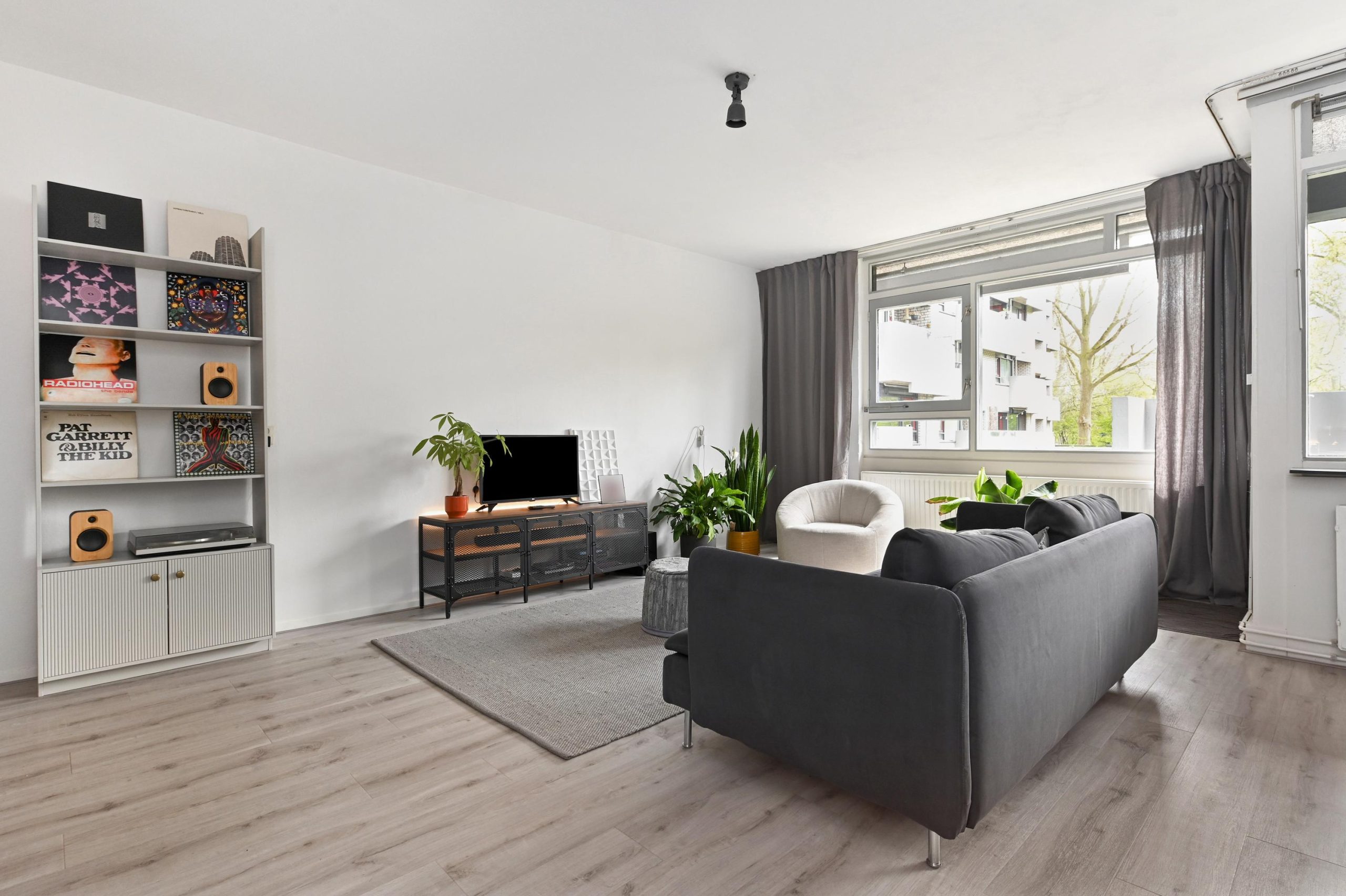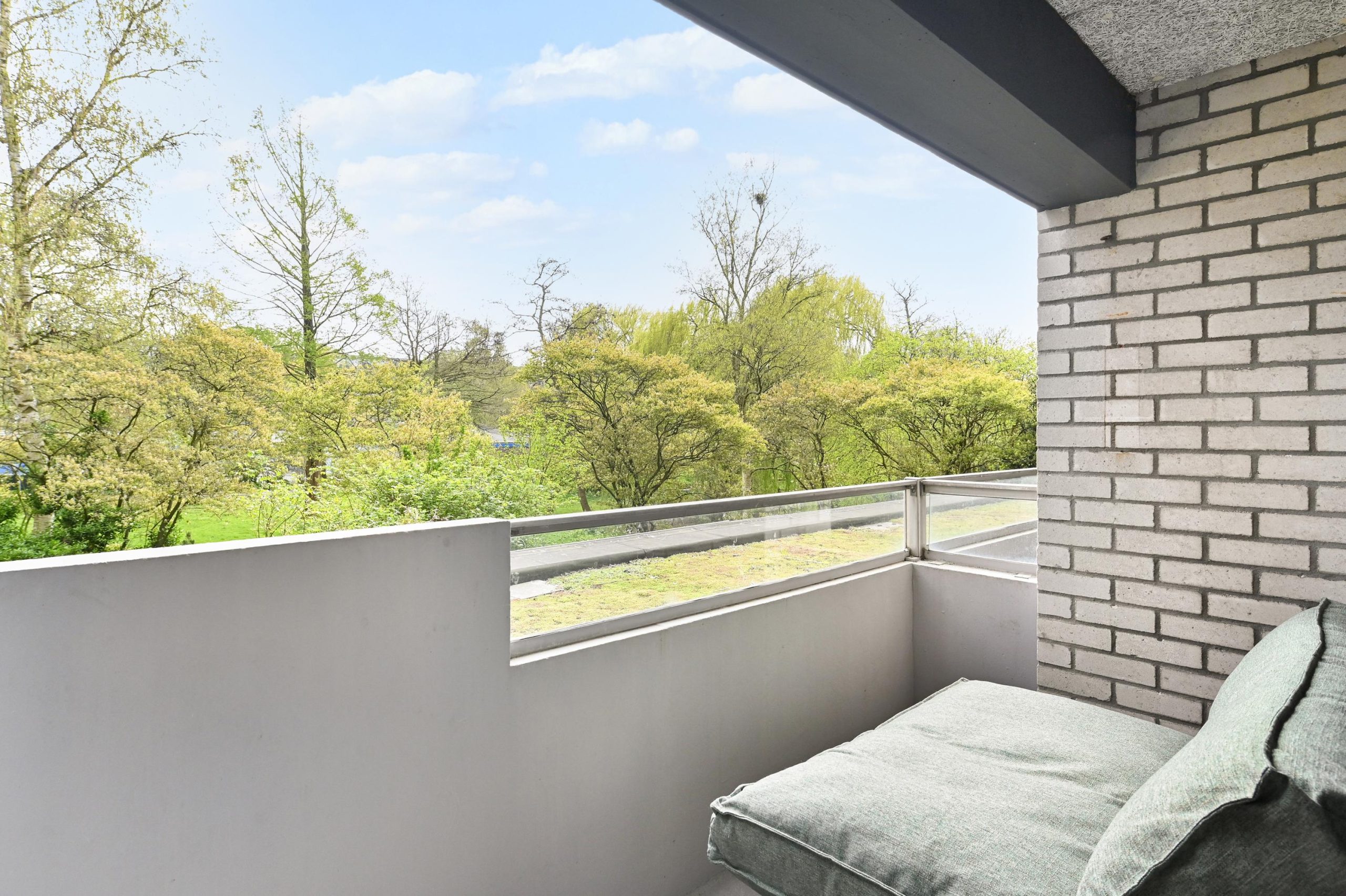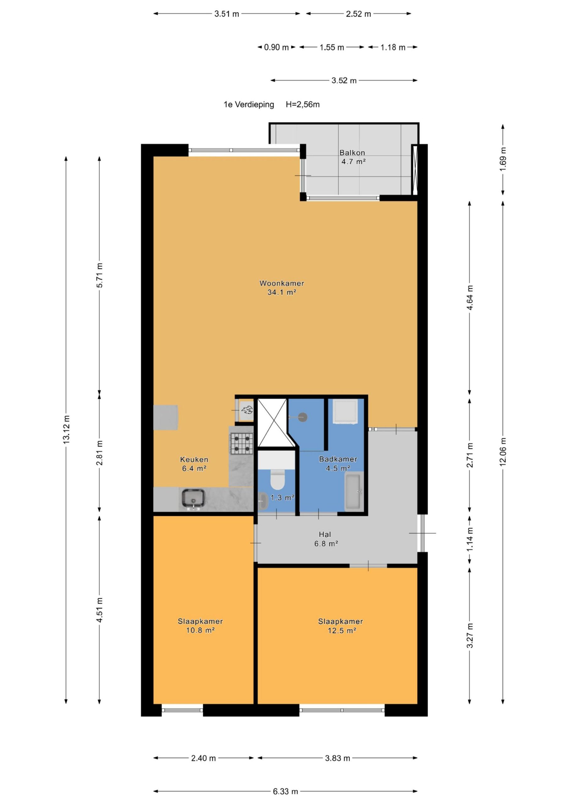 De L-vormige hal geeft toegang tot een modern toilet (voorzien van wastafel), badkamer en twee slaapkamers van resp. 12.5m² en 11m². De badkamer is voorzien van een douchecabine, wastafel met meubel en handdoekradiator. Ook biedt de badkamer voldoende ruimte voor het plaatsen van een wasmachine en droger. De woonkamer heeft een oppervlakte van 34 m², plafondhoogte bedraagt 2.55 meter. Het aangrenzende balkon van 5m² ligt op het zuidoosten. De halfopen keuken beschikt over een vier pits inductie kookplaat met afzuigkap, oven, losse koelvries combi en magnetron. Ook bevindt zich hier een kast met de cv-installatie.