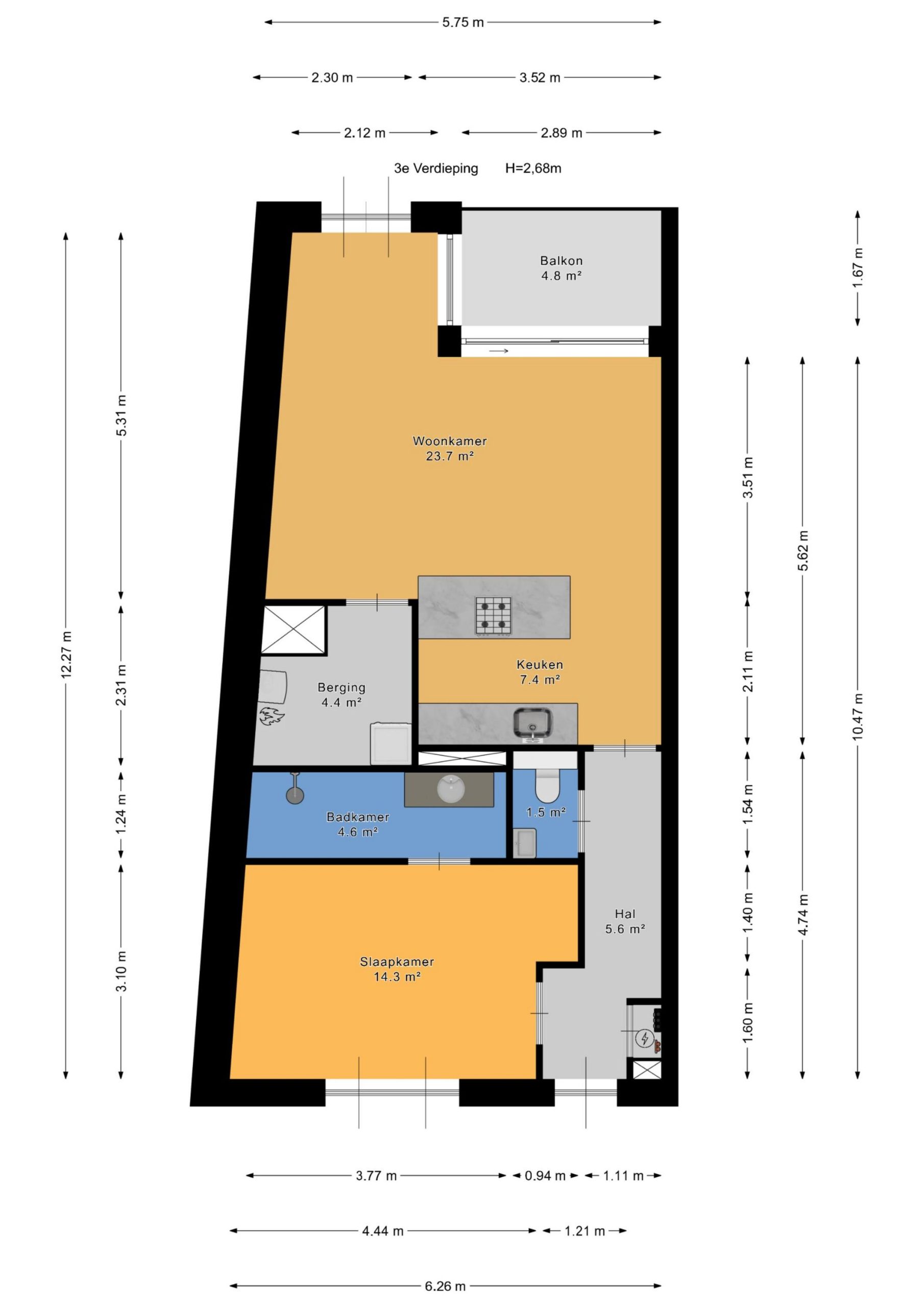 Met de lift of de trap bereik je via de galerij je appartement. Deze woning is gesitueerd aan het einde van galerij. Eenmaal binnen heb je vanuit de hal toegang tot het toilet, de slaapkamer (14m2) en woonkamer (24m2) met open luxe keuken voorzien van een schiereiland en inbouw apparatuur. Ook is er een techniekruimte in het appartement. Hier kun je je wasmachine en droger neerzetten en je voorraad opbergen.