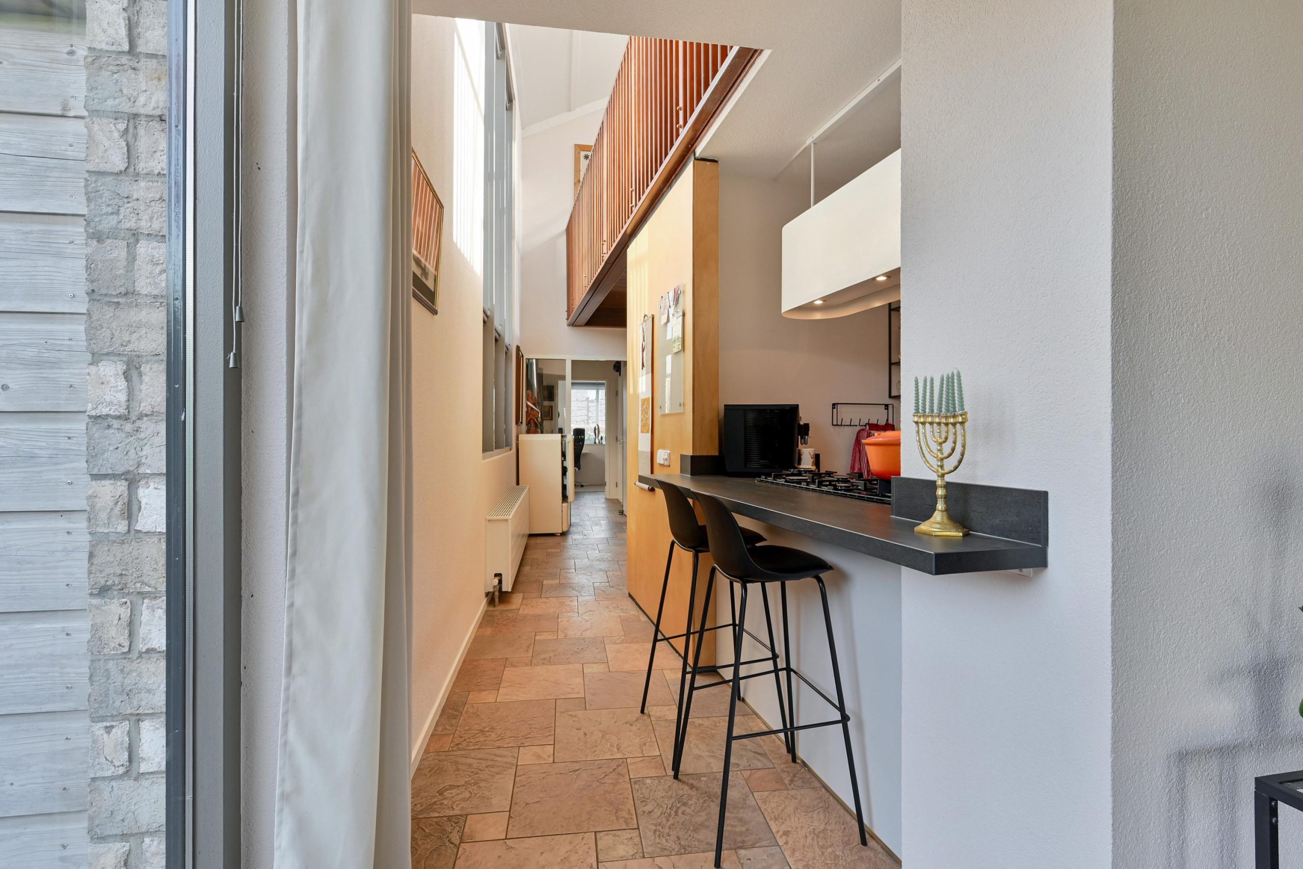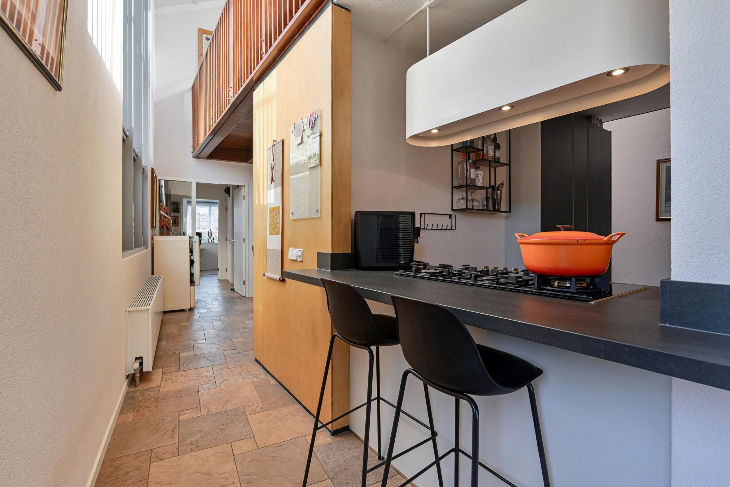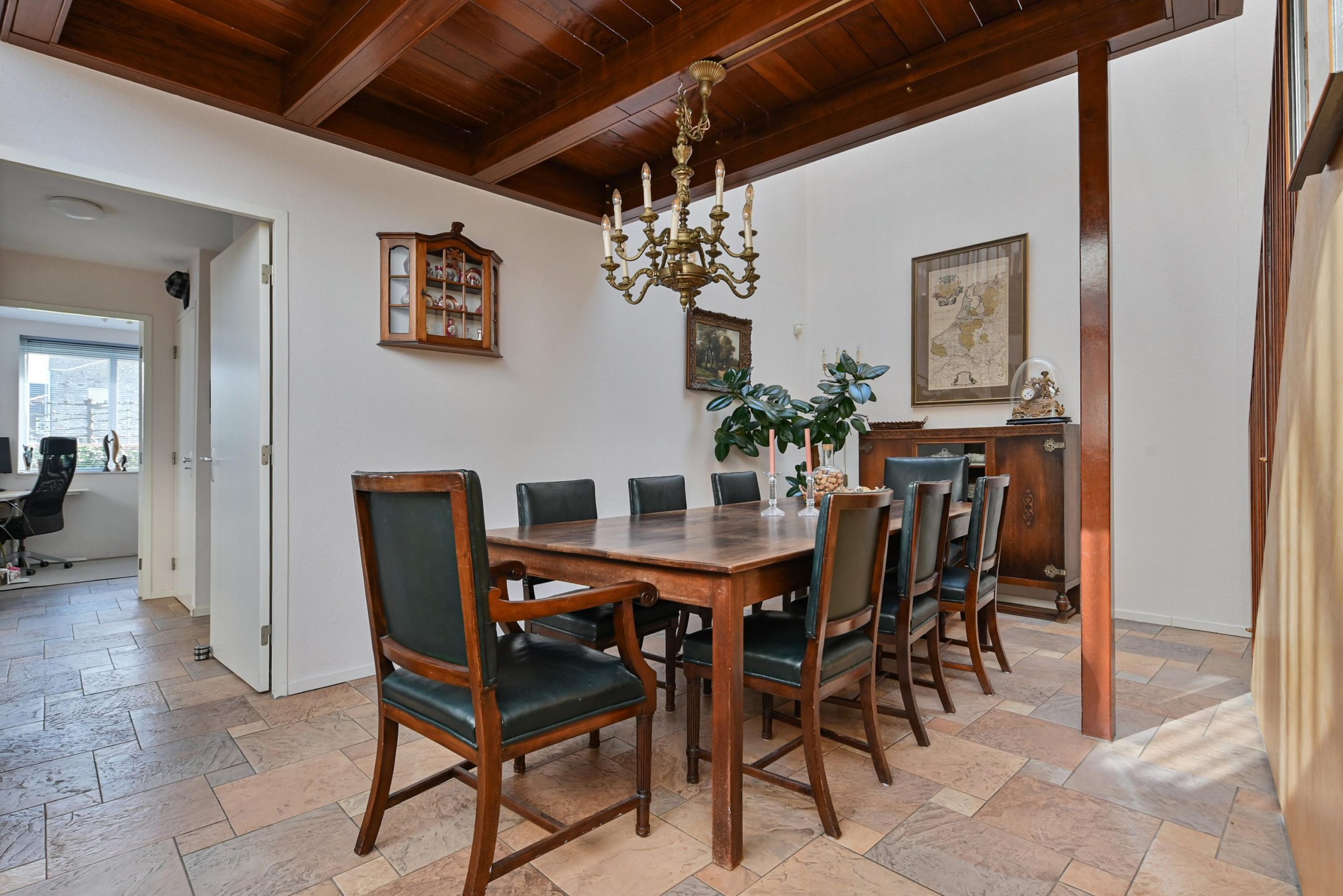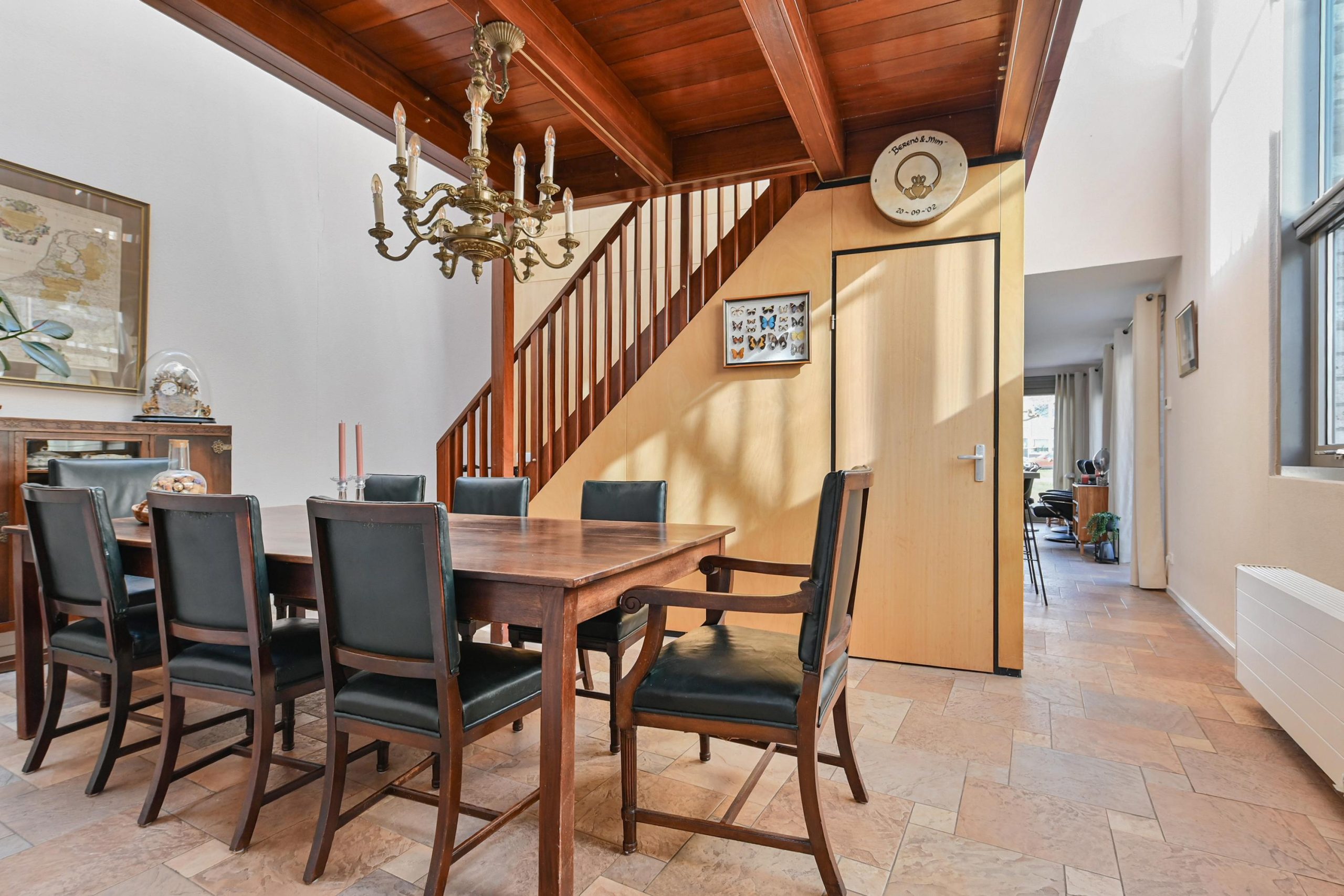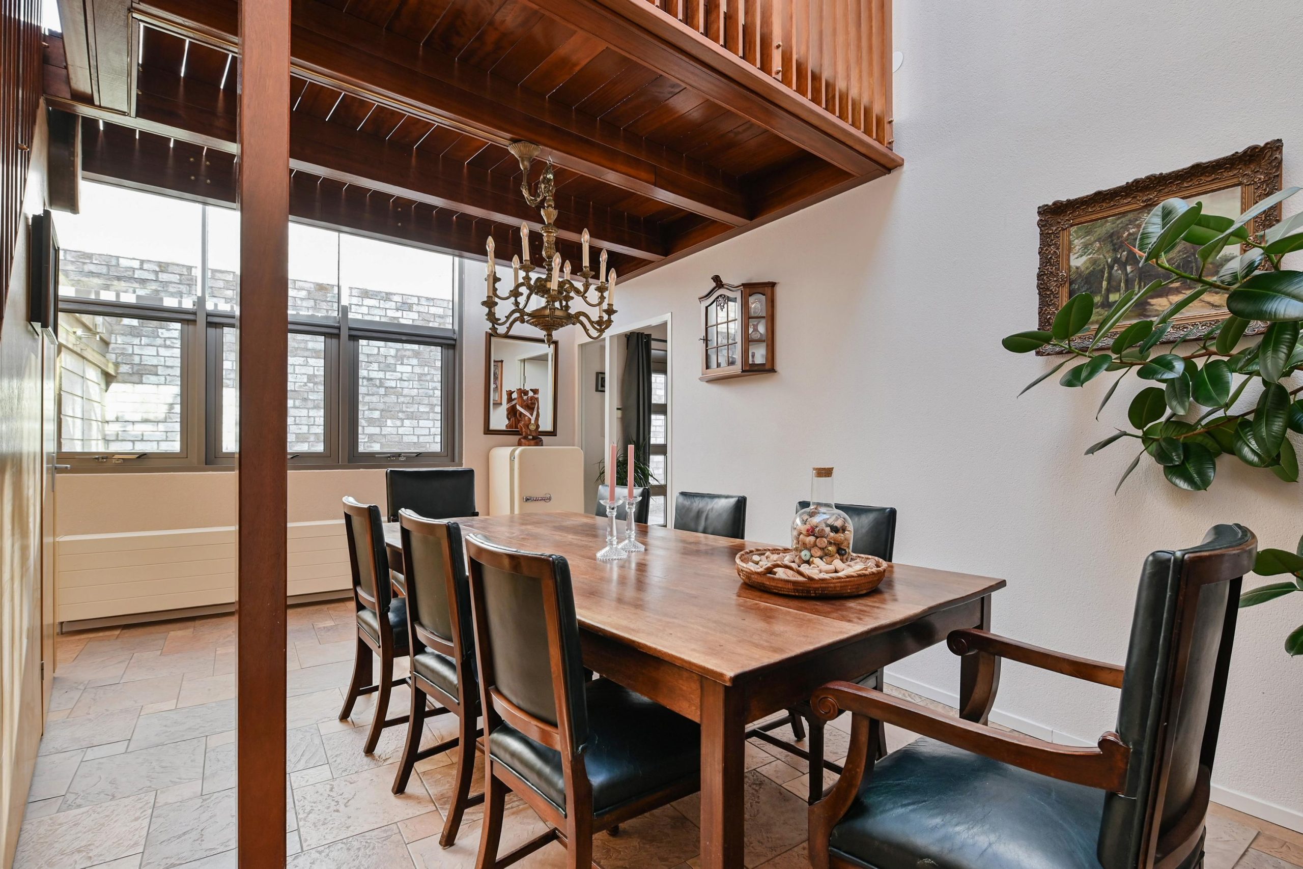 De eetkamer vormt het centrale punt van de woning en valt direct op door de indrukwekkende vide van circa 7,5 meter hoog, die zorgt voor een uitzonderlijke lichtinval en een open karakter.