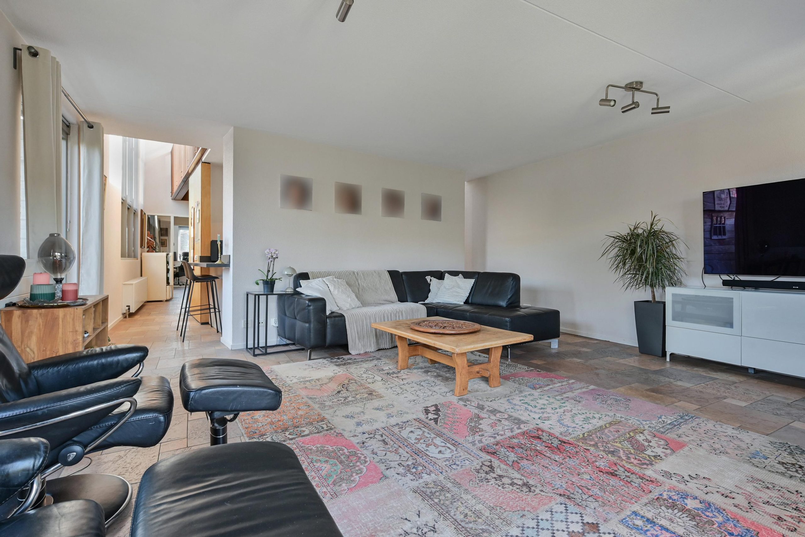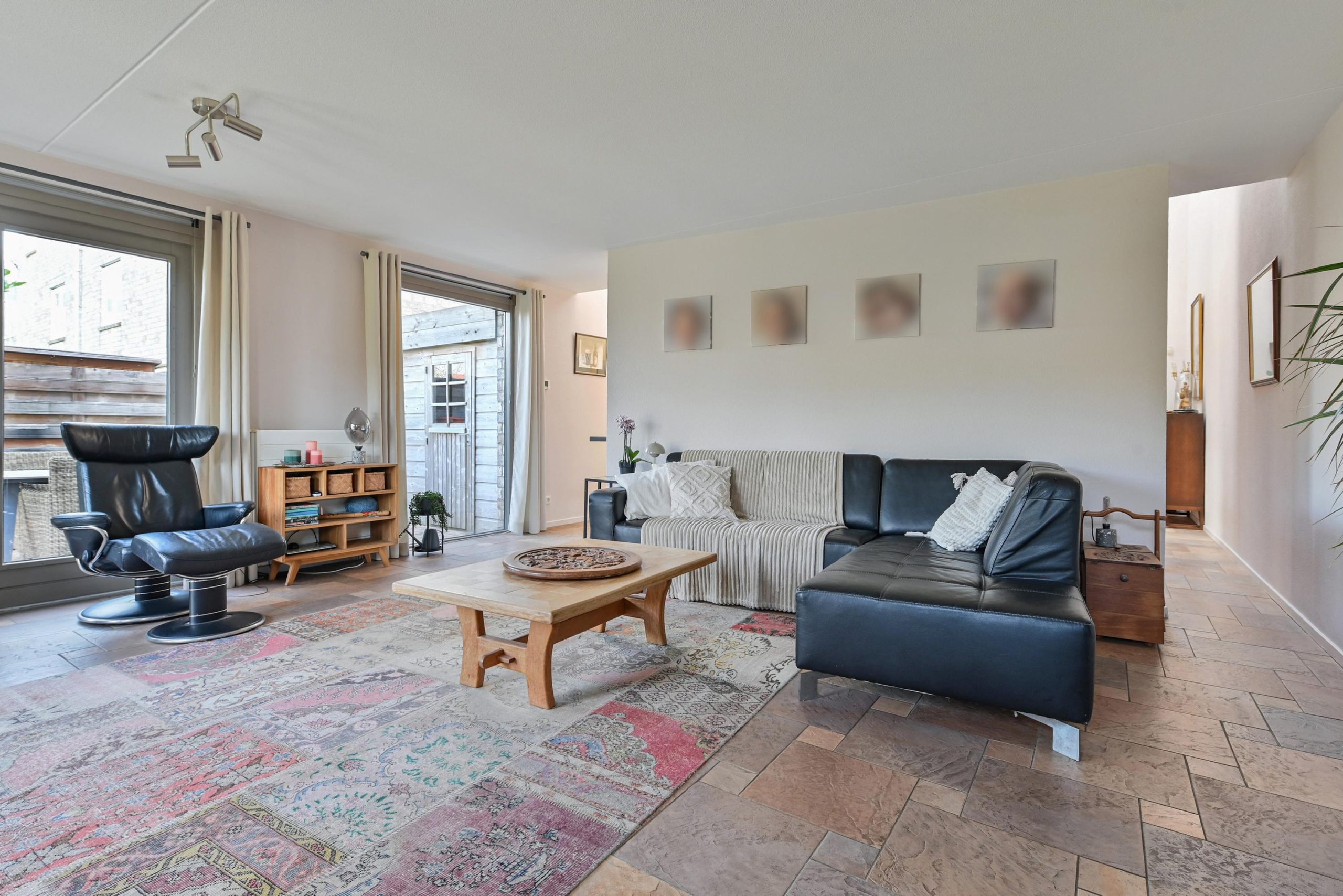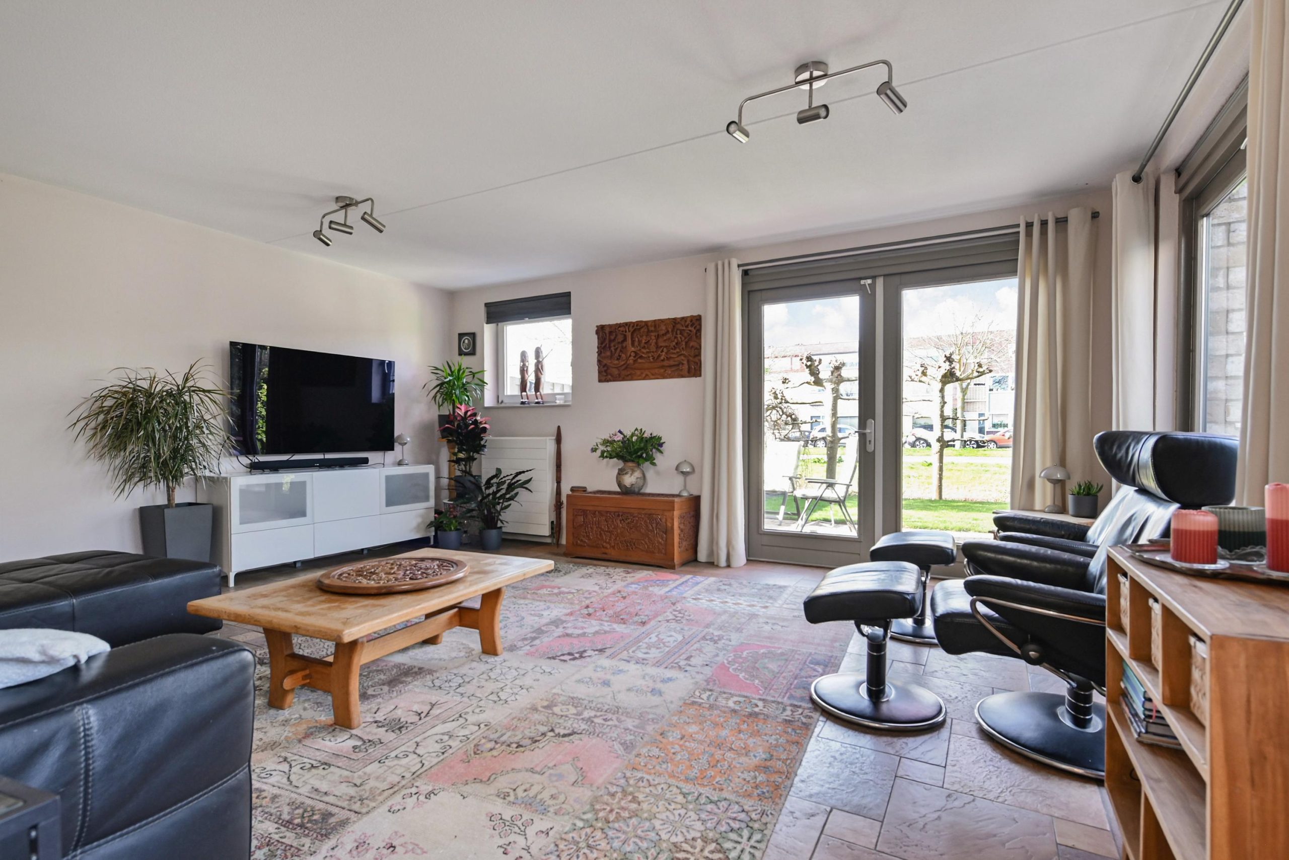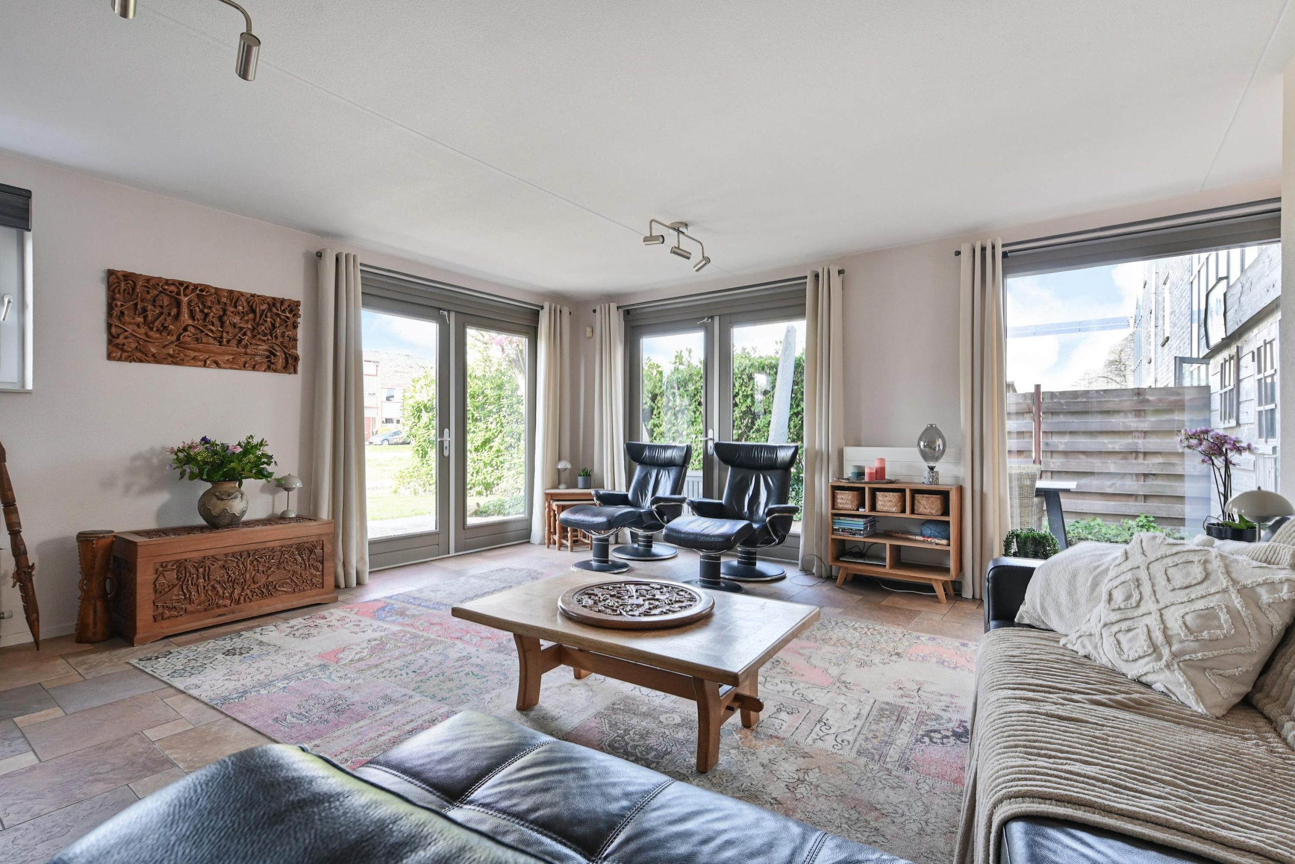 Aan de achterzijde bevindt zich de woonkamer met openslaande deuren naar de tuin, waardoor binnen en buiten op een natuurlijke manier in elkaar overlopen.
