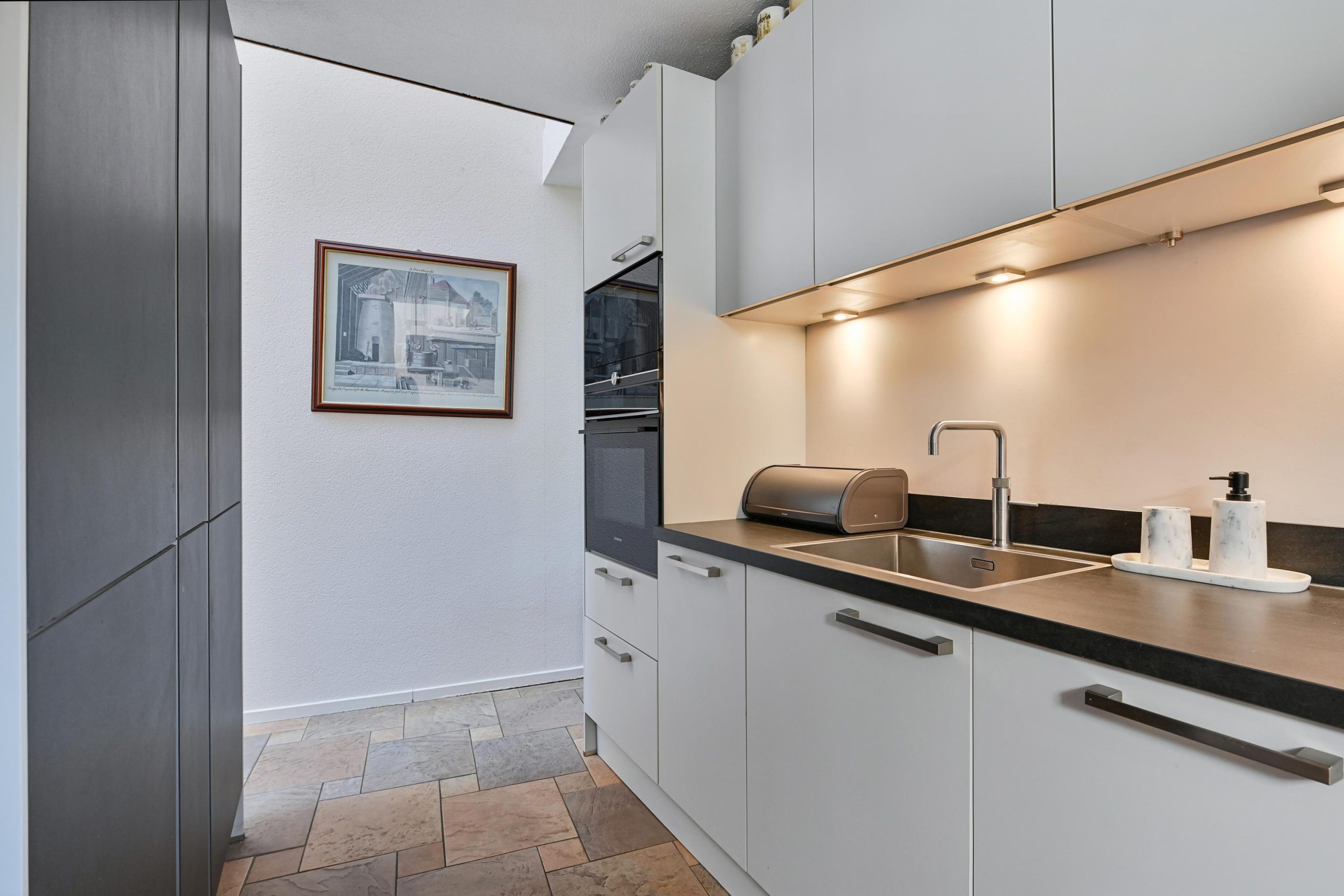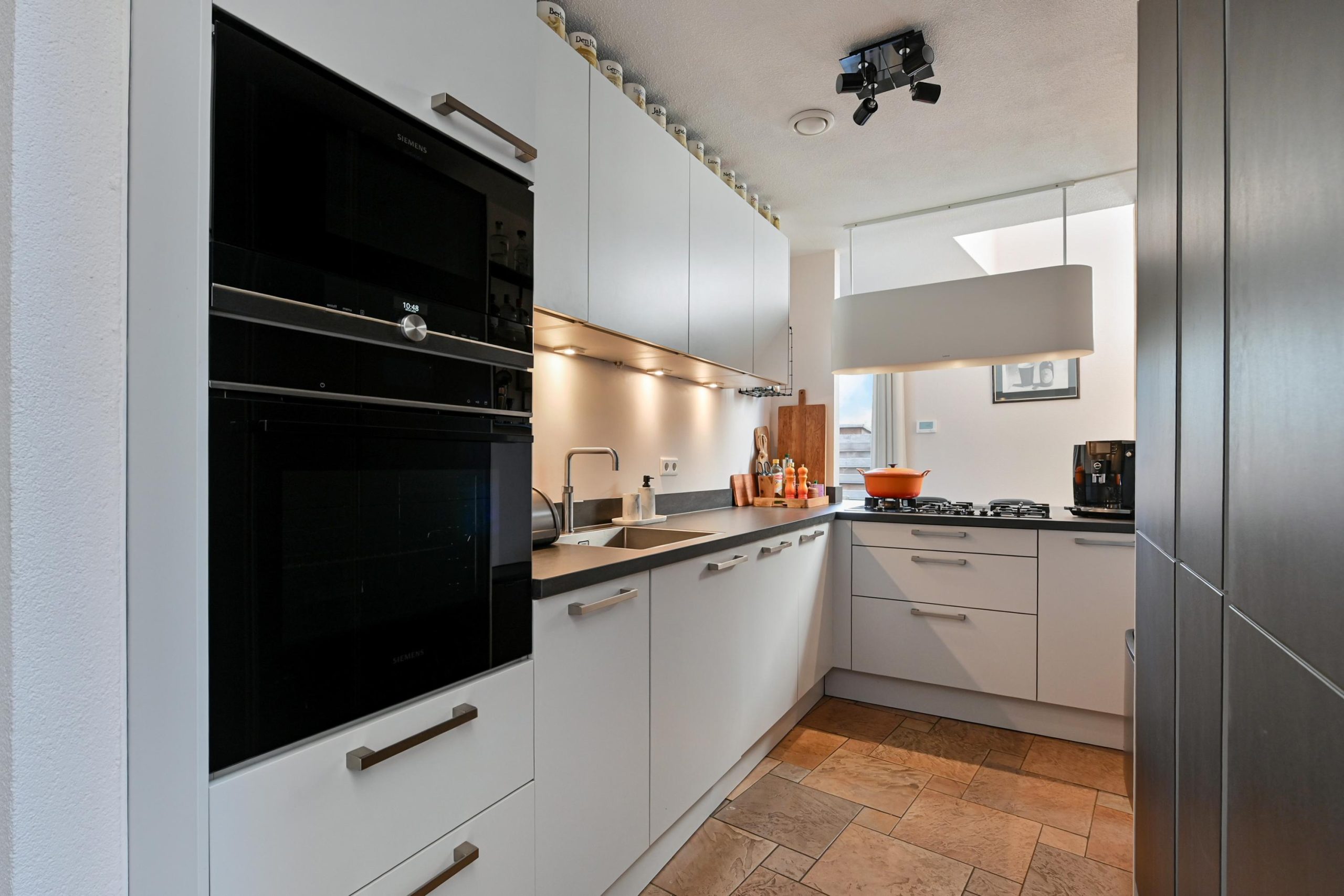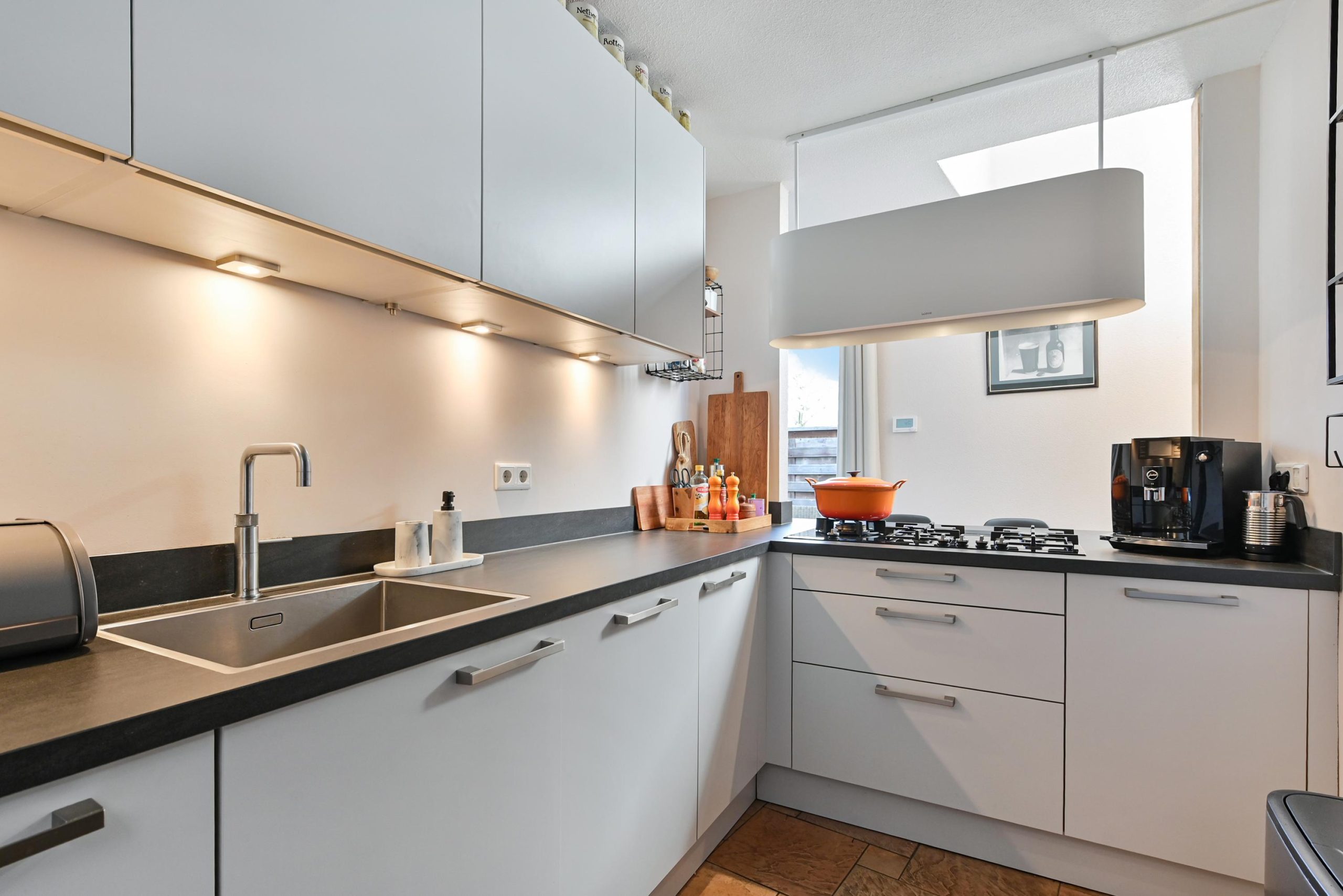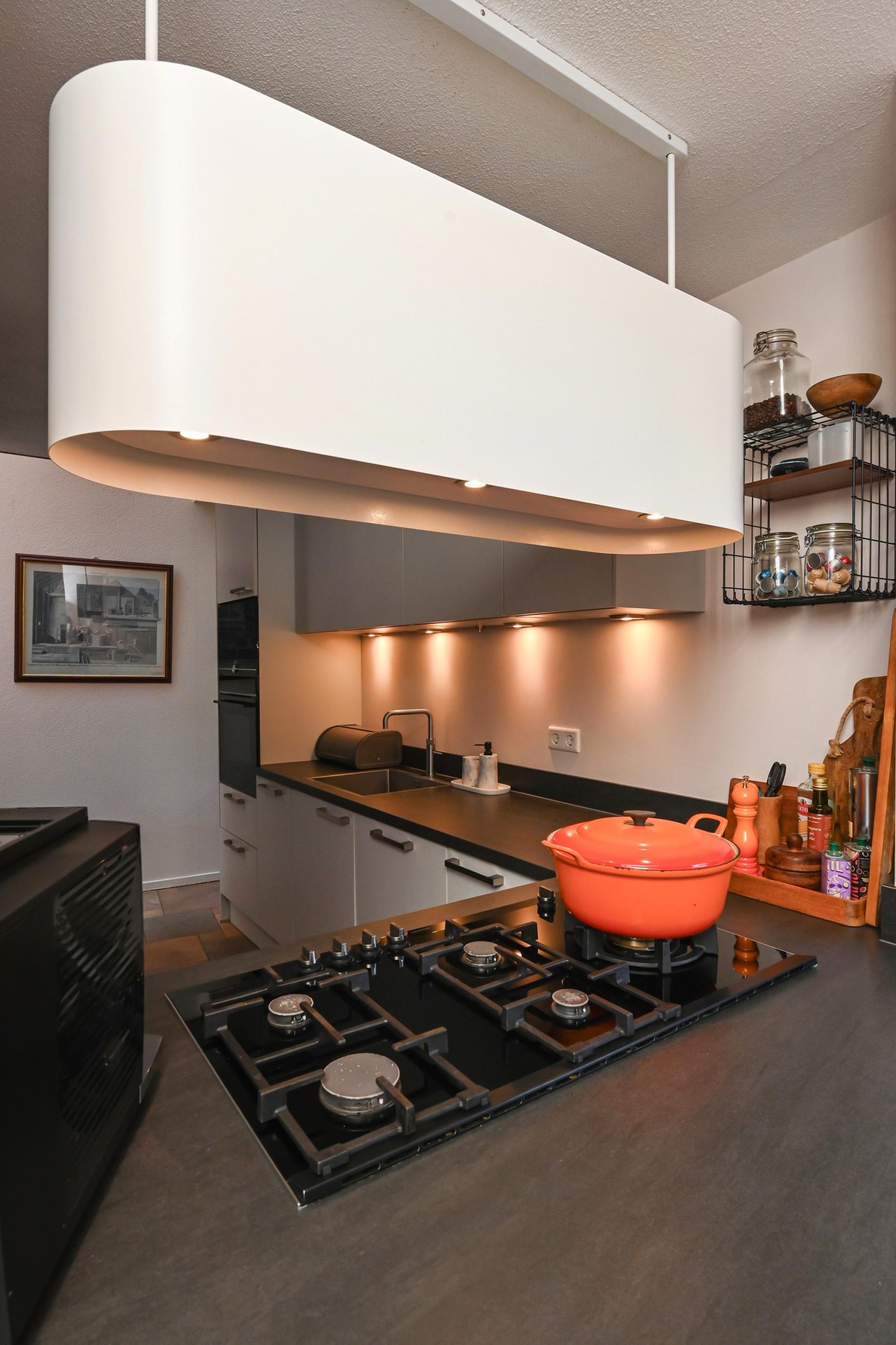 De keuken is centraal gepositioneerd en verbindt de eetkamer met de woonkamer. Deze is uitgevoerd met diverse inbouwapparatuur en praktisch ingedeeld.