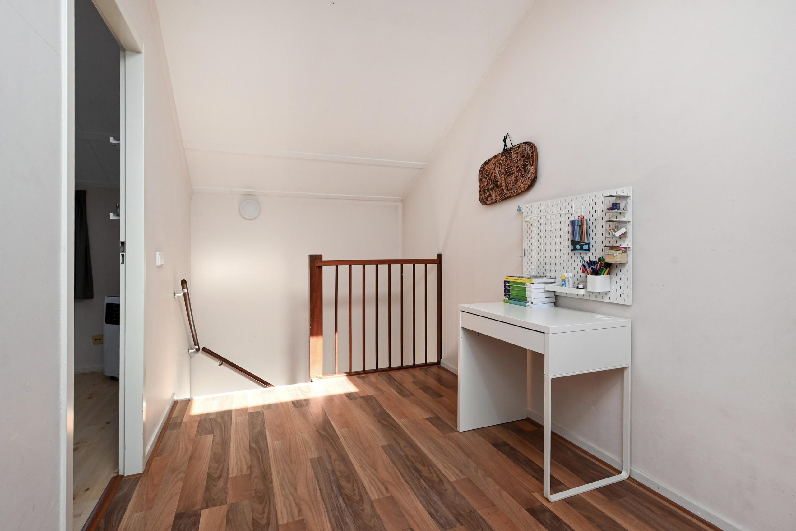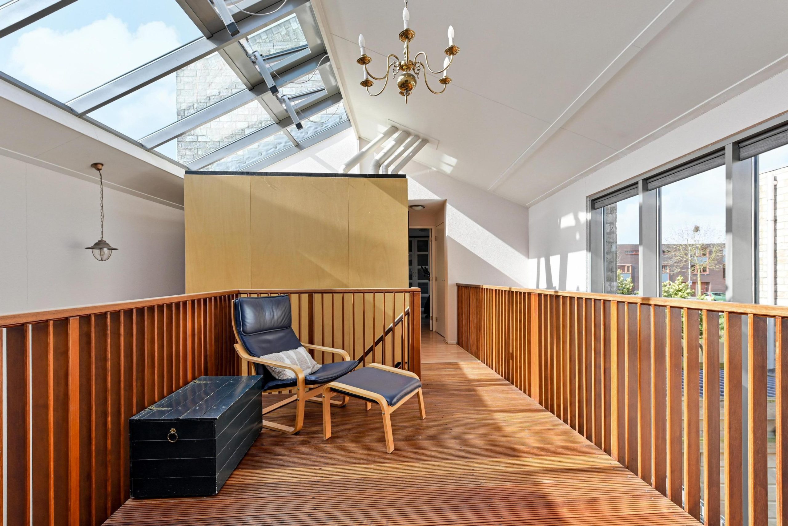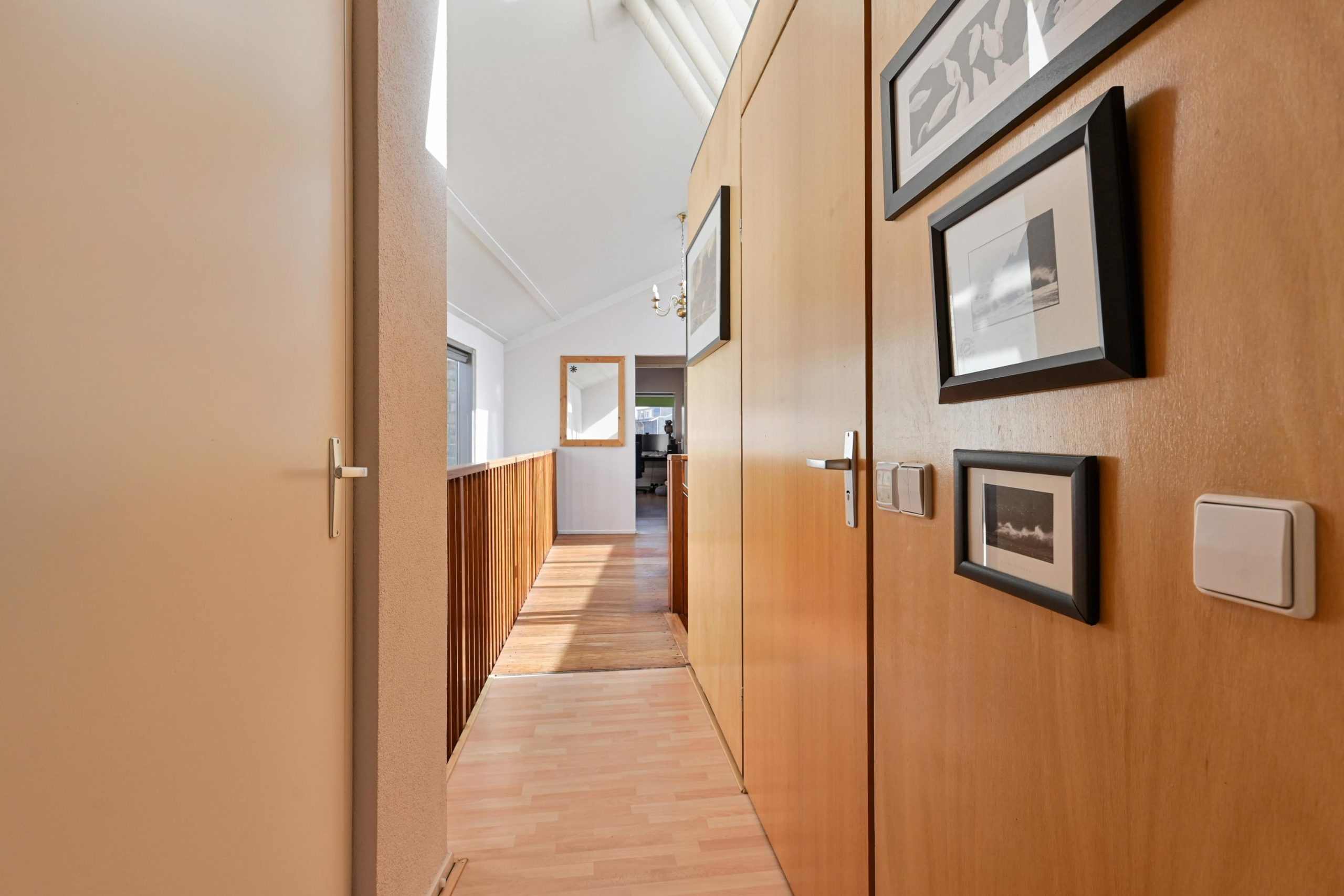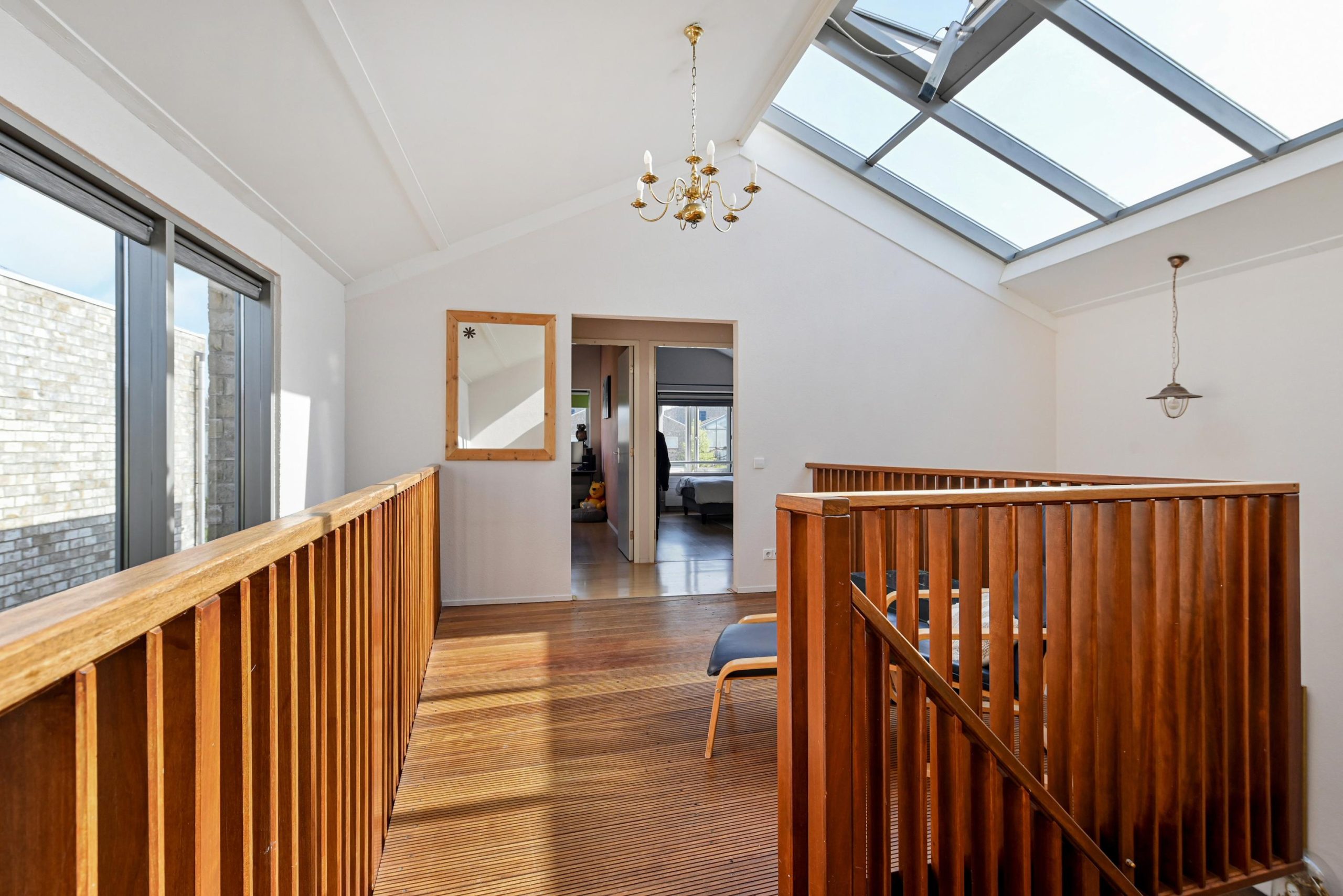 De overloop is uitgevoerd als open verbinding boven de eetkamer en biedt ruimte voor een werkplek of zitgedeelte.