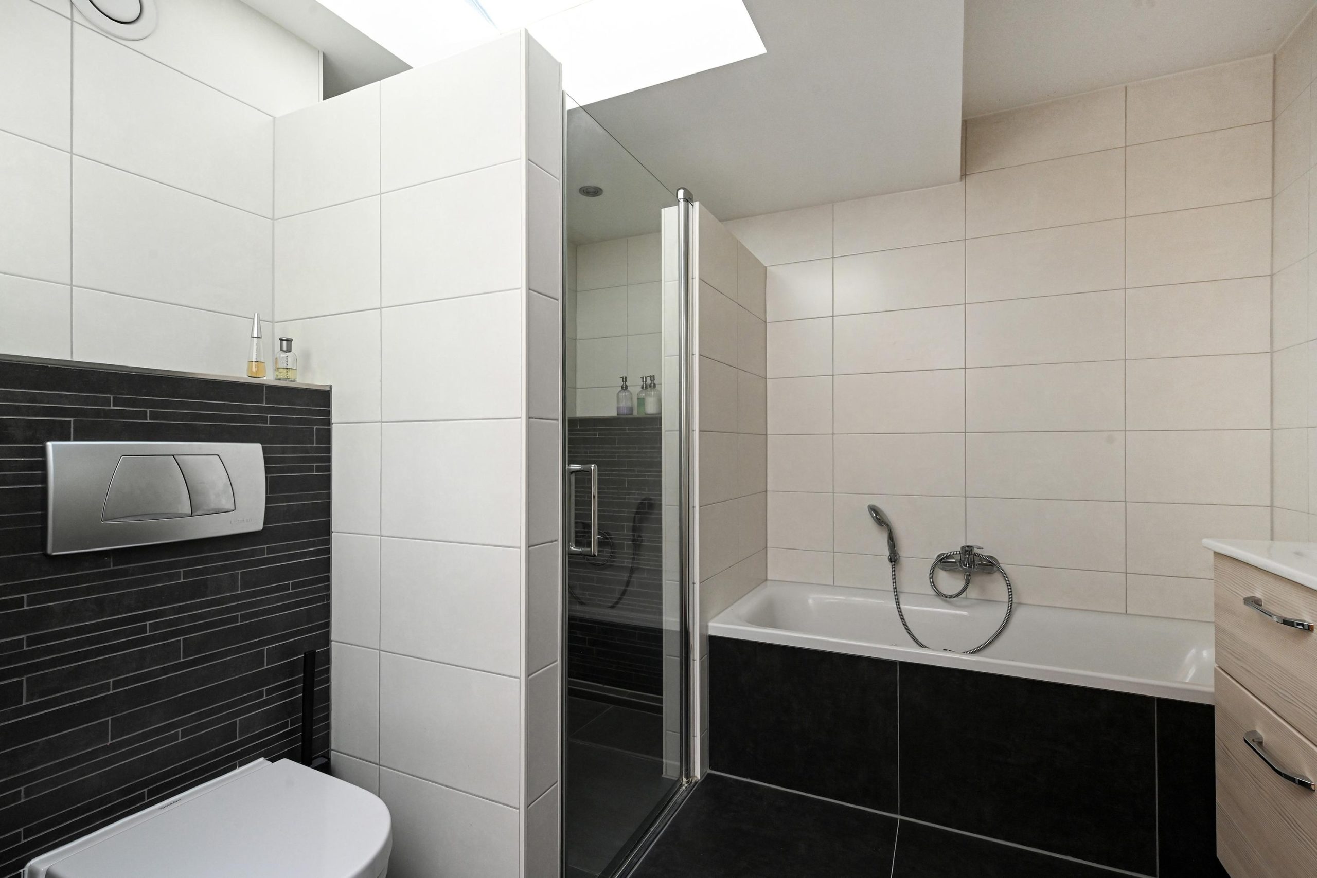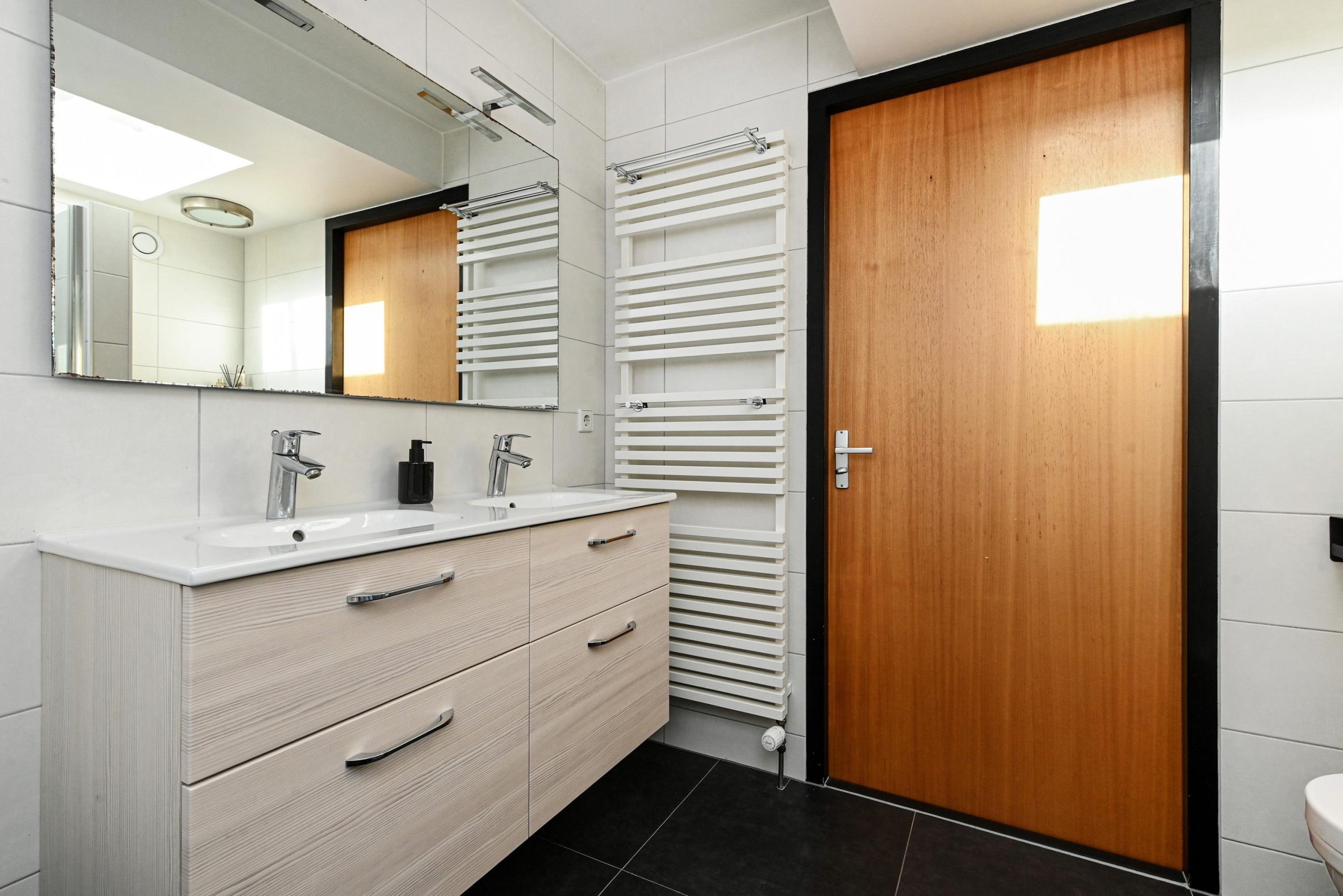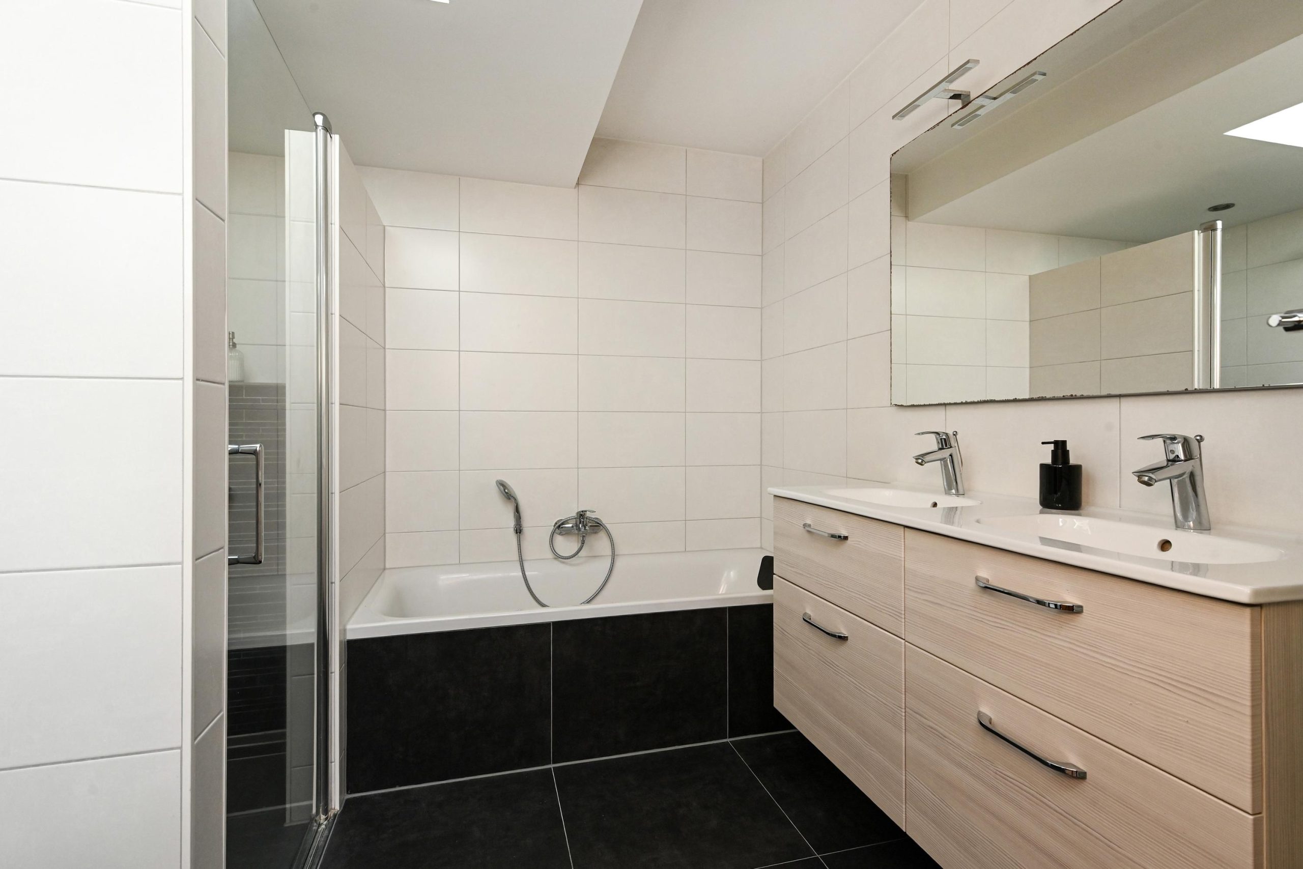 De ruime badkamer is compleet uitgevoerd met dubbele wastafel, ligbad, douche en toilet, en beschikt over een dakvenster voor daglichttoetreding.