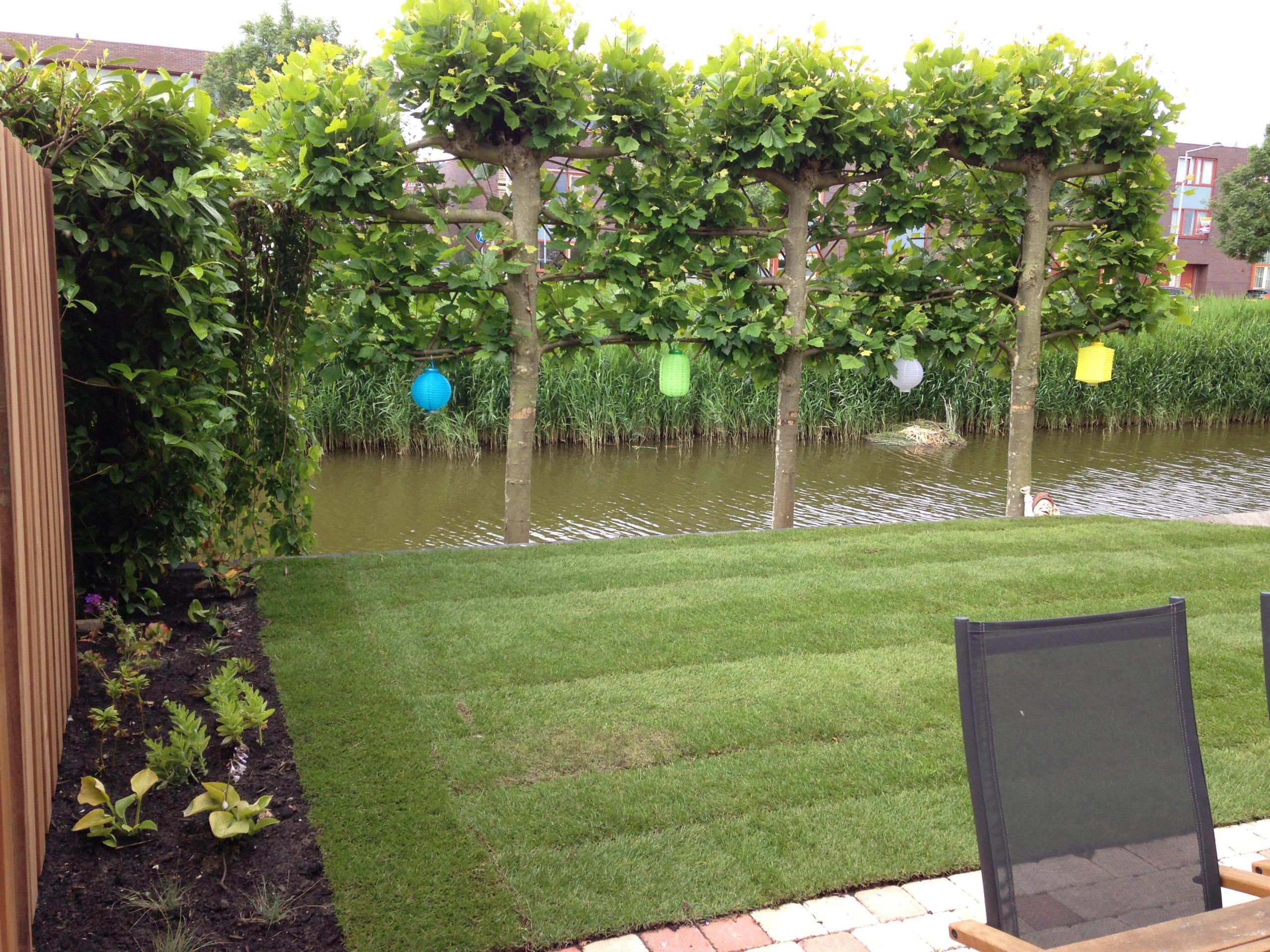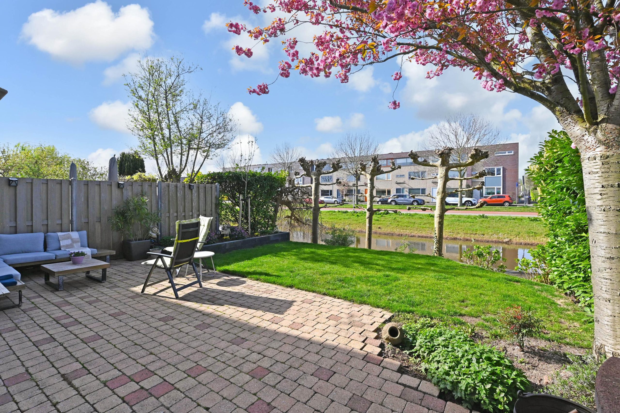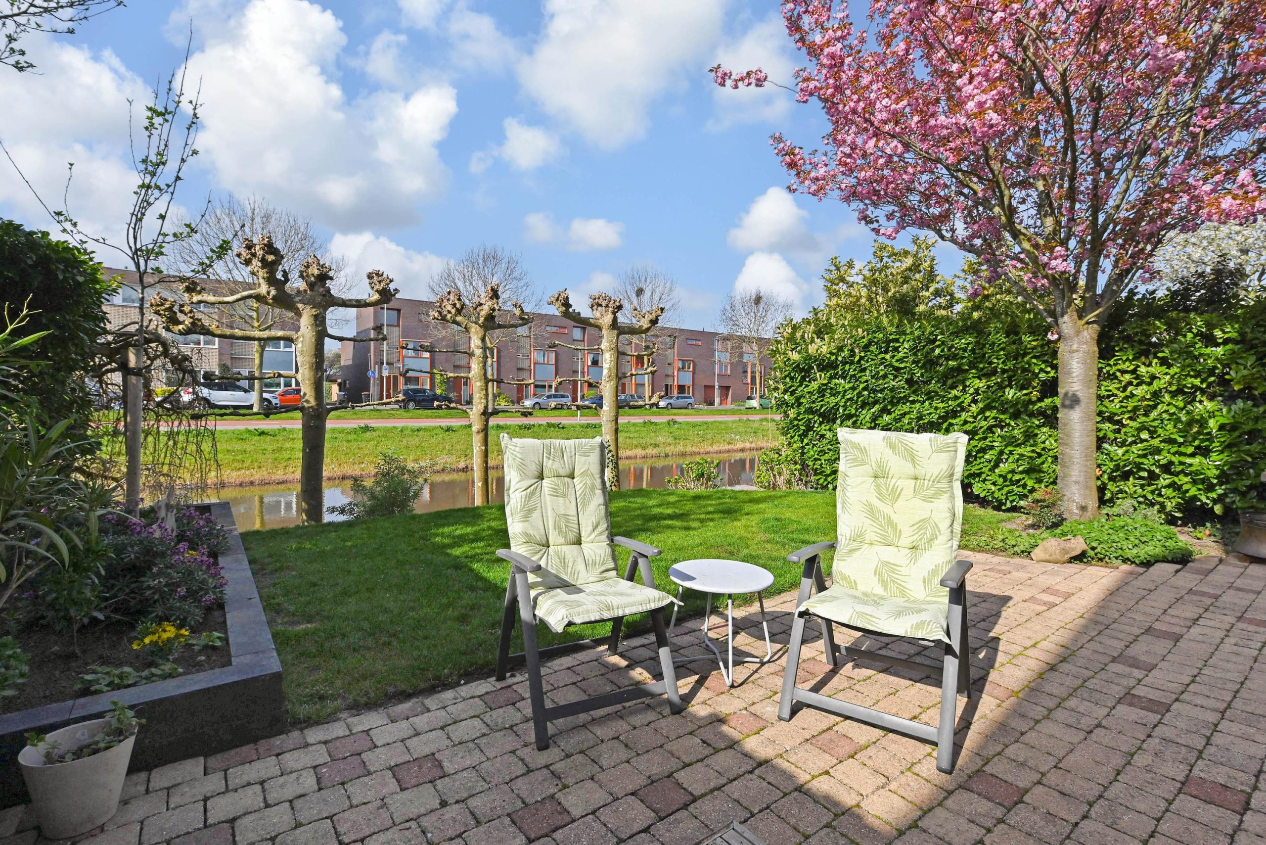 De achtertuin is gunstig gelegen op het zuidwesten en grenst direct aan het water. Hierdoor is er sprake van een prettige bezonning gedurende de hele dag.