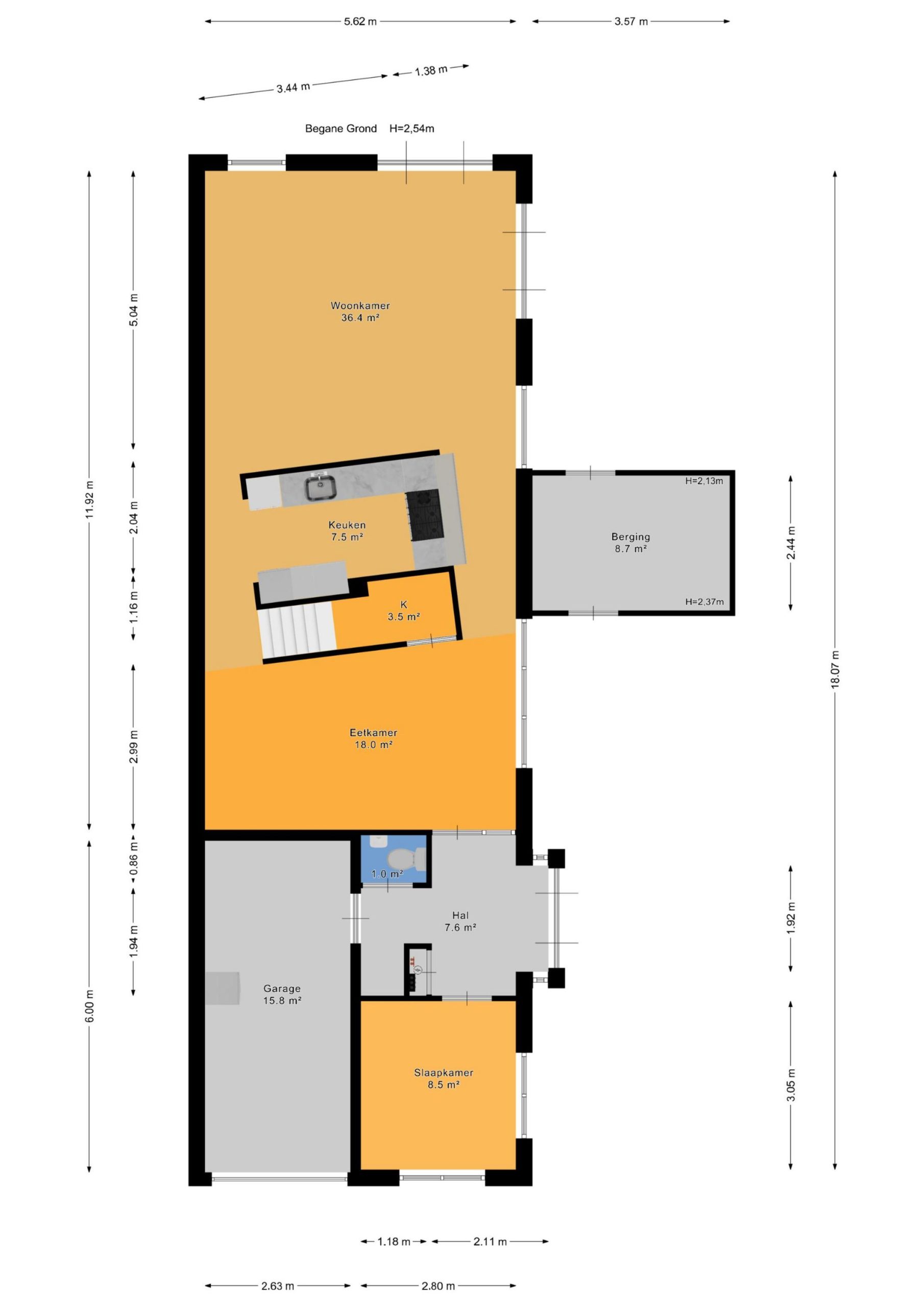 Via de voortuin bereikt u de entree met dubbele voordeur. De ruime hal is voorzien van een garderobenis, modern toilet en biedt toegang tot de slaapkamer welke nu in gebruik is als werkkamer aan de voorzijde en de inpandige garage.