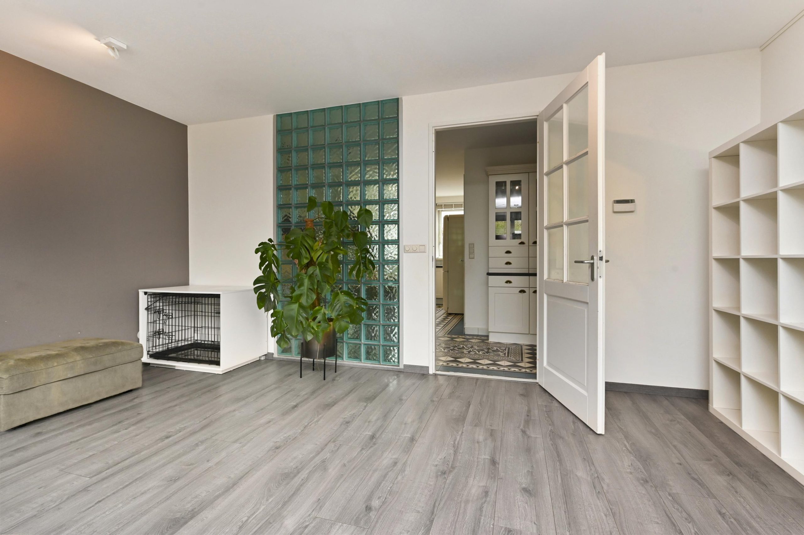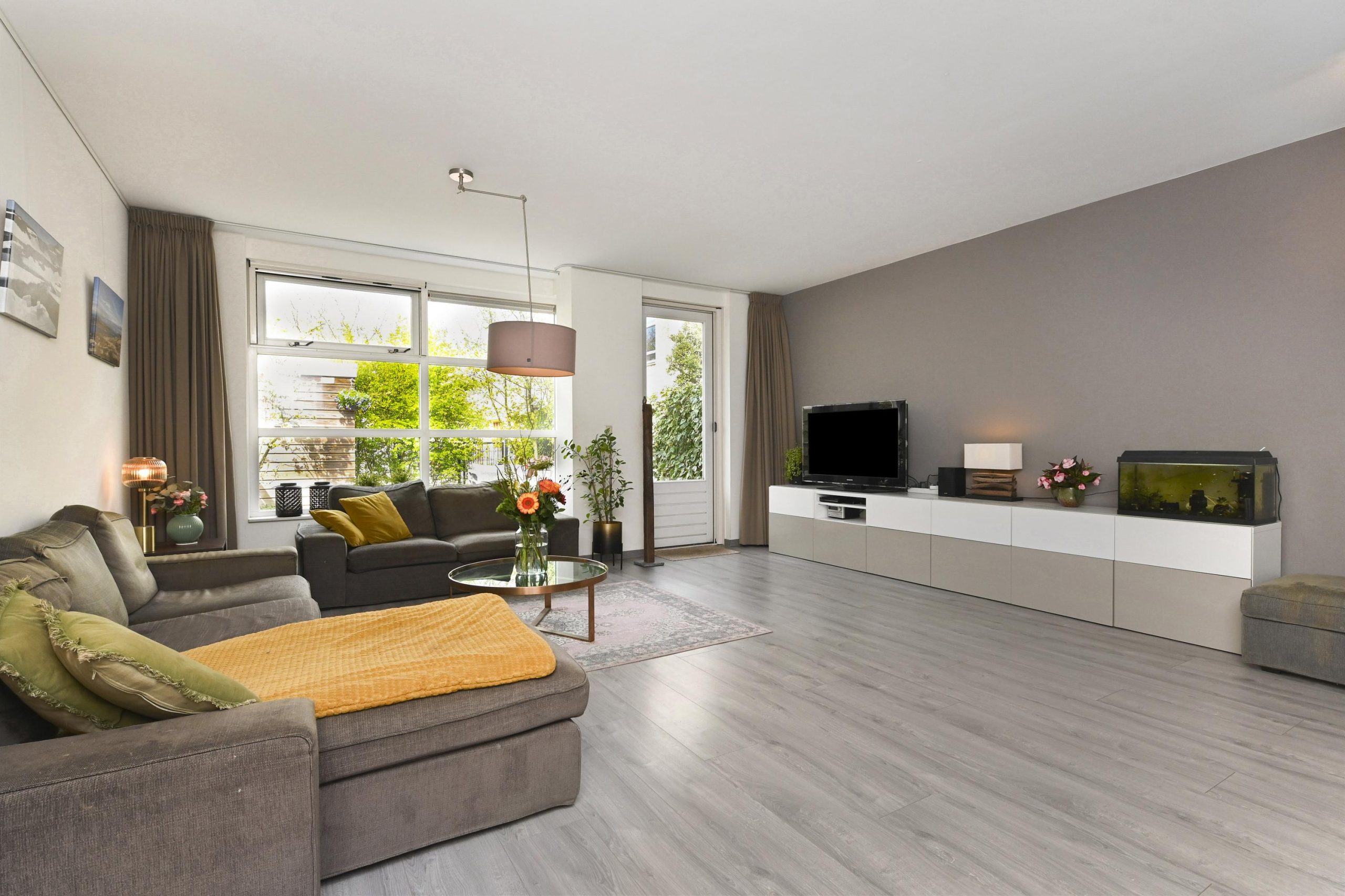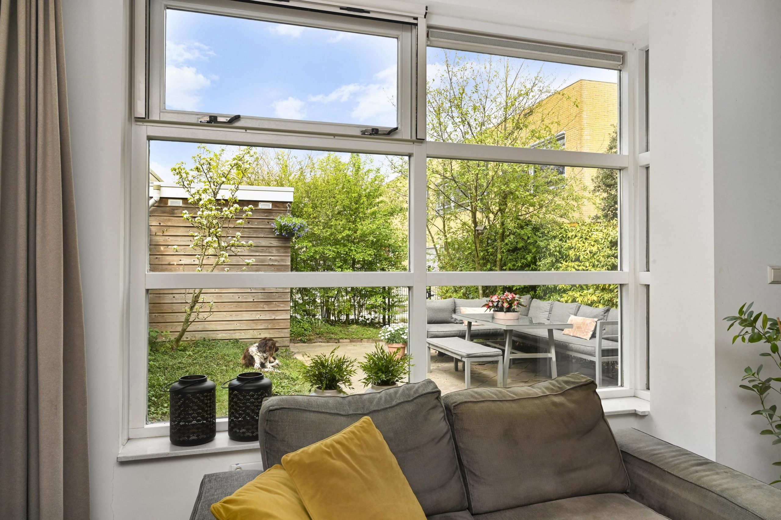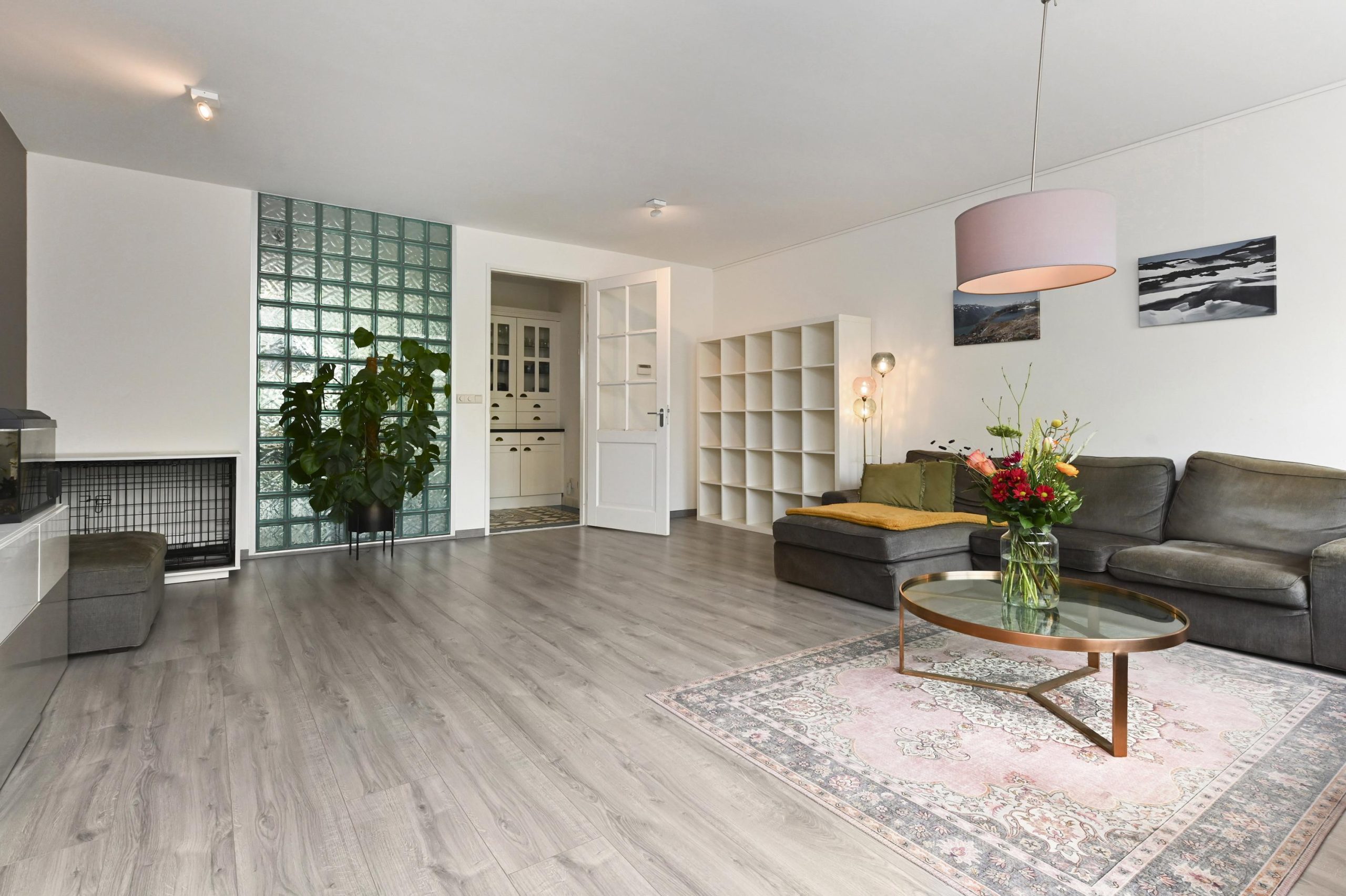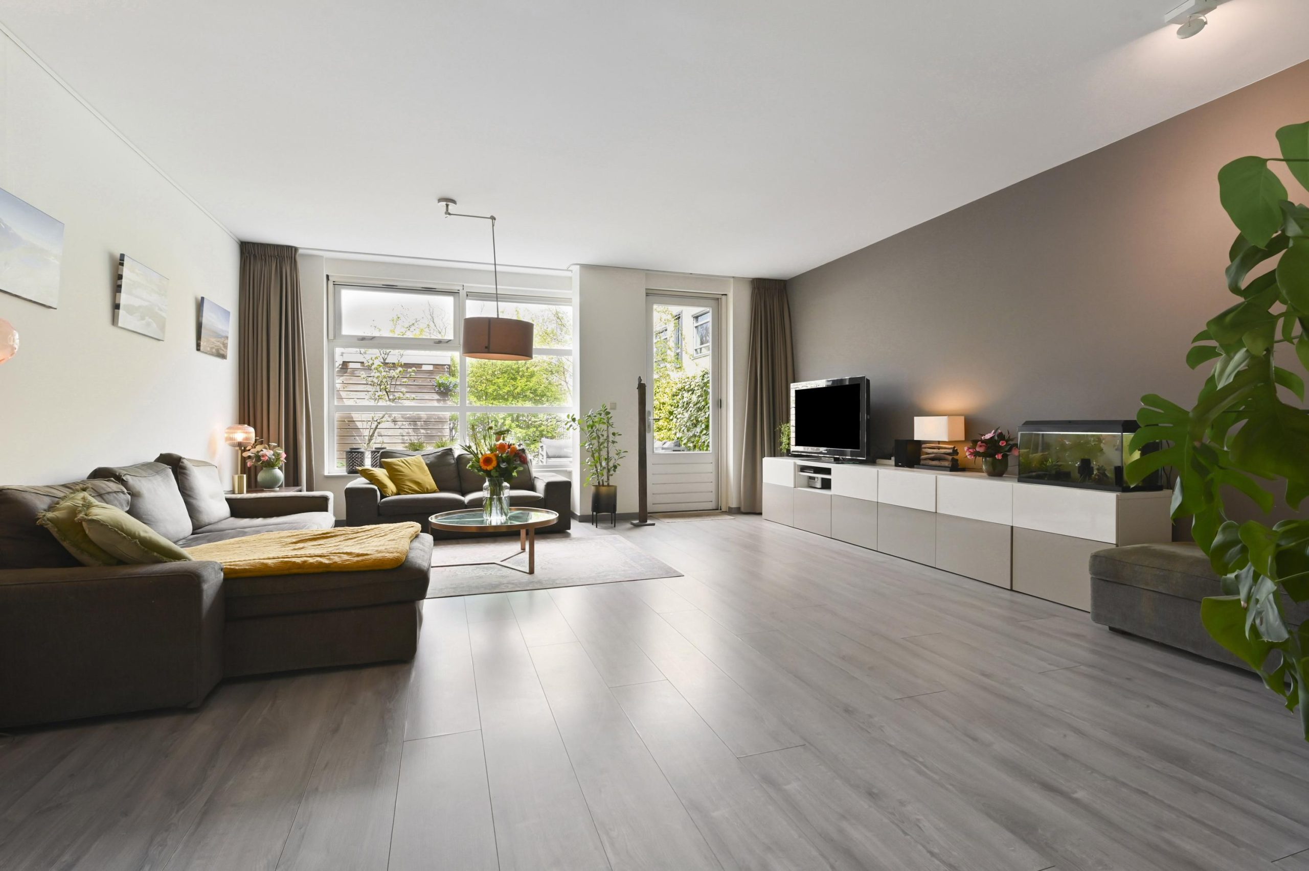 De keuken is middels een glazen wand afgescheiden van de uitgebouwde woonkamer van circa 34,5 m². Deze lichte woonruimte kenmerkt zich door de grote raampartijen en biedt directe toegang tot de achtertuin.