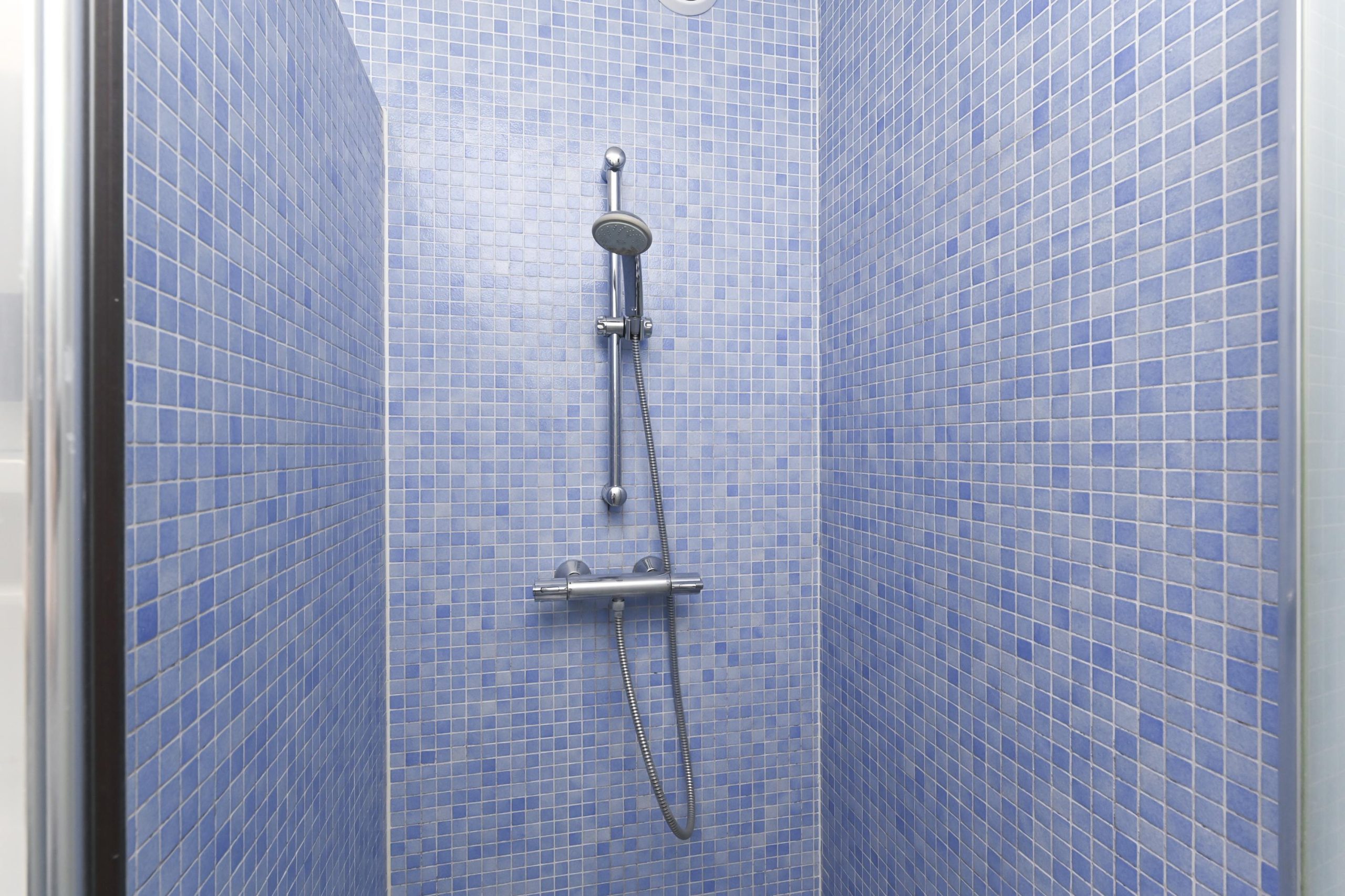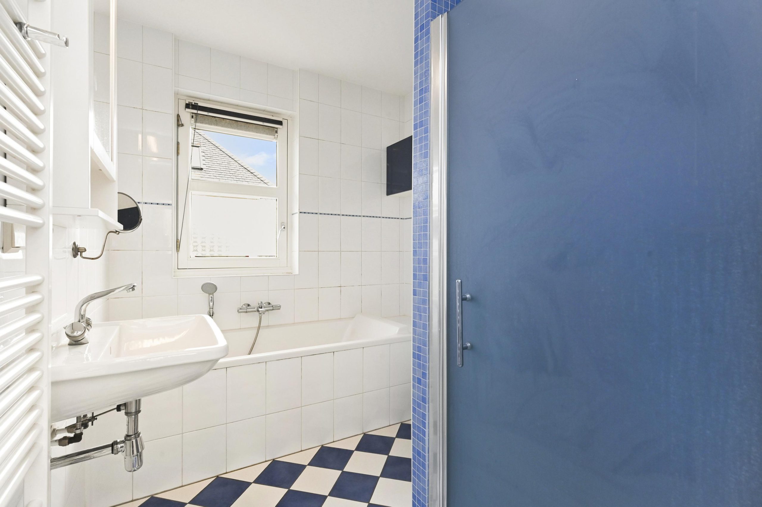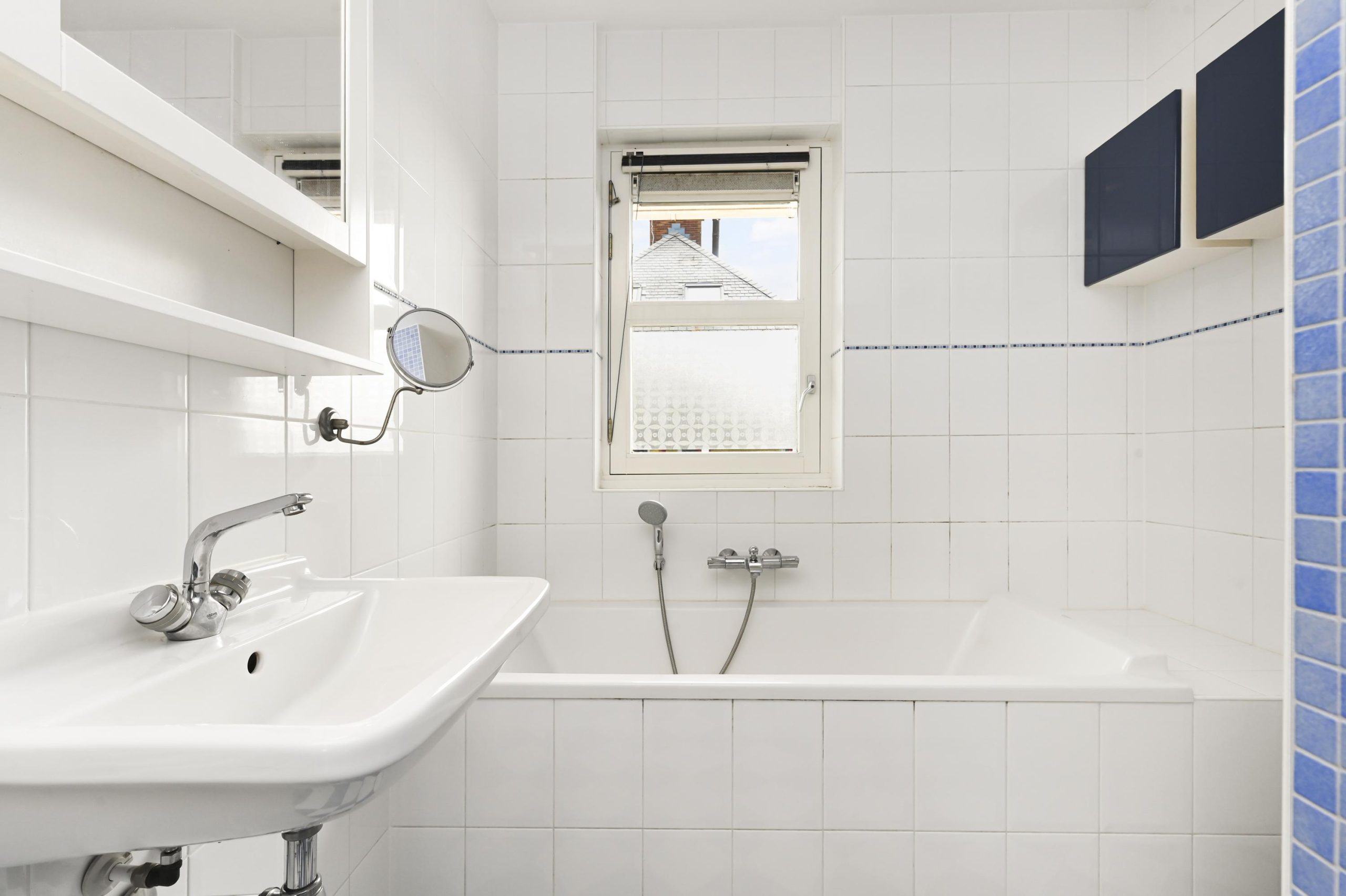 The neat bathroom is fitted with a bathtub, walk-in shower, second toilet, washbasin, towel radiator, and a window for natural ventilation and daylight.