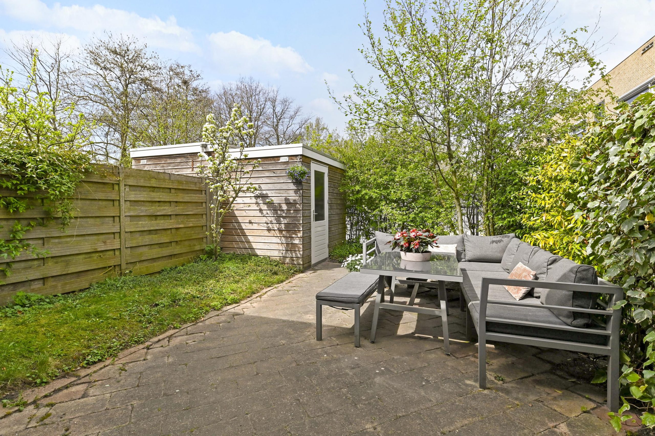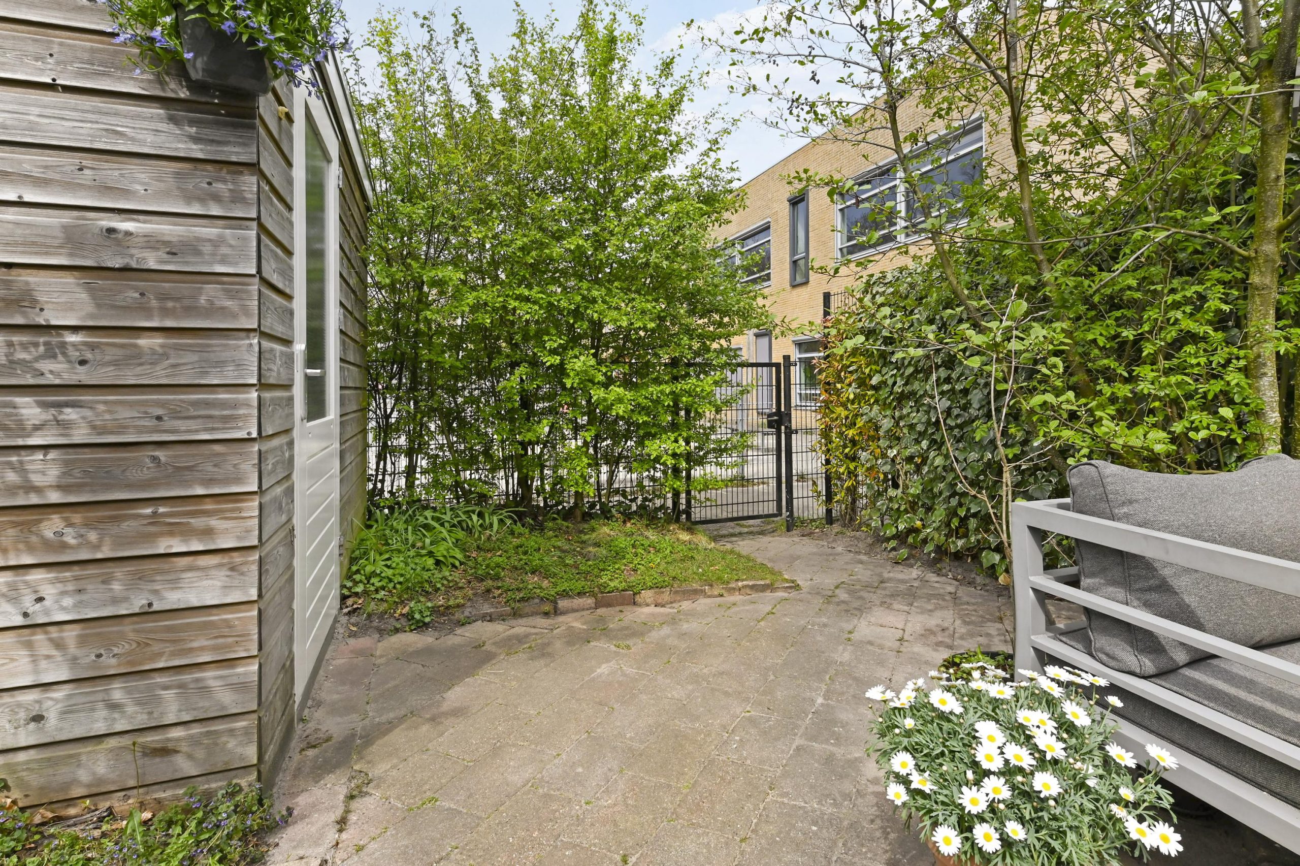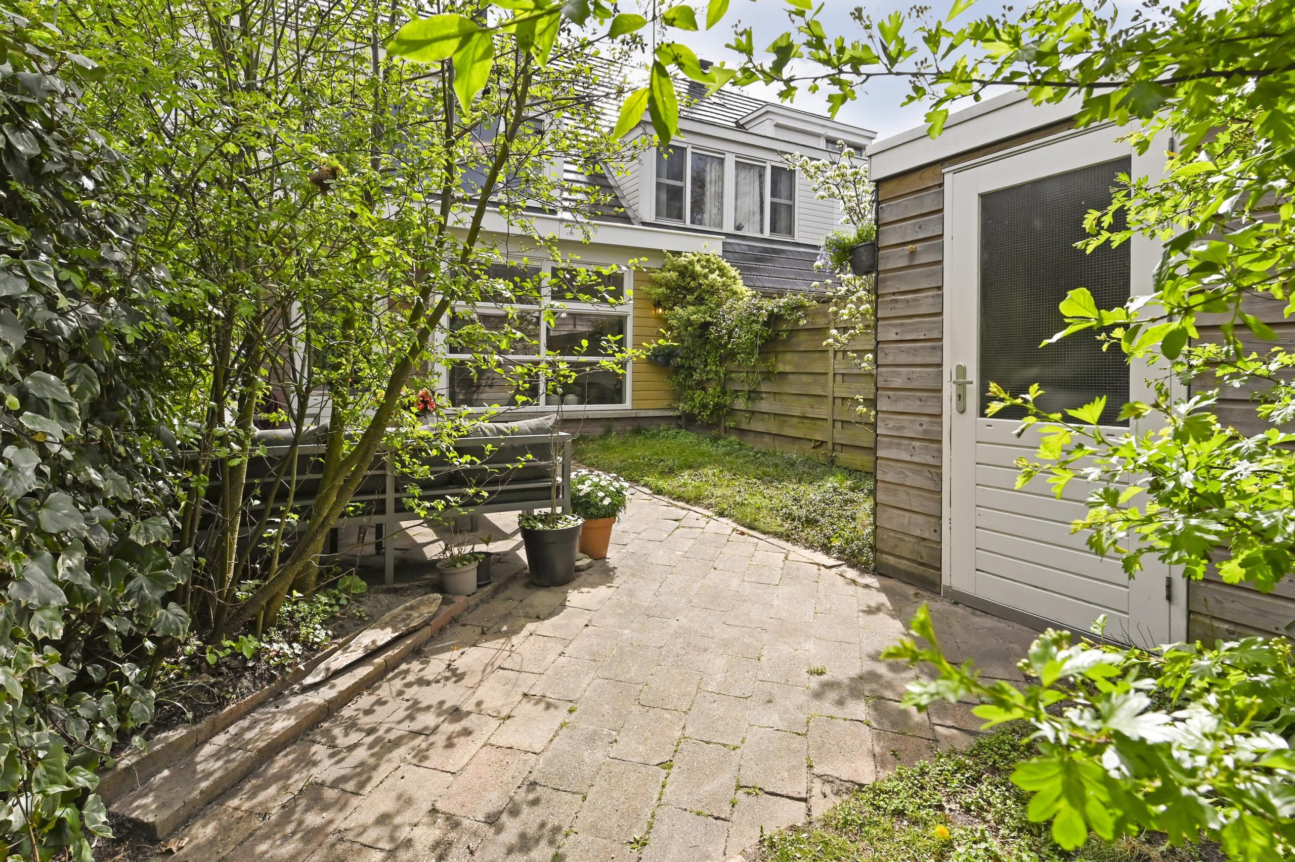 De zonnige achtertuin beschikt over een houten berging en een achterom en is gunstig gelegen op de middag- en avondzon. Vanuit de tuin is er direct toegang tot het achtergelegen schoolplein.
