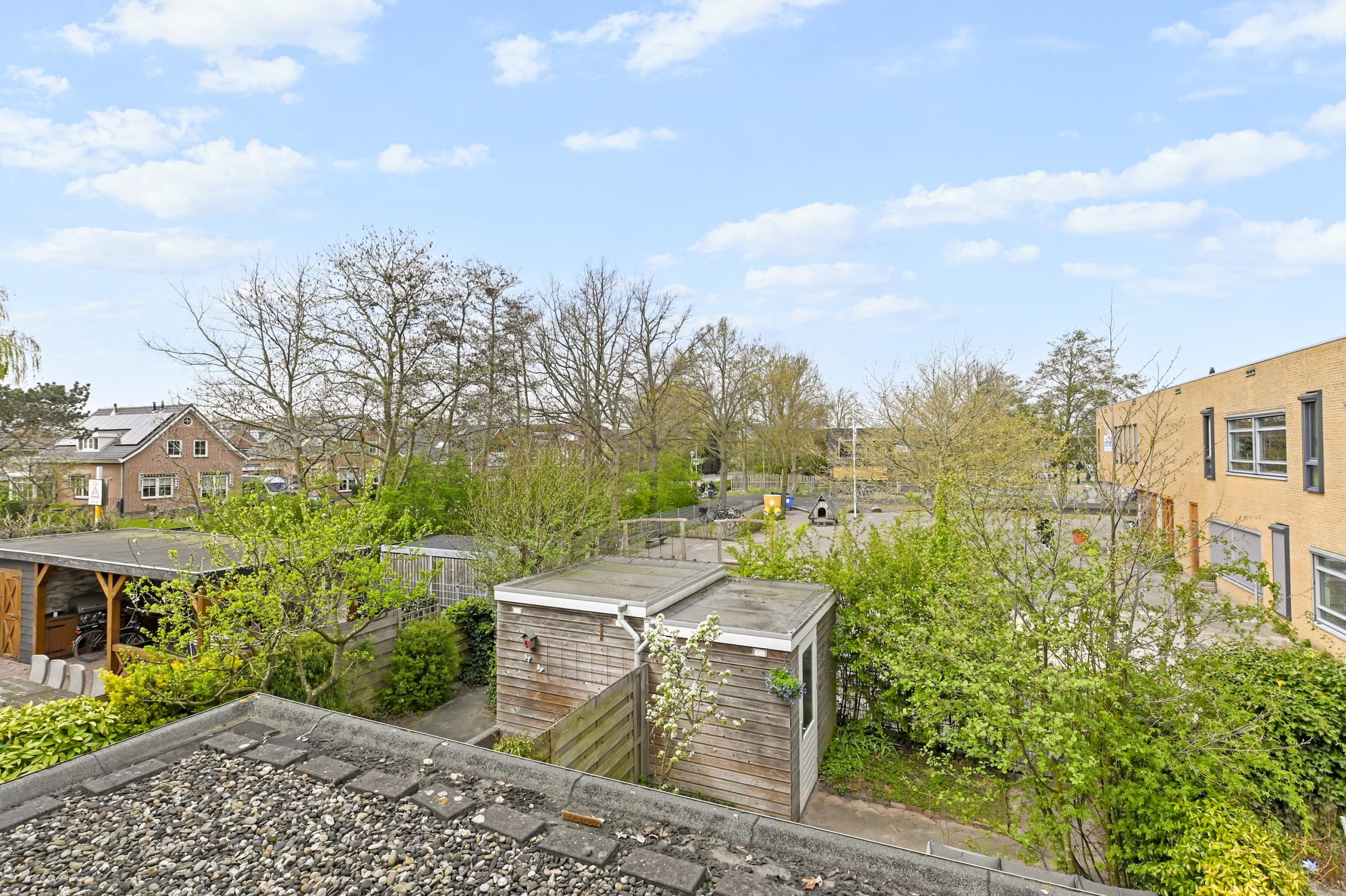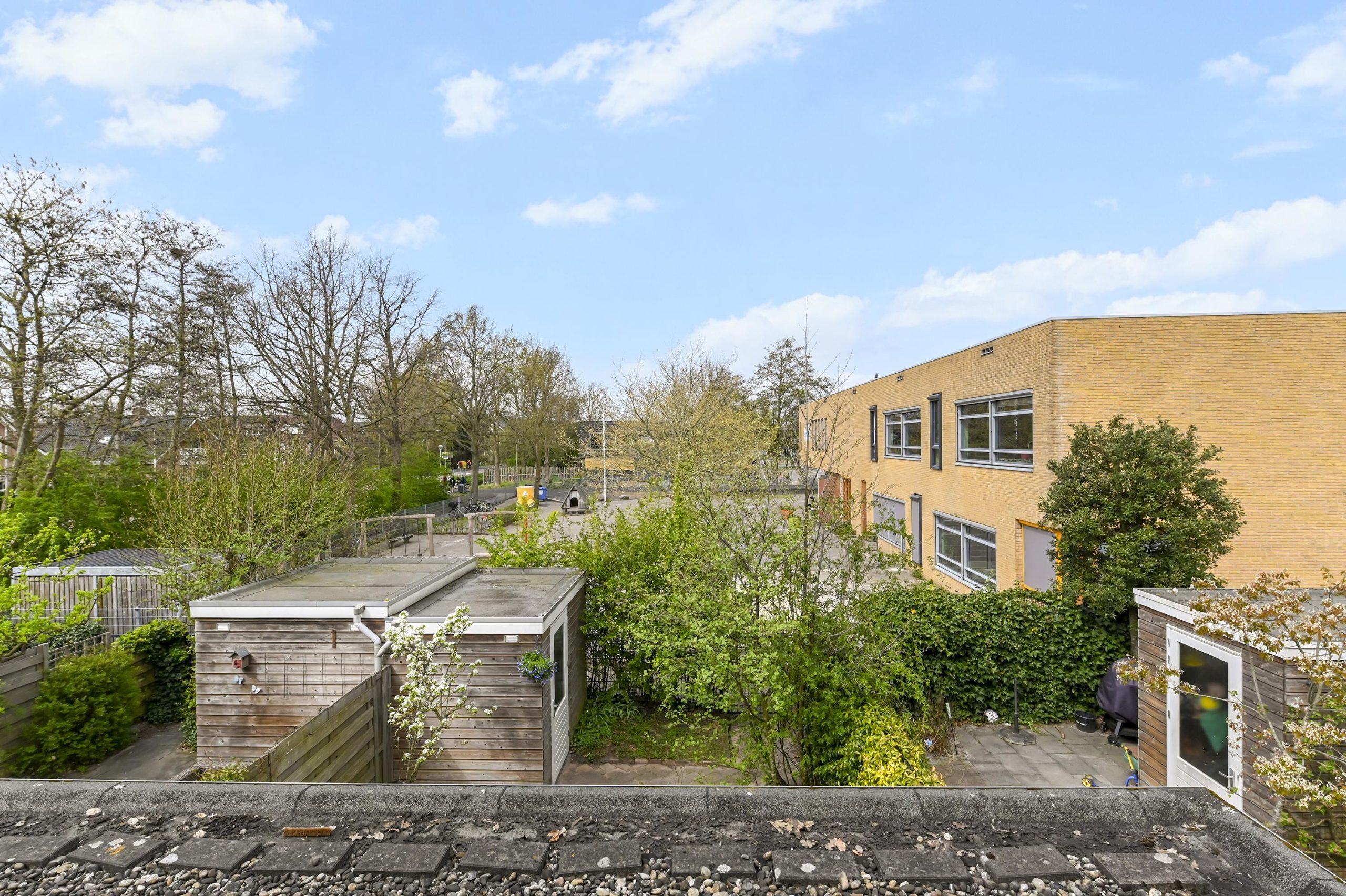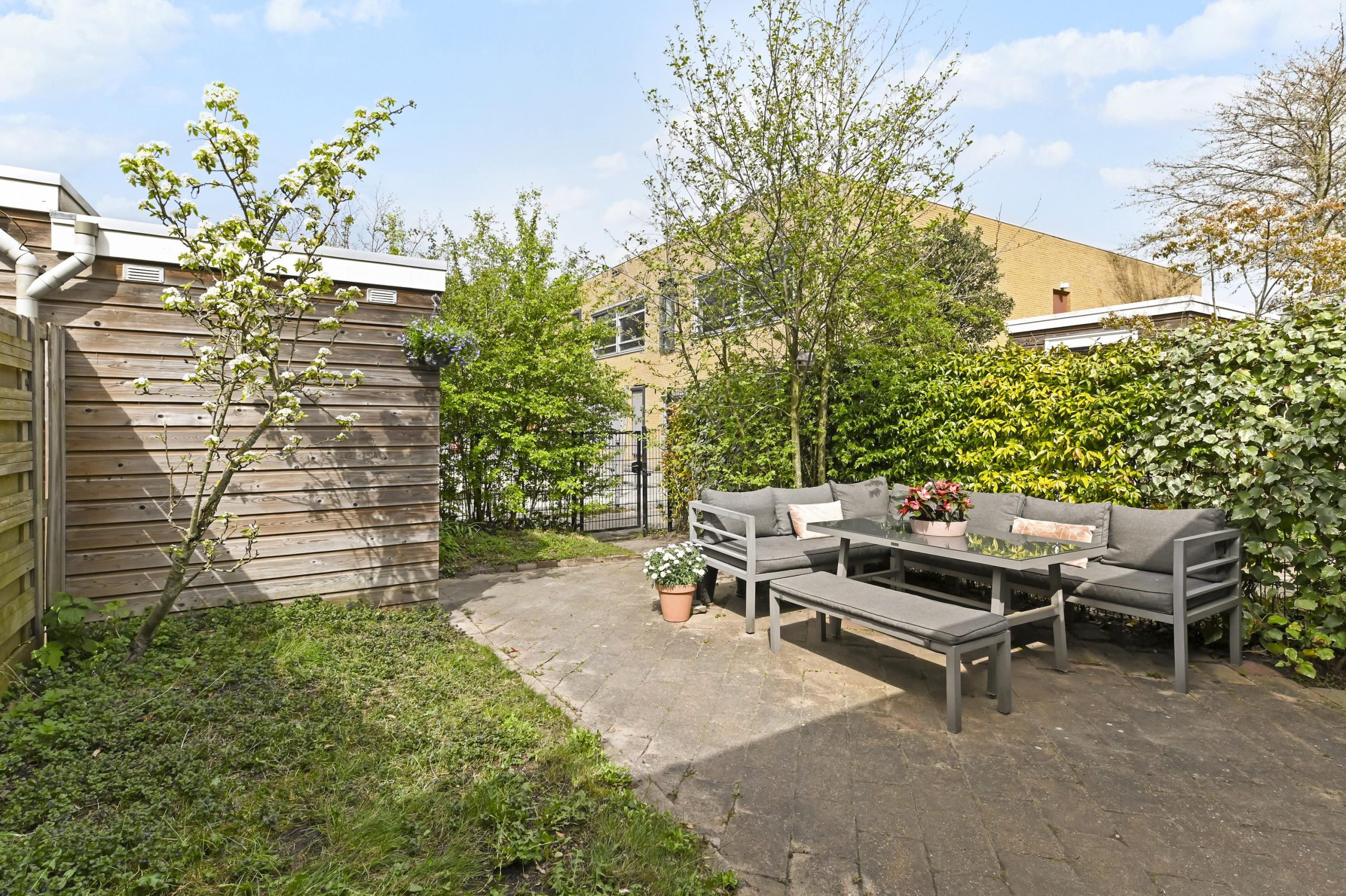De zonnige achtertuin beschikt over een houten berging en een achterom en is gunstig gelegen op de middag- en avondzon. Vanuit de tuin is er direct toegang tot het achtergelegen schoolplein.