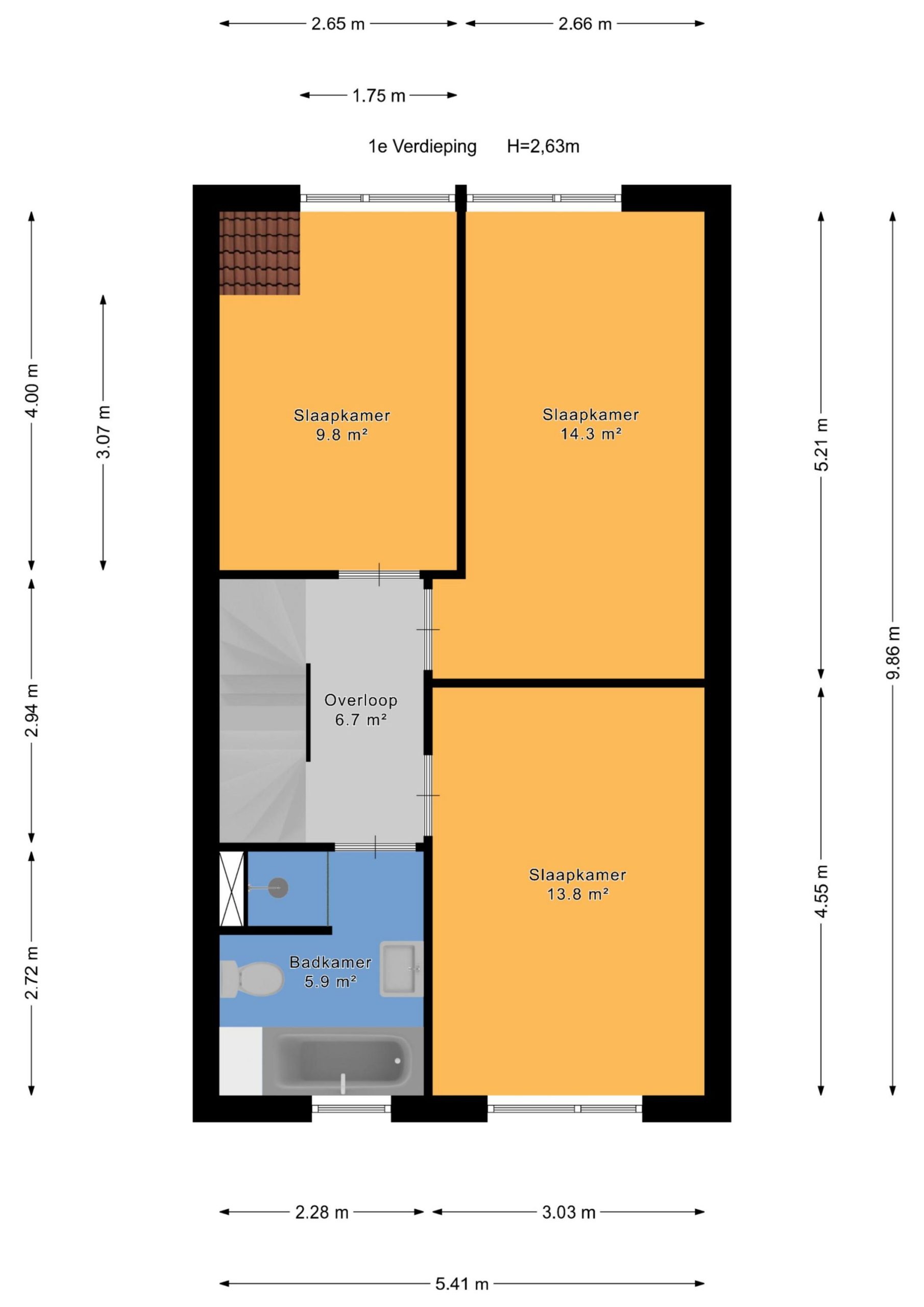 Aan de voorzijde bevindt zich de eerste slaapkamer (ca. 4.55 x 3.05 m). Aan de achterzijde liggen de tweede en derde slaapkamer (ca. 5.20 x 2.65 m en 4.00 x 2.65 m).
