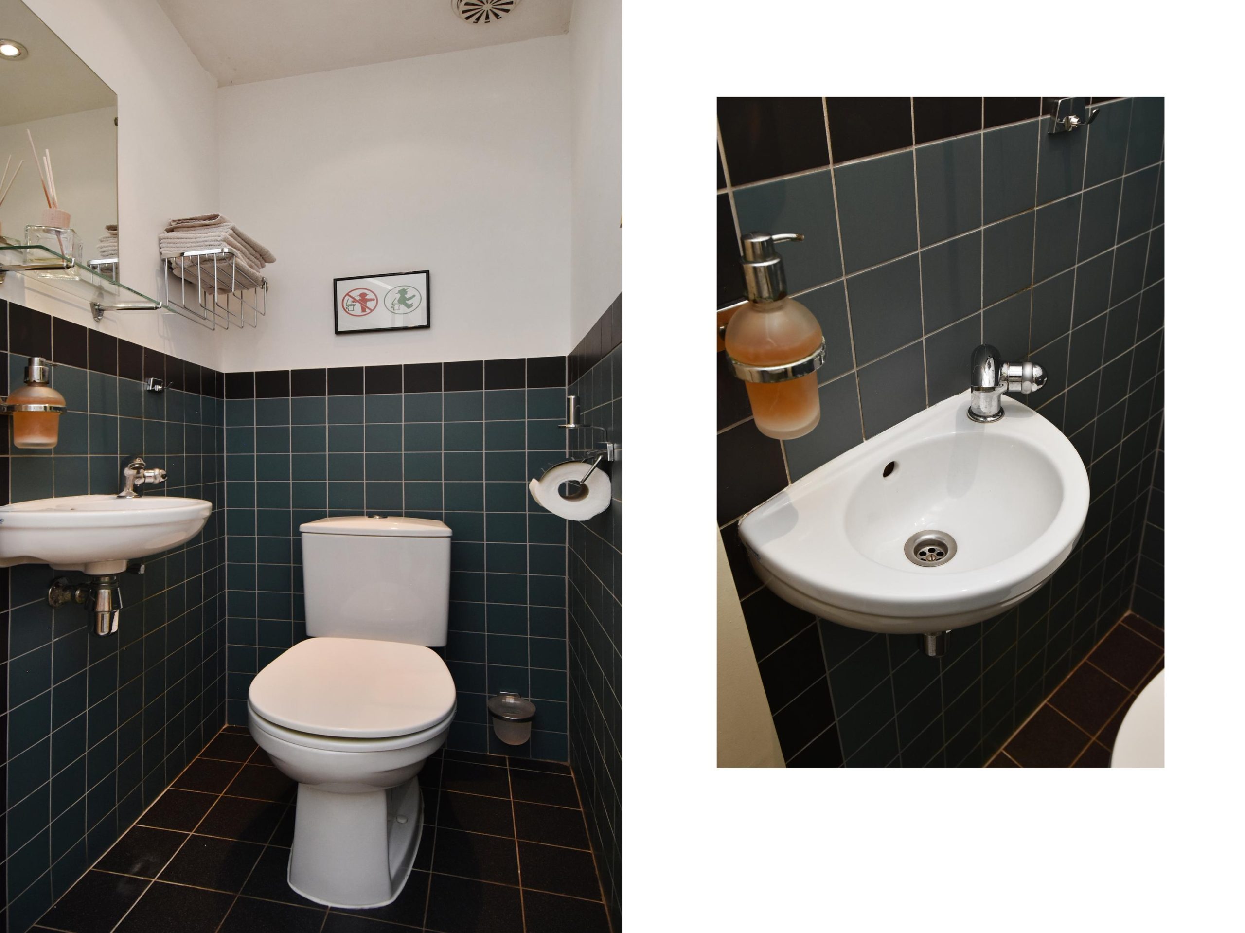 Voortuin, entree woning, vestibule, gang met modern toilet.