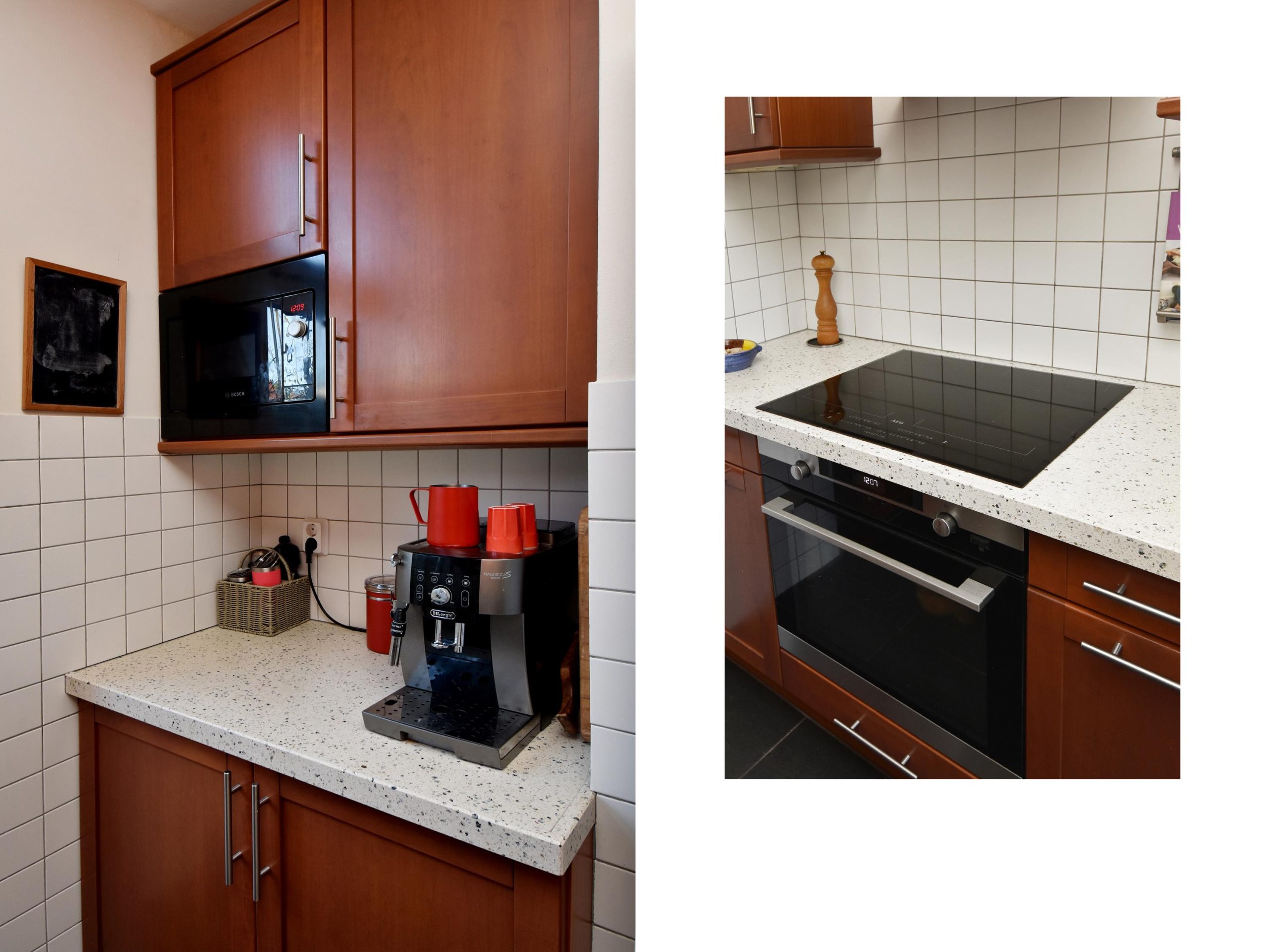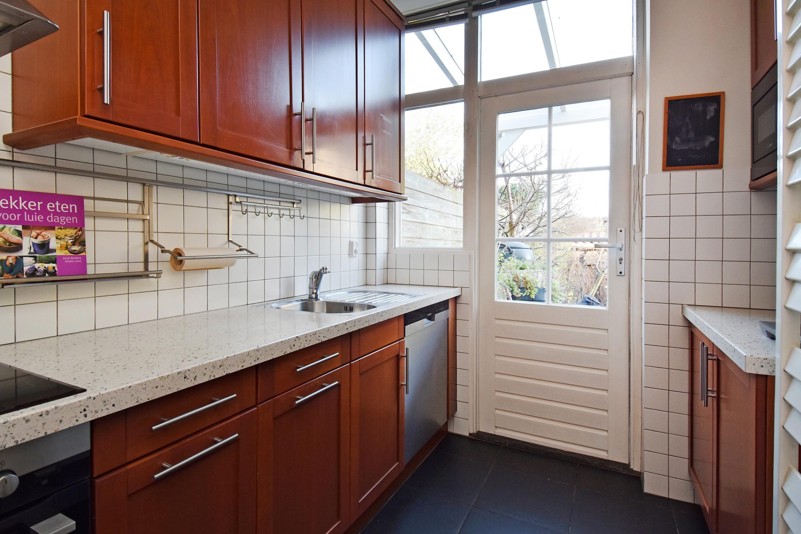 Moderne, half open keuken met diverse inbouwapparatuur en eveneens deur naar tuin.