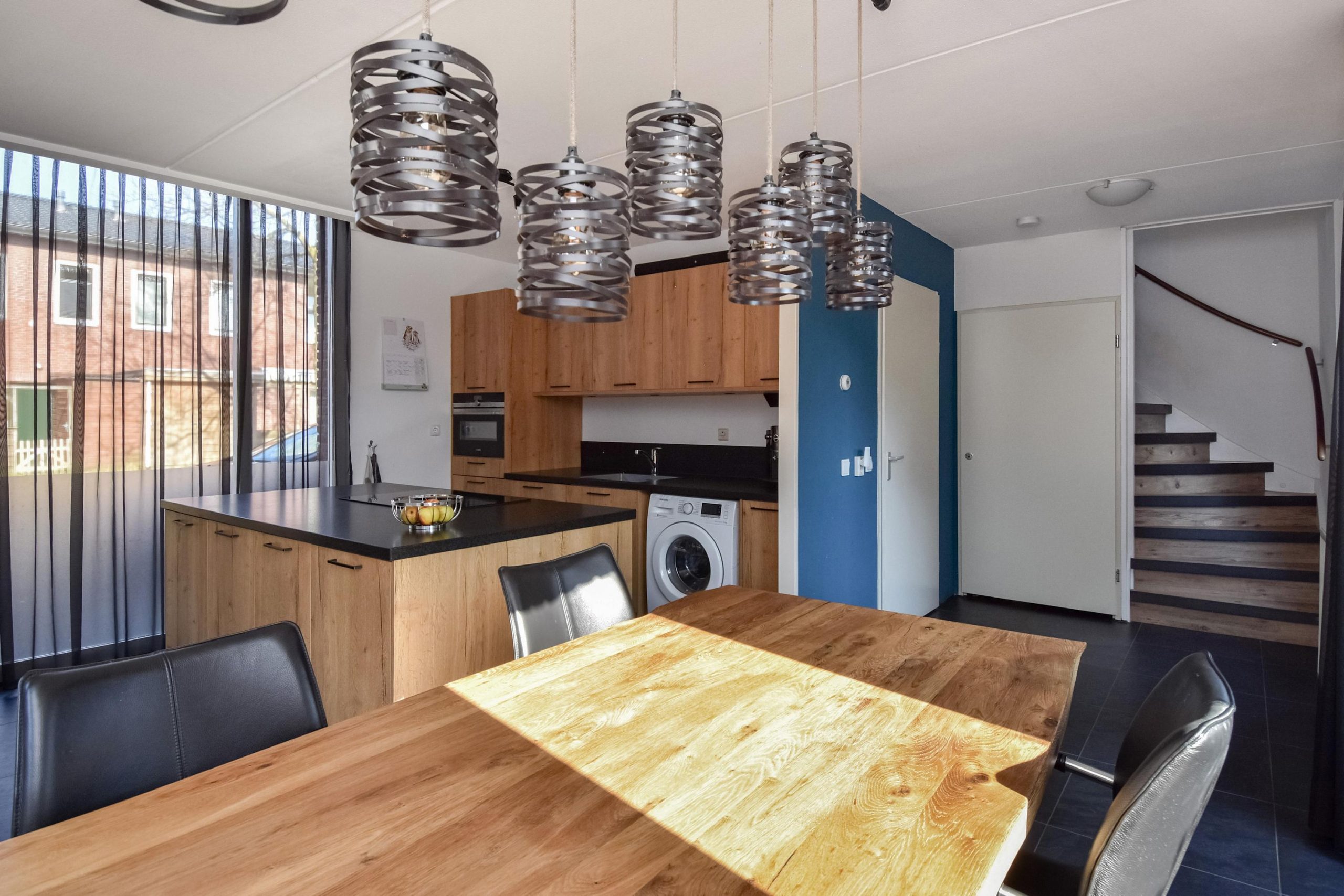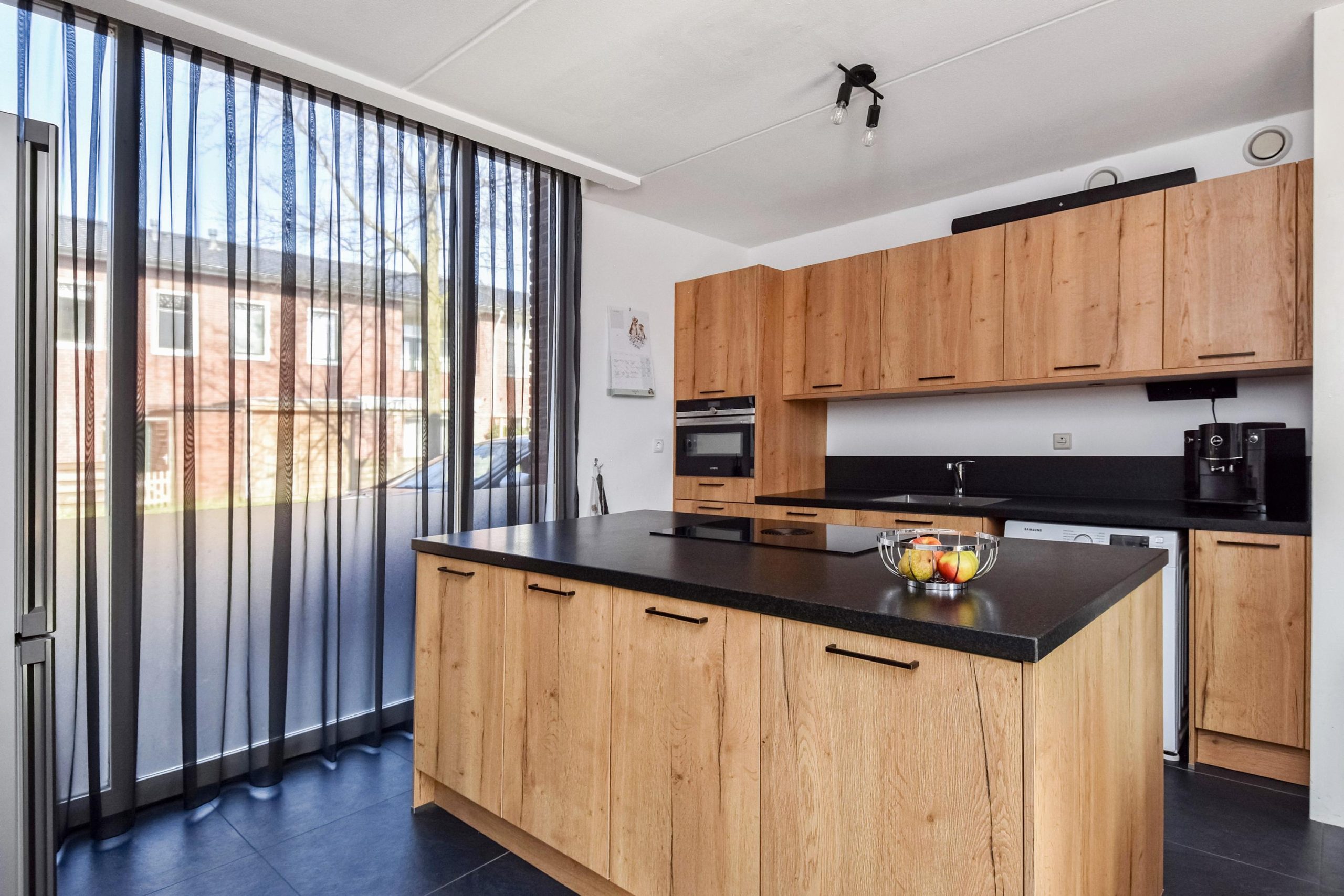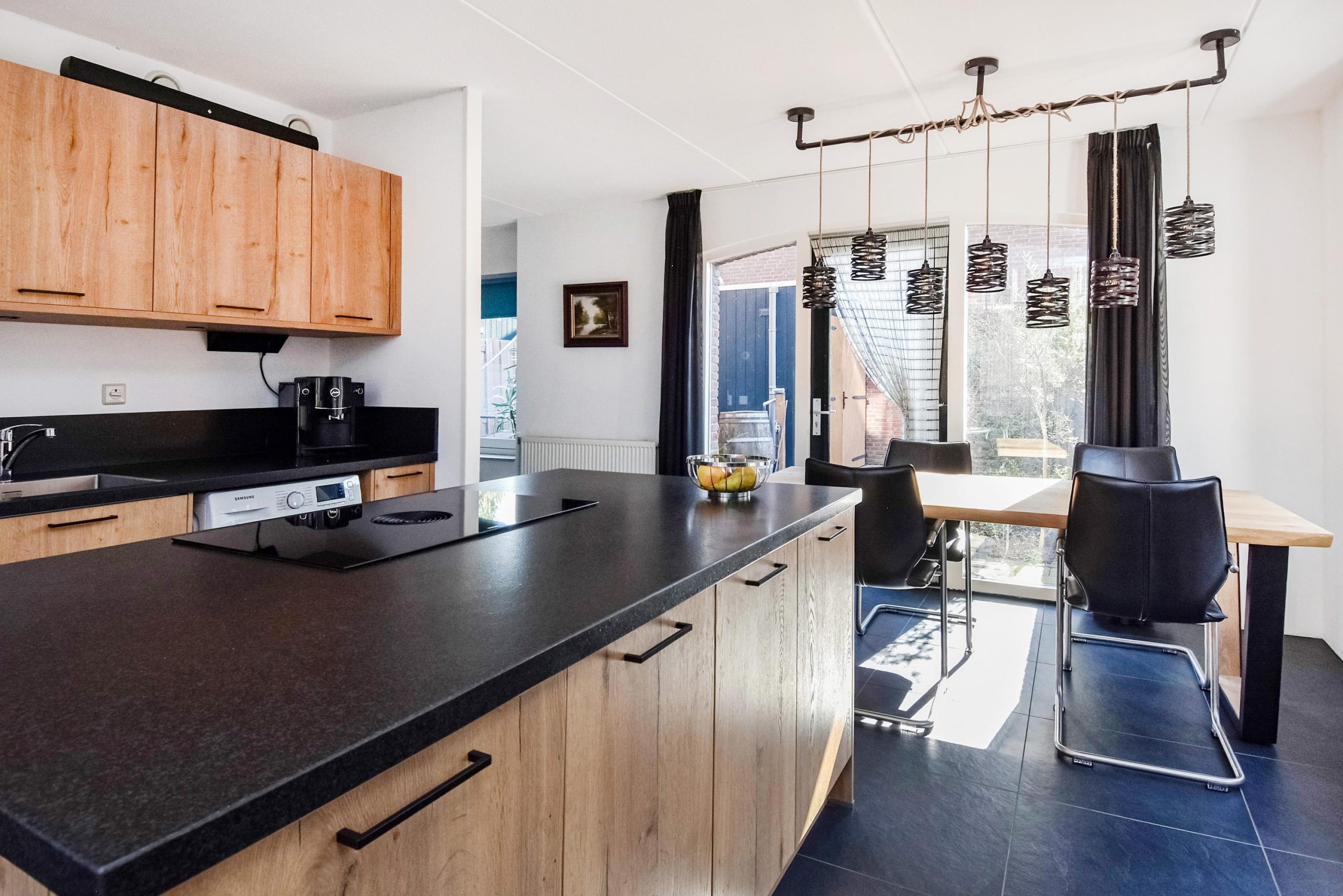 De moderne keuken (2020) is opgesteld met een groot kookeiland en voorzien van diverse inbouwapparatuur. Dankzij de grote raampartijen is er veel lichtinval en een prettige verbinding met buiten.