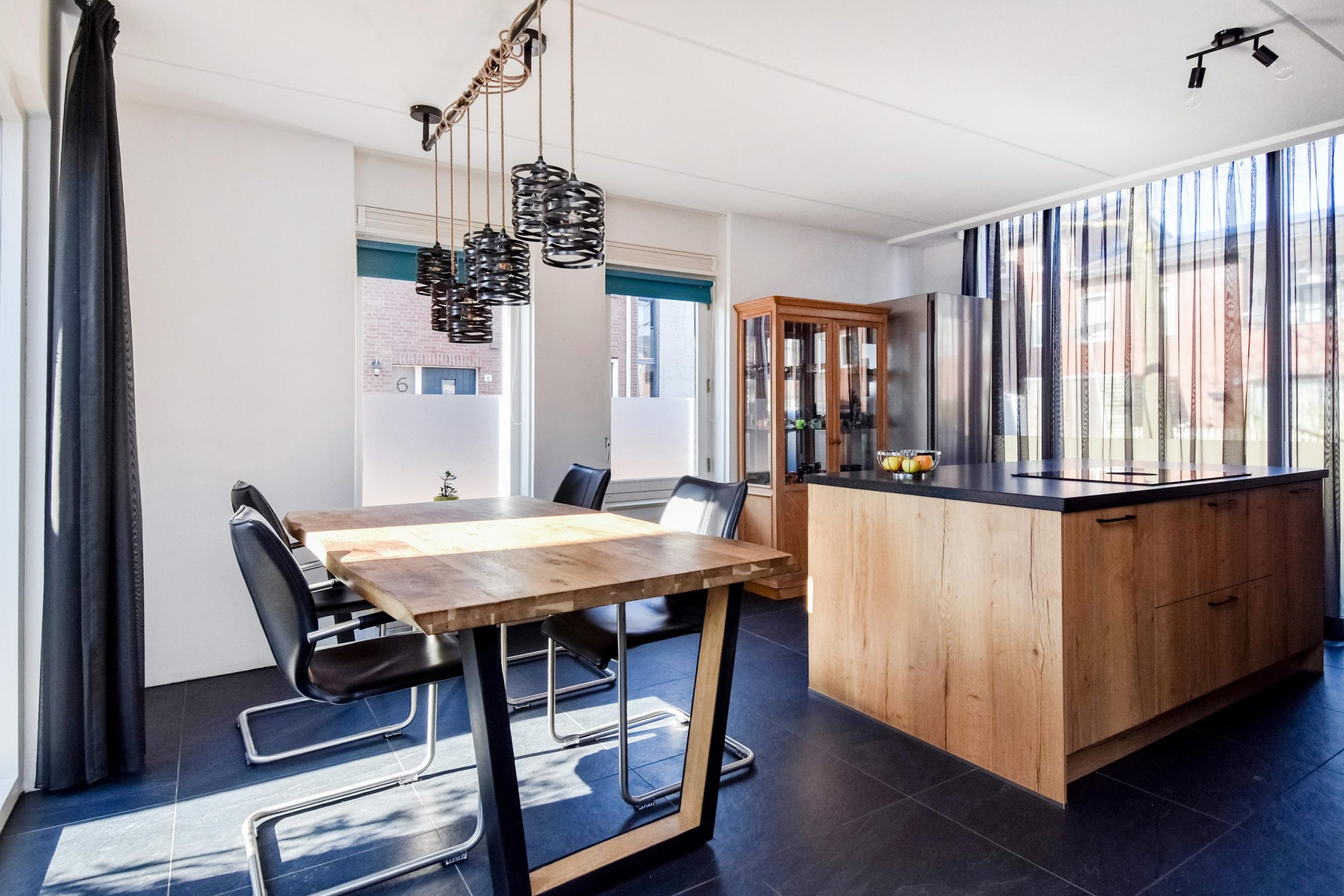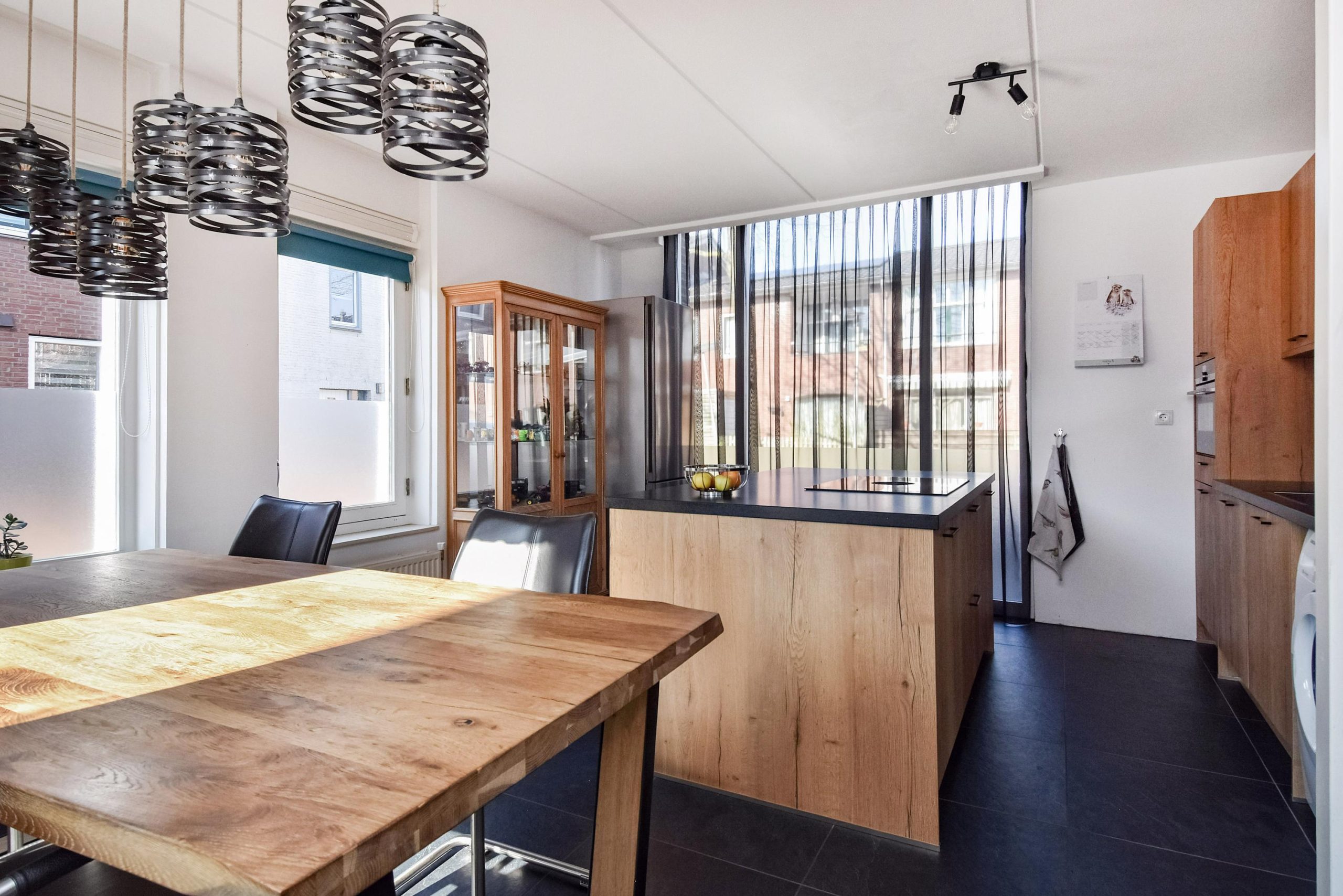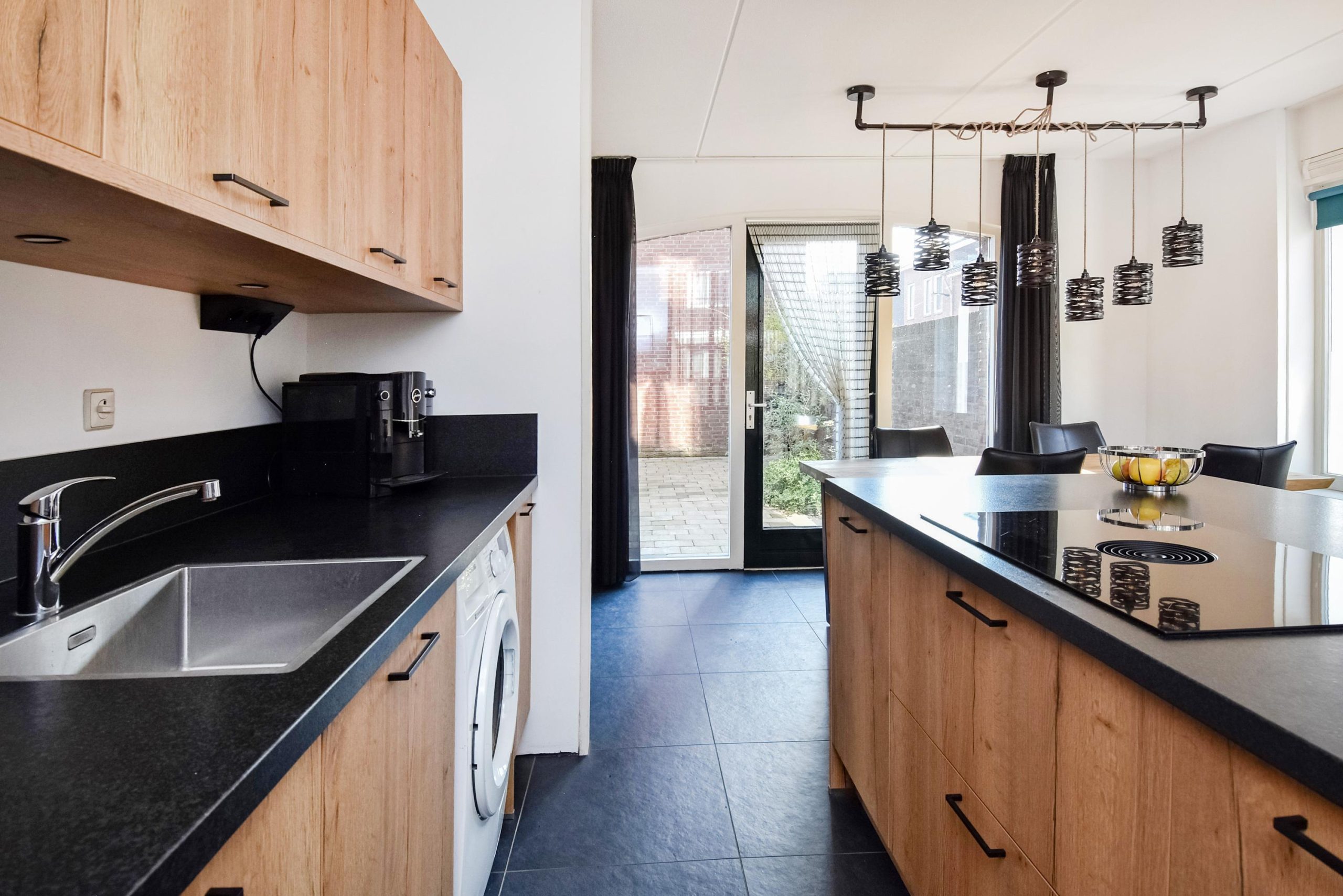 De moderne keuken (2020) is opgesteld met een groot kookeiland en voorzien van diverse inbouwapparatuur. Dankzij de grote raampartijen is er veel lichtinval en een prettige verbinding met buiten.