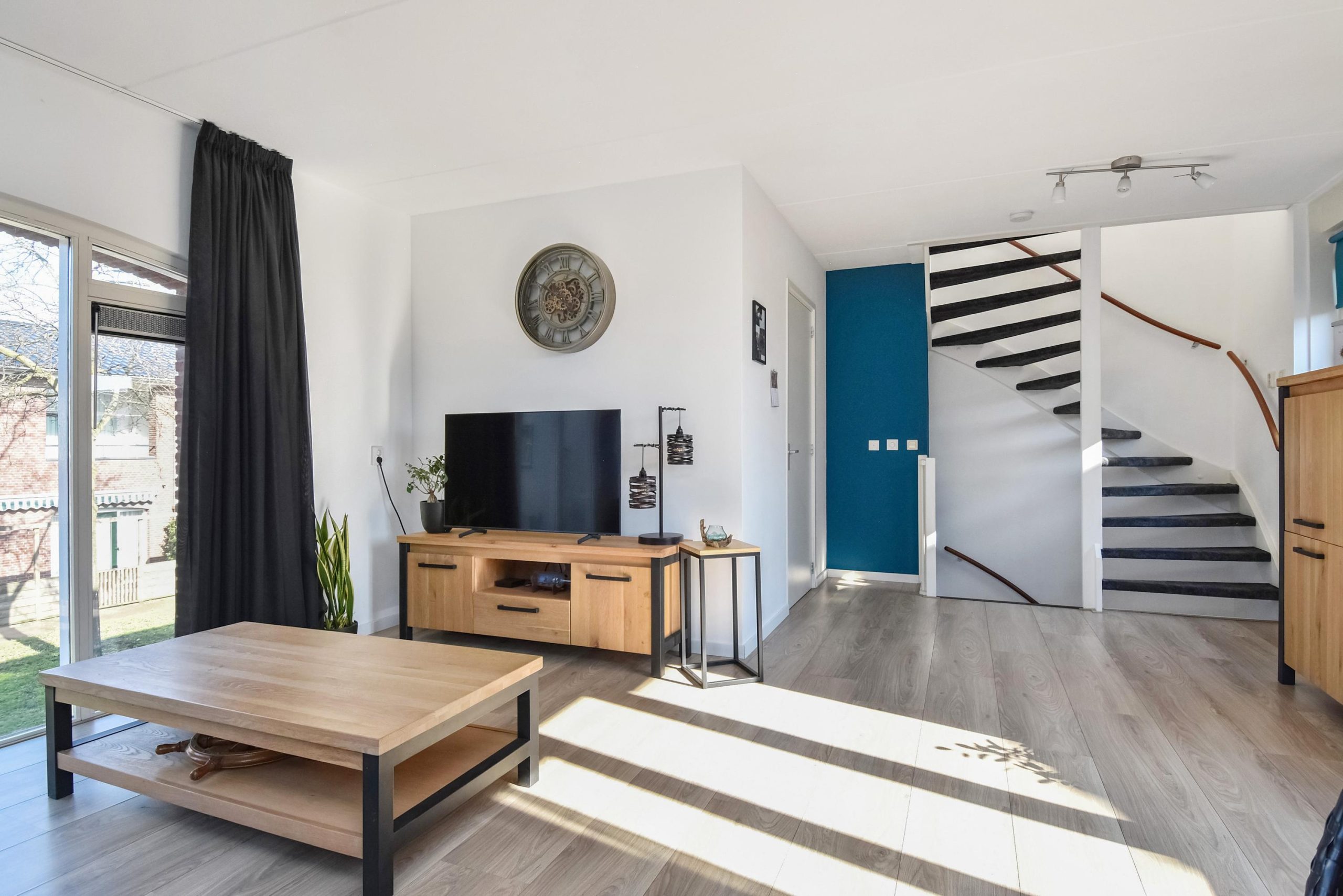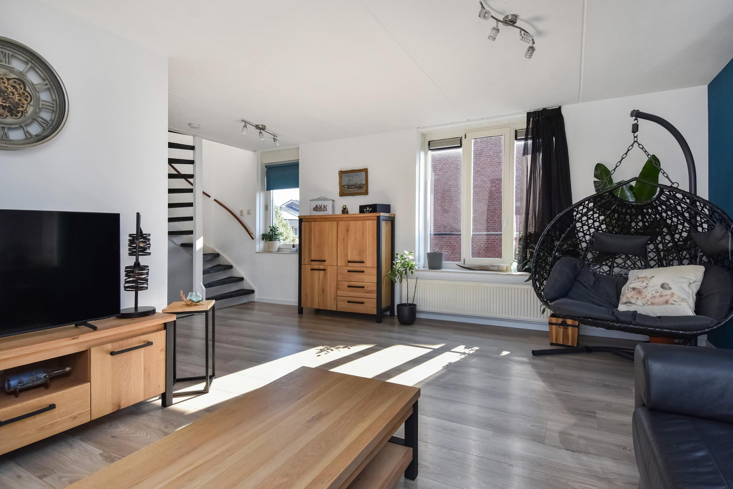 Via de trap bereikt u de riante woonkamer (ca. 29 m²), die zich over de volledige verdieping uitstrekt. De ruimte is voorzien van een nette laminaatvloer en grote raampartijen aan meerdere zijden, wat zorgt voor een bijzonder lichte en een open sfeer.