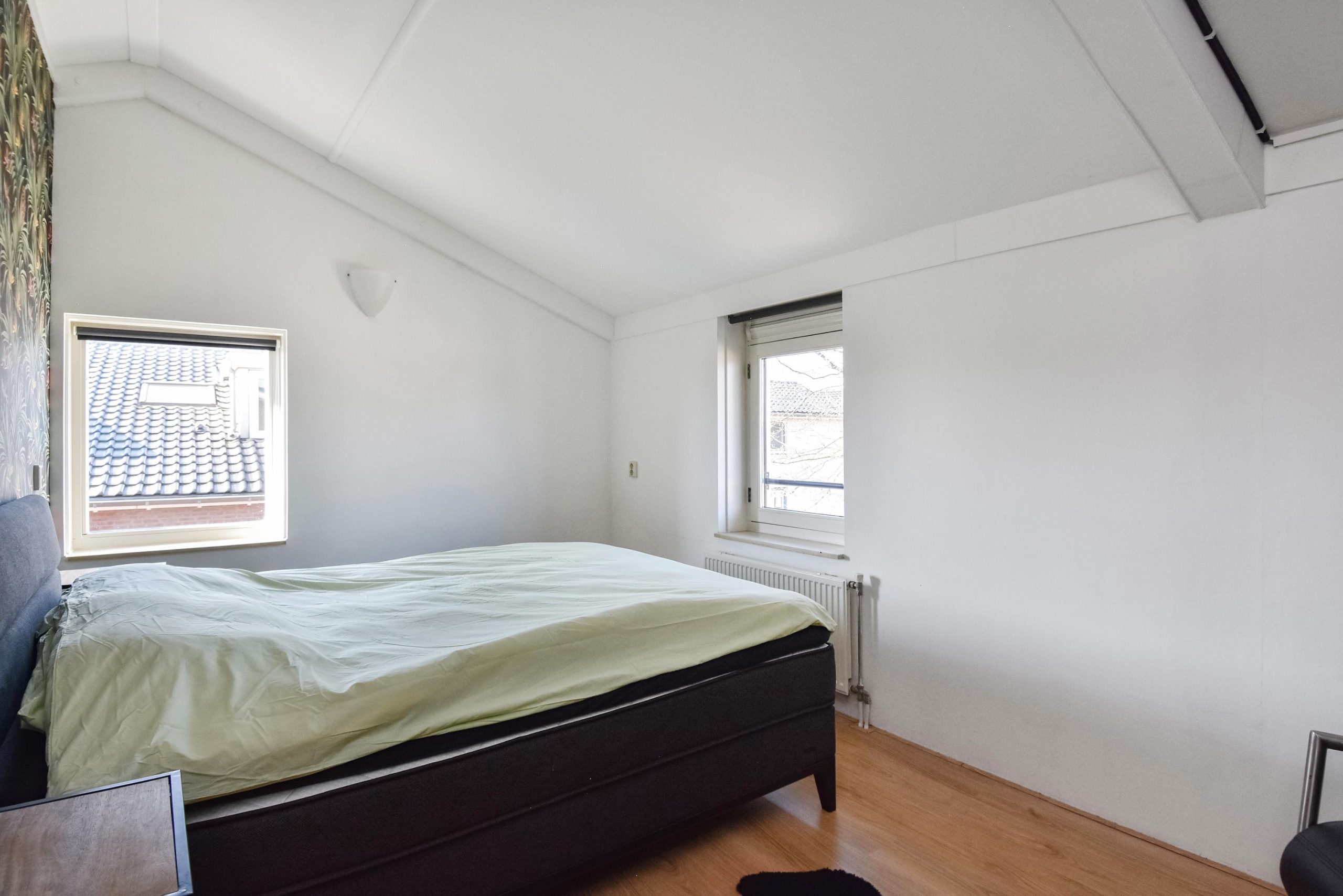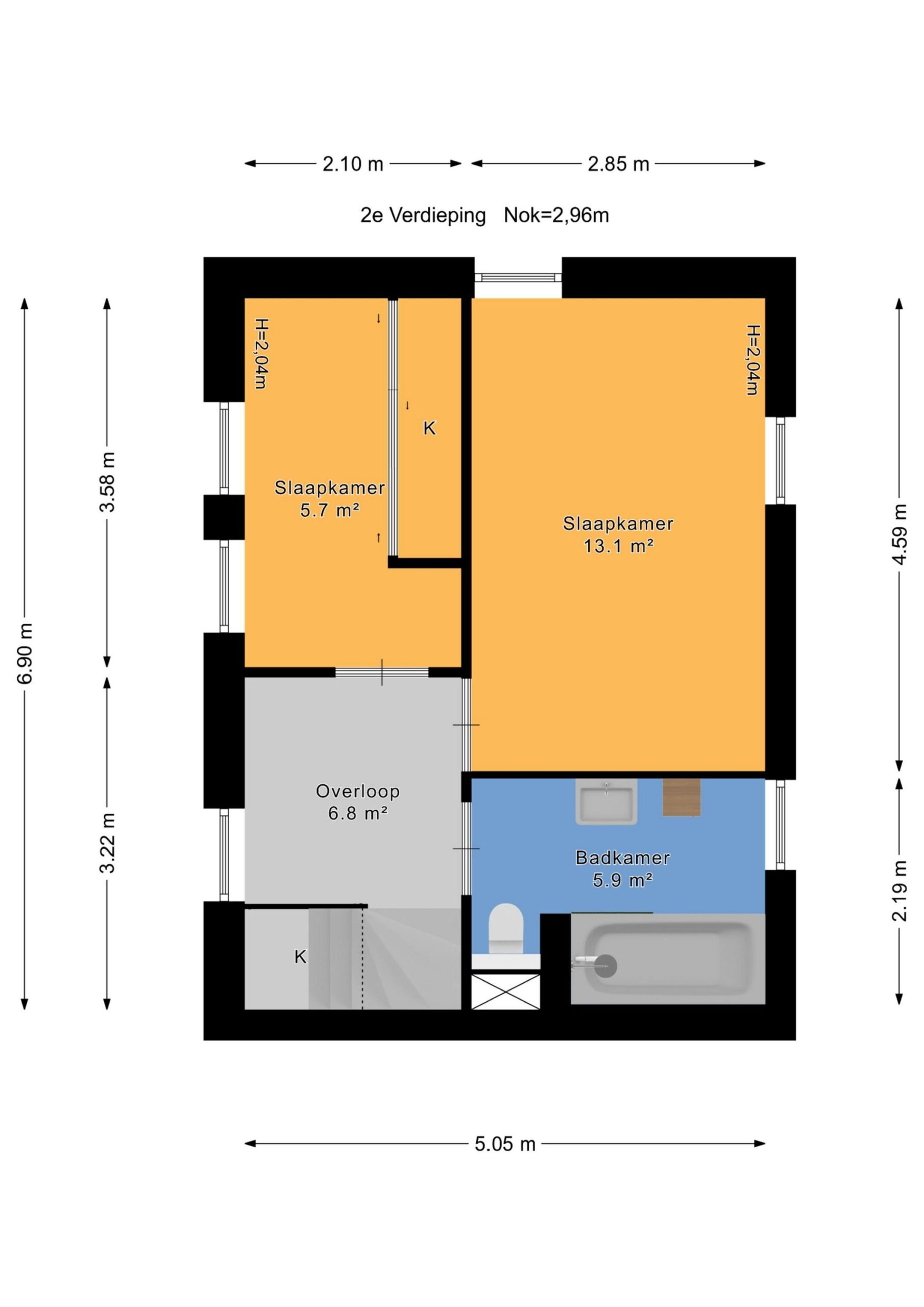 De verdieping biedt twee slaapkamers van respectievelijk ca. 13 m² en 7,5 m². De moderne badkamer (2019) is verzorgd afgewerkt en voorzien van een ligbad met douche, wastafelmeubel en toilet.