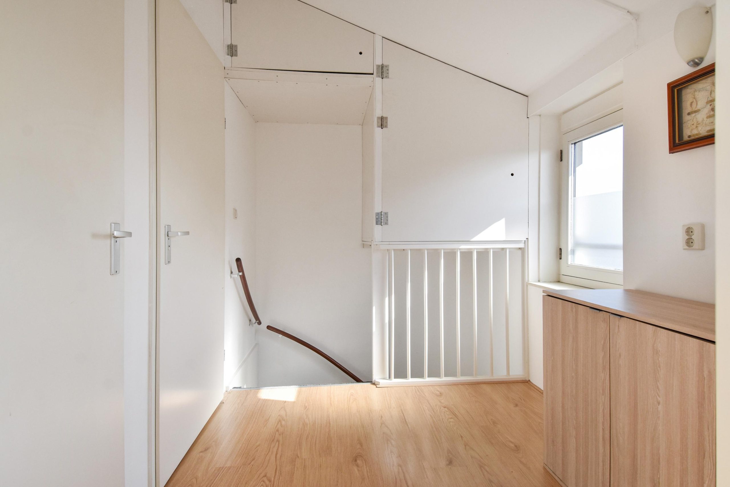 Ruime overloop met toegang tot alle vertrekken. Boven de trap is er eveneens opbergruimte gecreëerd.