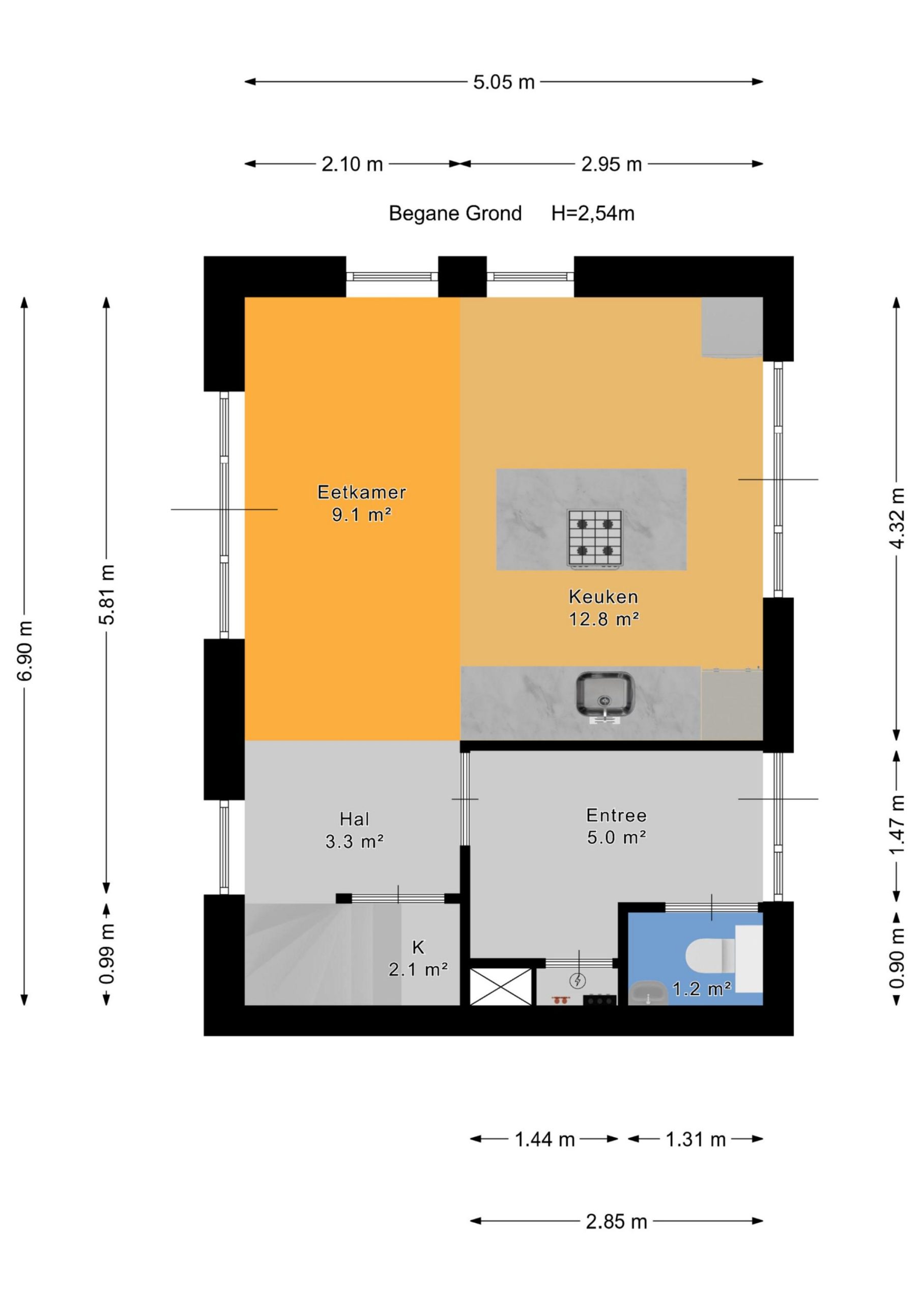 Entree met ruime hal, meterkast en toiletruimte. Vanuit de hal toegang tot de royale woonkeuken en eetkamer (ca. 22 m²).