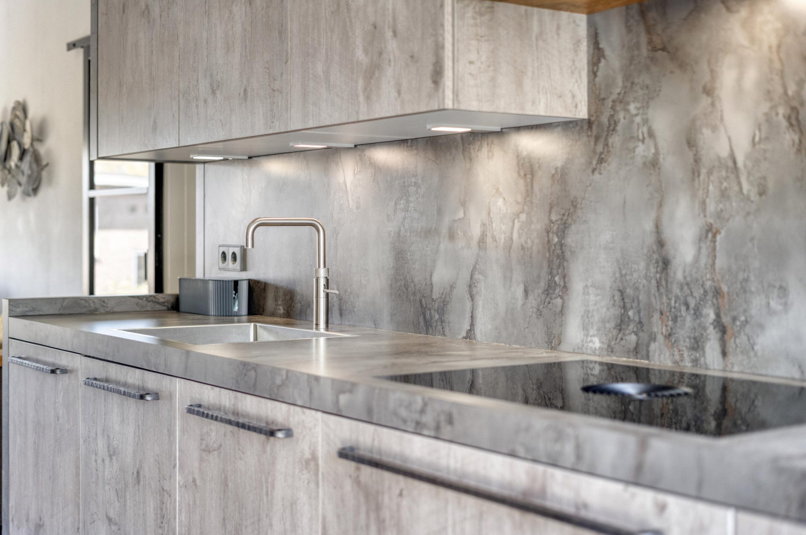 Een ruime en lichte woon-/ eetkamer (ca. 9.05 x 3.85) met open moderne keuken voorzien van ingebouwde koel-/vriescombinatie, vaatwasmachine, Bora vierpits inductiekookplaat met ingebouwde afzuiging, (combi)oven en een Quooker kraan en toegang tot het zonnige balkon (ca. 6.00 x 0.93) aan achterzijde op het zuidwesten.