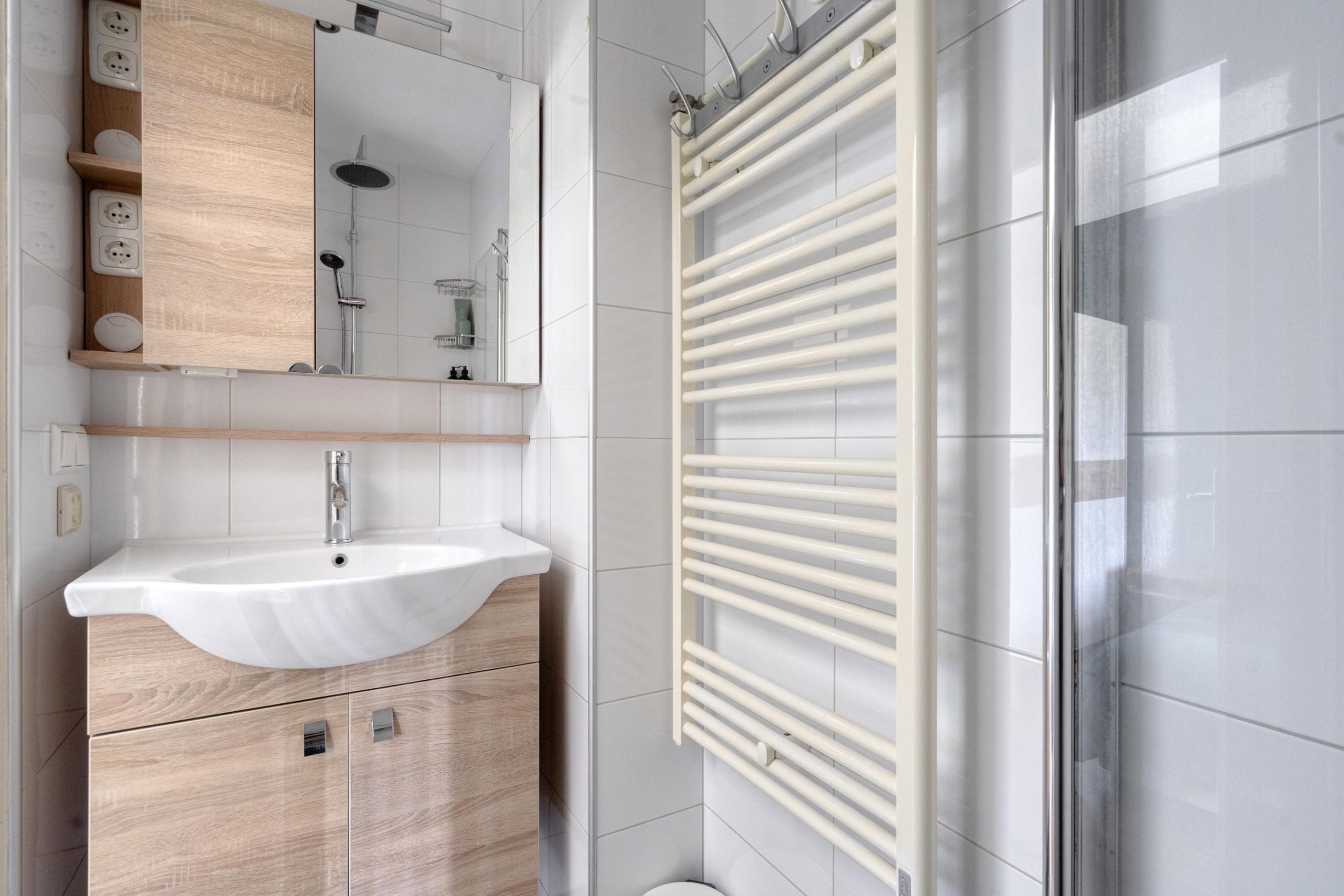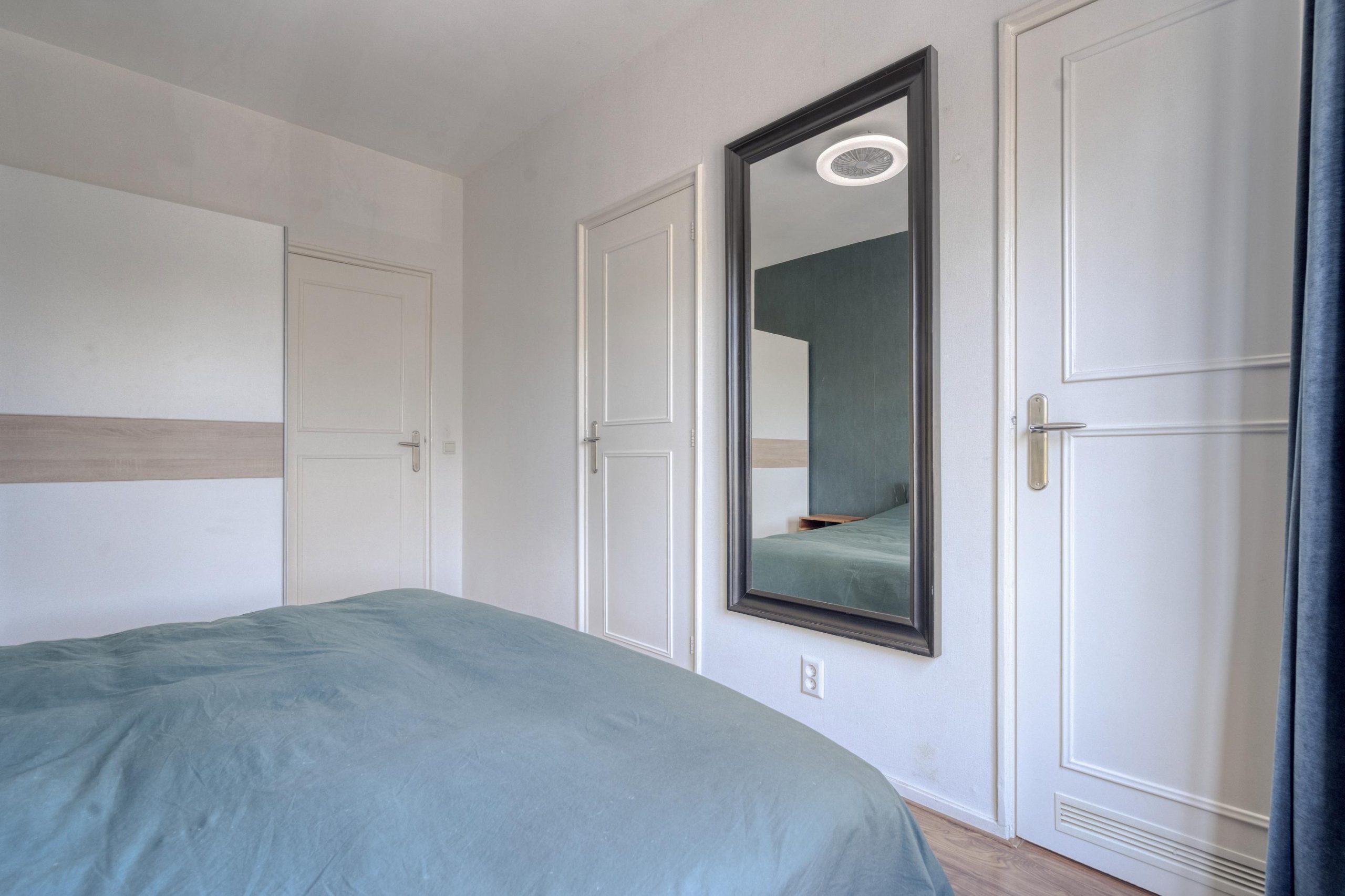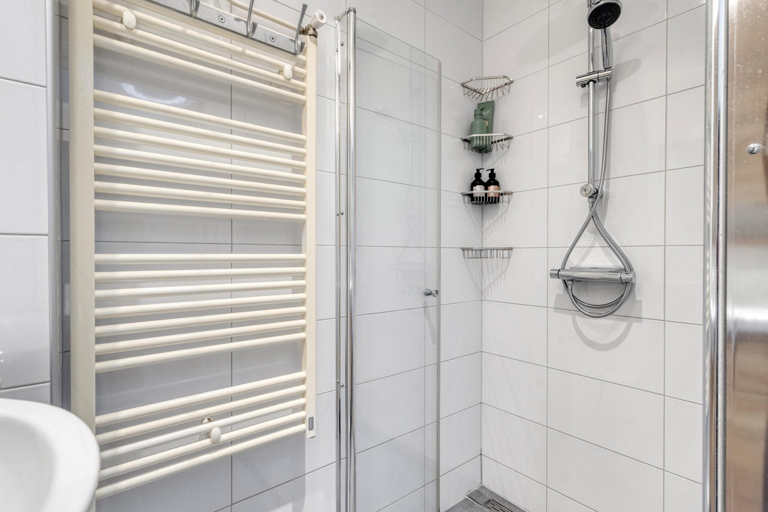 Aan de voorzijde bevindt zich de hoofdslaapkamer (ca. 3.90 x 2.80 m), voorzien van een diepe vaste kast met opstelplaats voor de wasmachine en de cv-ketel (Intergas, ca. 2011). Vanuit deze kamer is er toegang tot de moderne badkamer (ca. 2.00 x 1.10 m), uitgerust met een wastafelmeubel en douche.