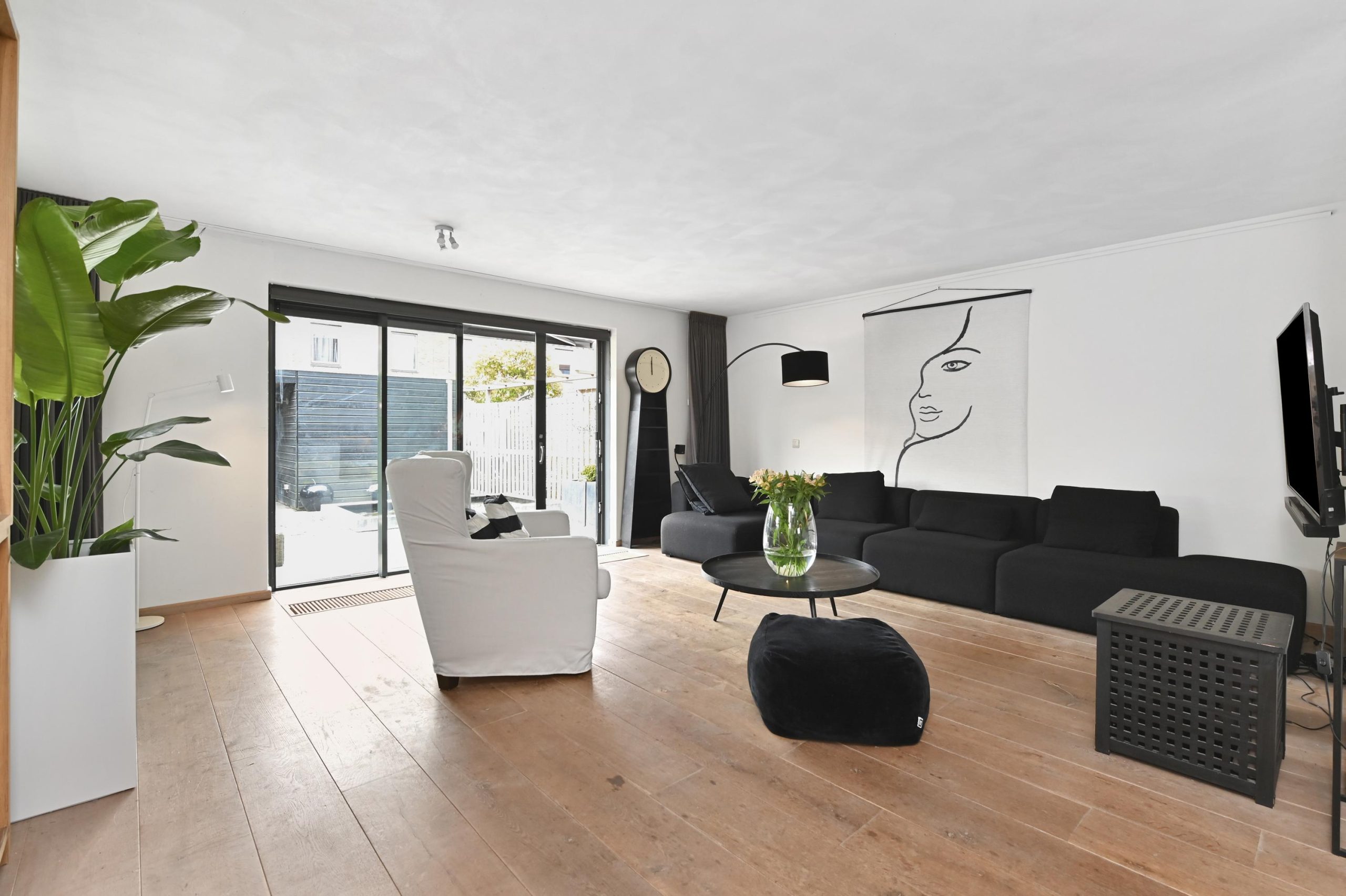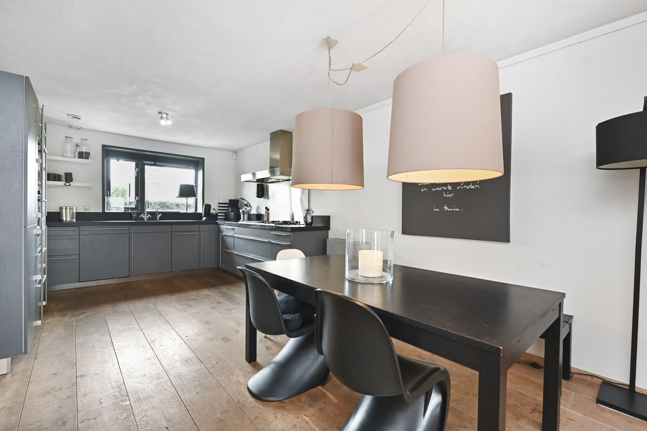 Tuingerichte, lichte woonkamer met houten plankenvloer en schuifpui naar de tuin. Vanwege de hoekligging heeft de woonkamer de beschikking over een extra zijraam. Moderne keuken in U-opstelling en voorzien van diverse inbouwapparatuur.