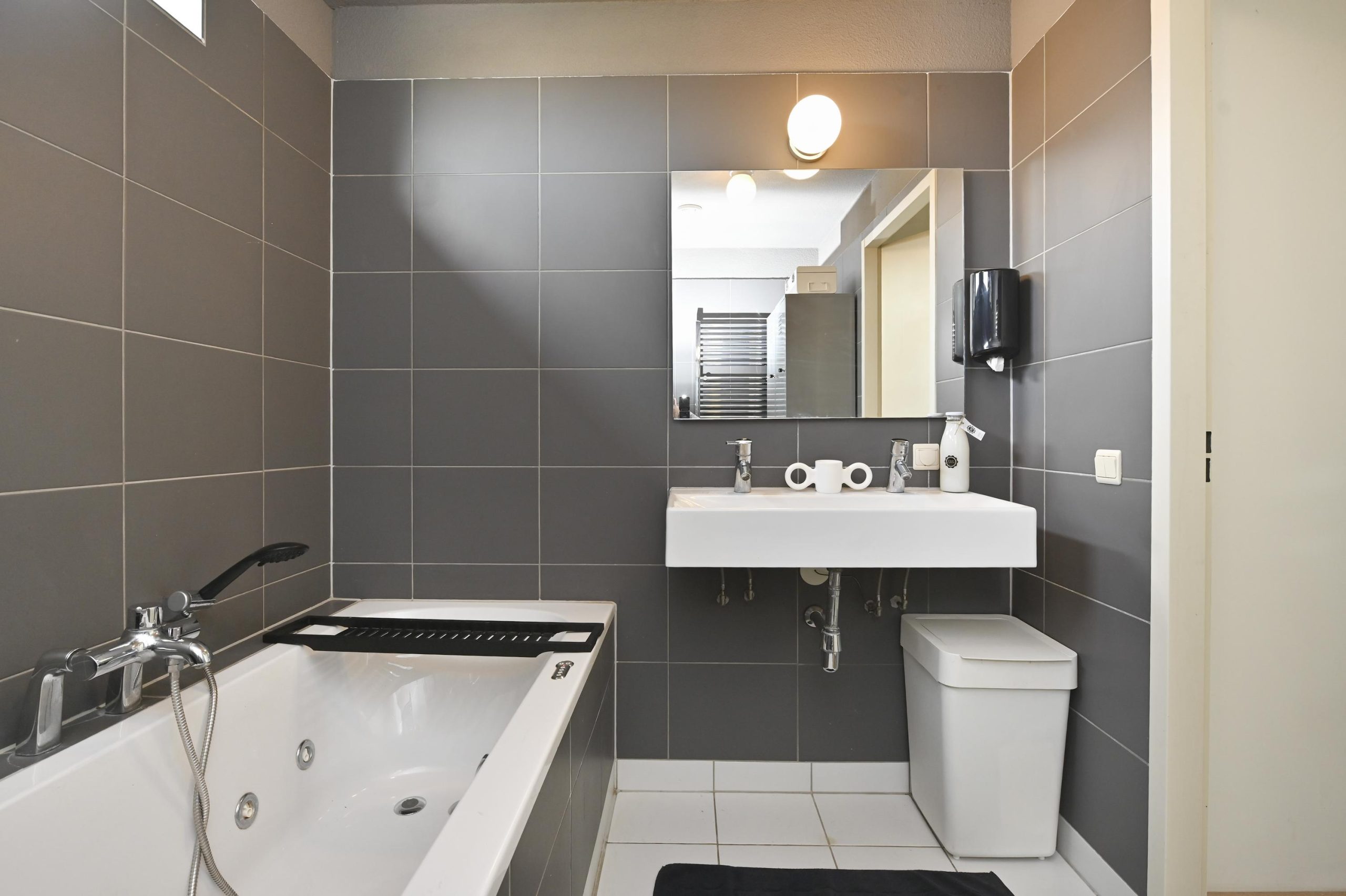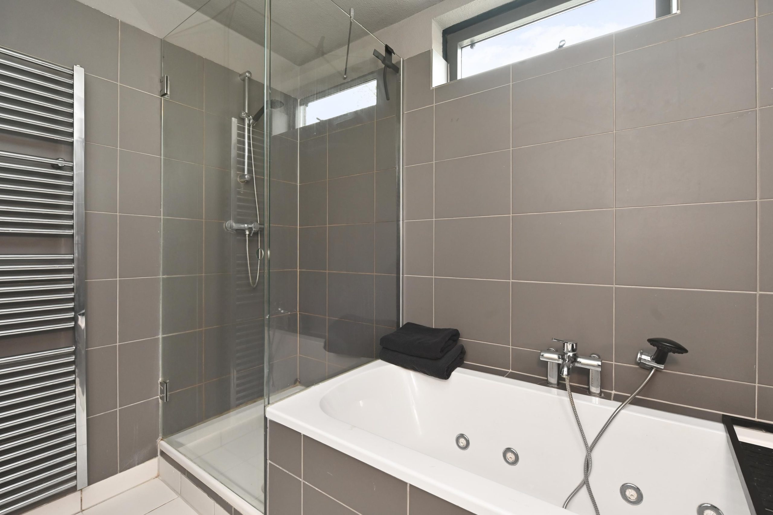Overloop met tweede toilet en vaste kast. Slaapkamer aan de voorzijde van ca. 17,3 m2. Slaapkamer aan de achterzijde van ca. 22 m2 met eveneens extra zijraam. Moderne badkamer met vloerverwarming, ligbad (bubbelbad), separate douche, dubbele wastafel en