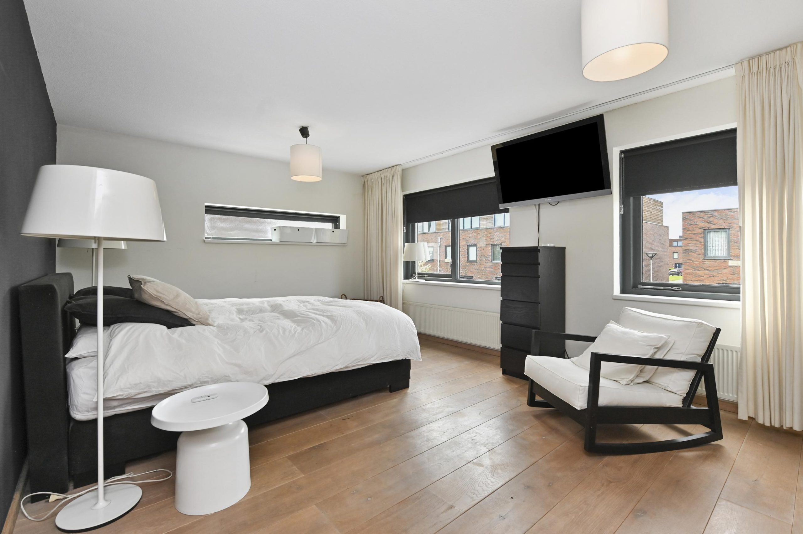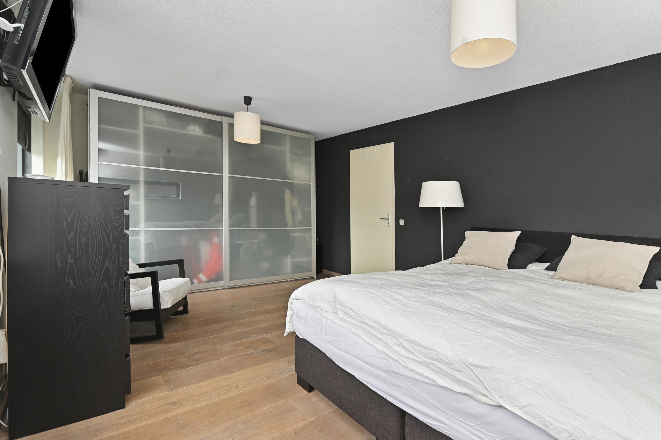 Overloop, slaapkamer aan de voorzijde van ca. 19,6 m2, slaapkamer aan de achterzijde van ca. 7.7 m2 met deur naar dakterras van ca. 13 m2.
