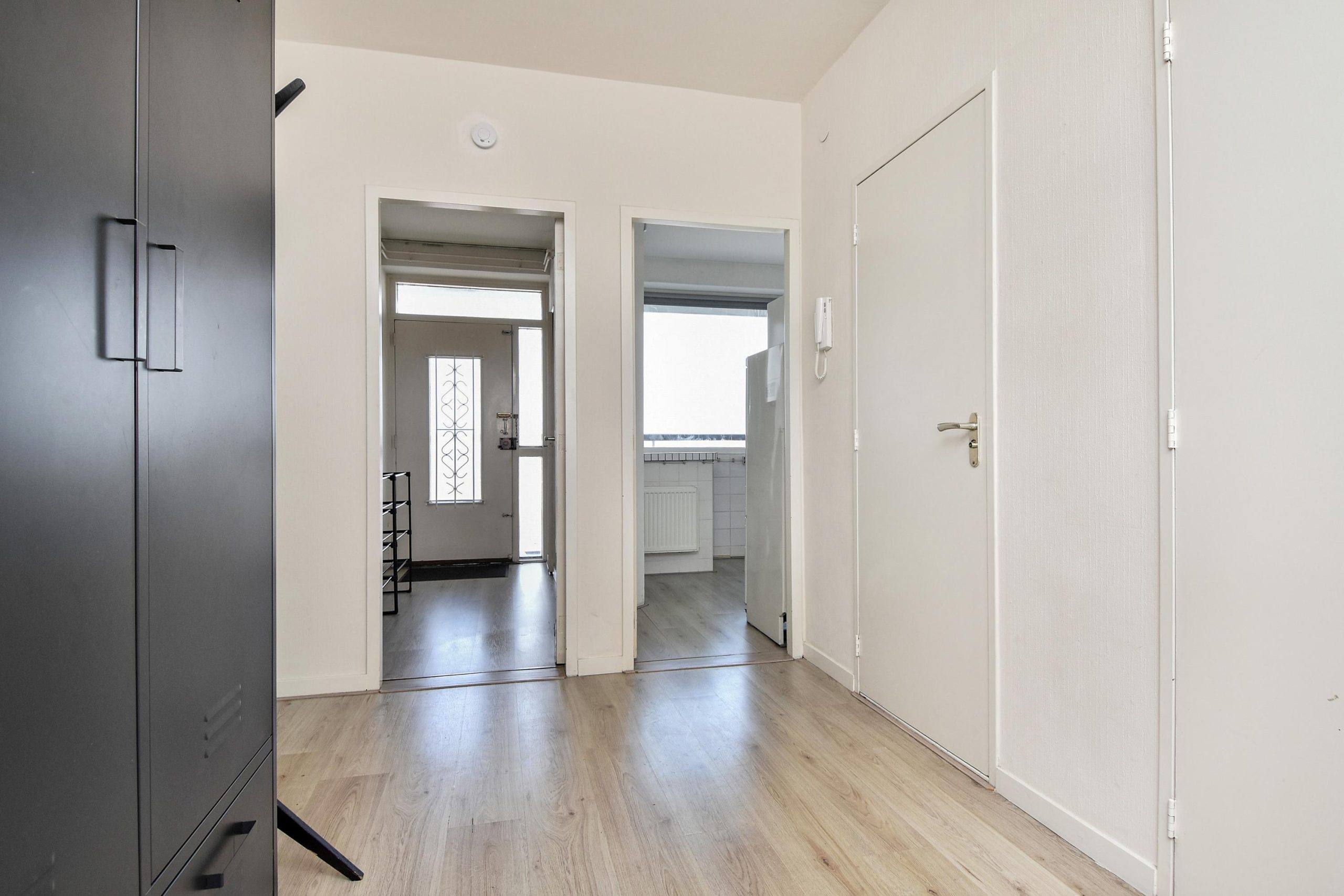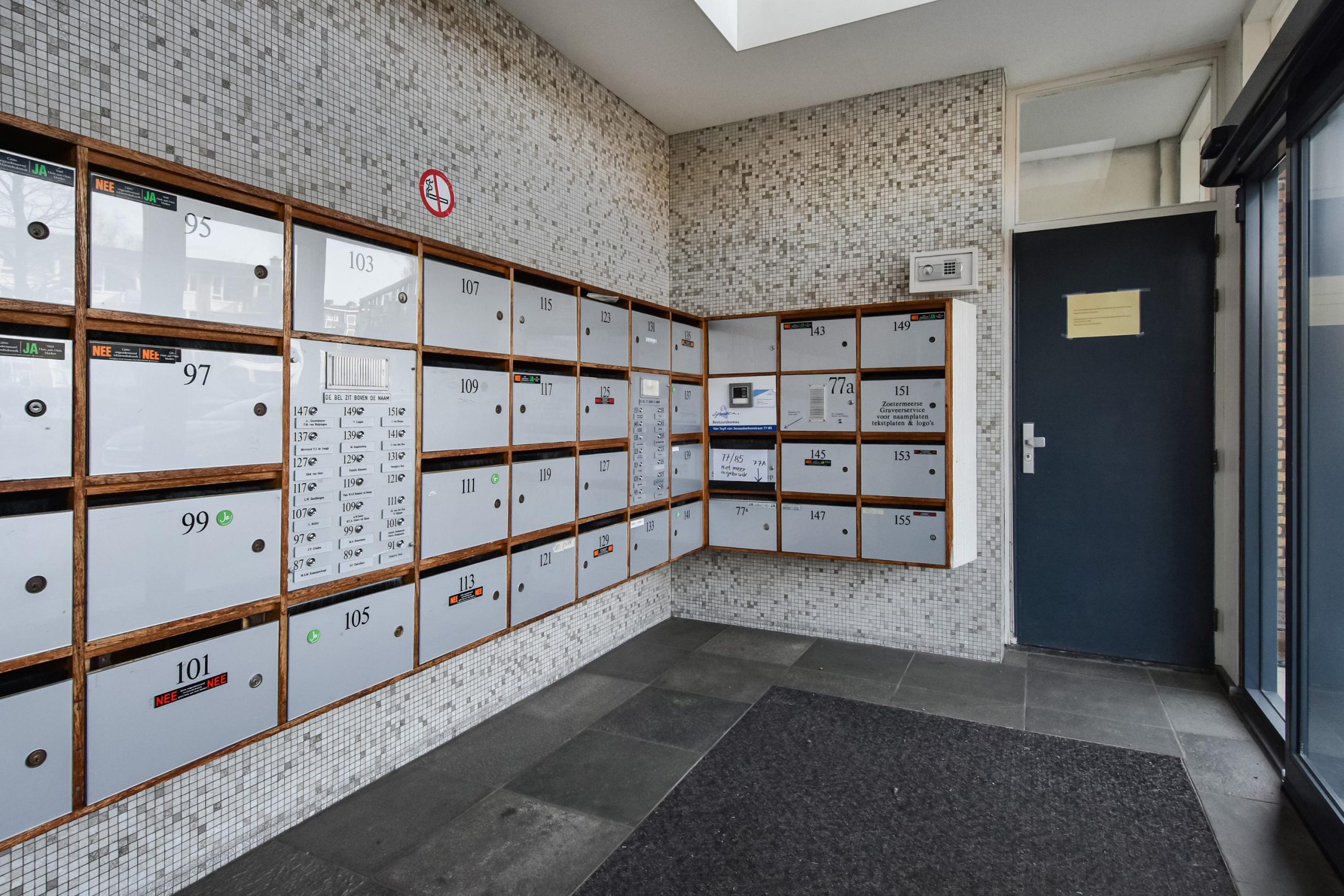 Gesloten entree met bellentableau; trap of lift naar de 4e verdieping; galerij.