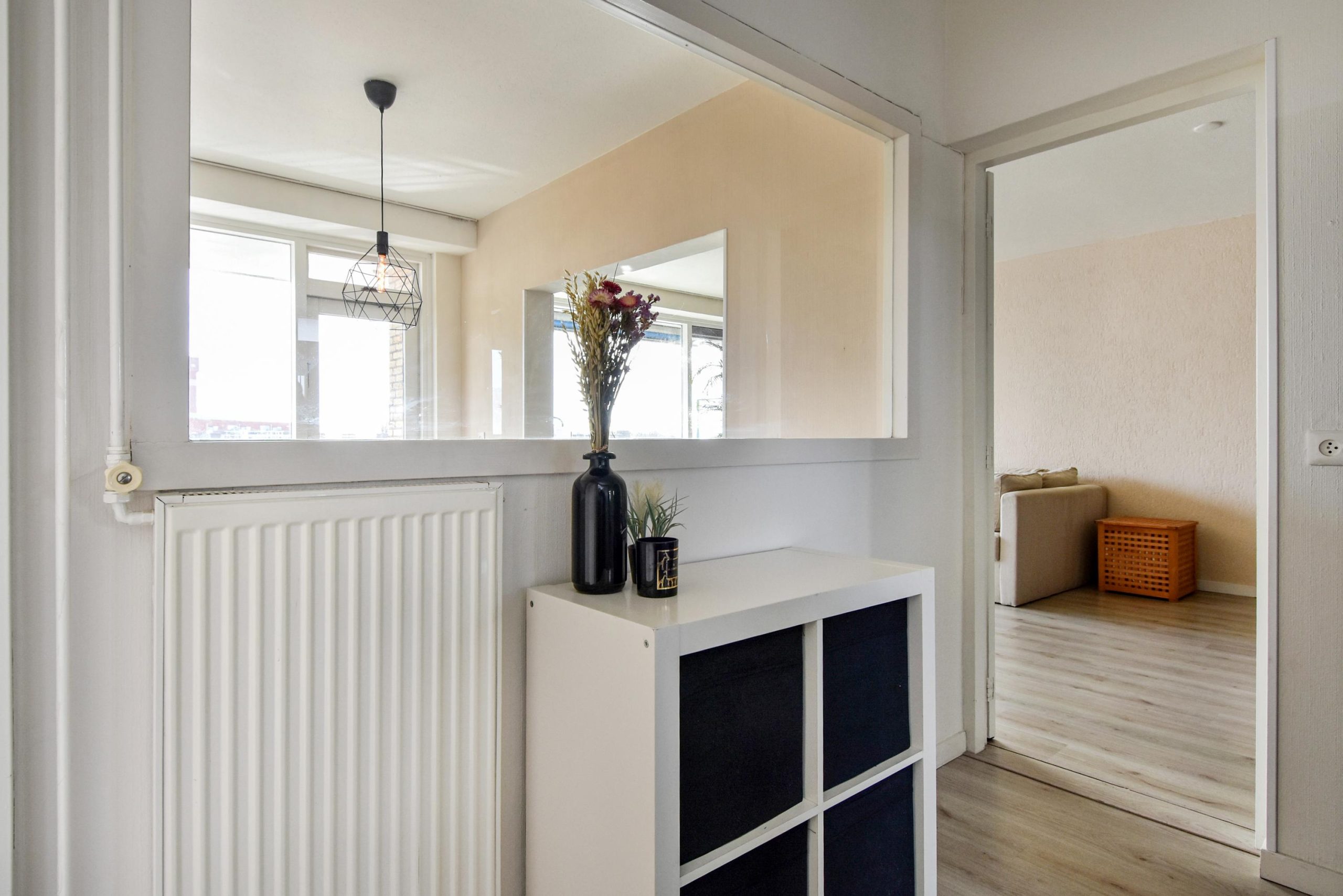 Entree appartement, vestibule met meterkast. Ruime centrale hal voorzien van toilet met fonteintje. Via de hal heeft u toegang tot de mooie lichte woon- /eetkamer dat fraai vrij uitzicht biedt. Middels de woonkamer heeft u toegang tot het zonnige balkon. Een dichte keuken voorzien van een 4-pits gasfornuis, een afzuigkap, een koelkast, oven, spoelbak en opstelplaats van de CV-ketel. Ruime hoofdslaapkamer gelegen aan de voorzijde. De tweede slaapkamer is gelegen aan de achterzijde. De badkamer is voorzien van een douche, een wastafel en wasmachine aansluiting. In de onderbouw is een individuele berging aanwezig