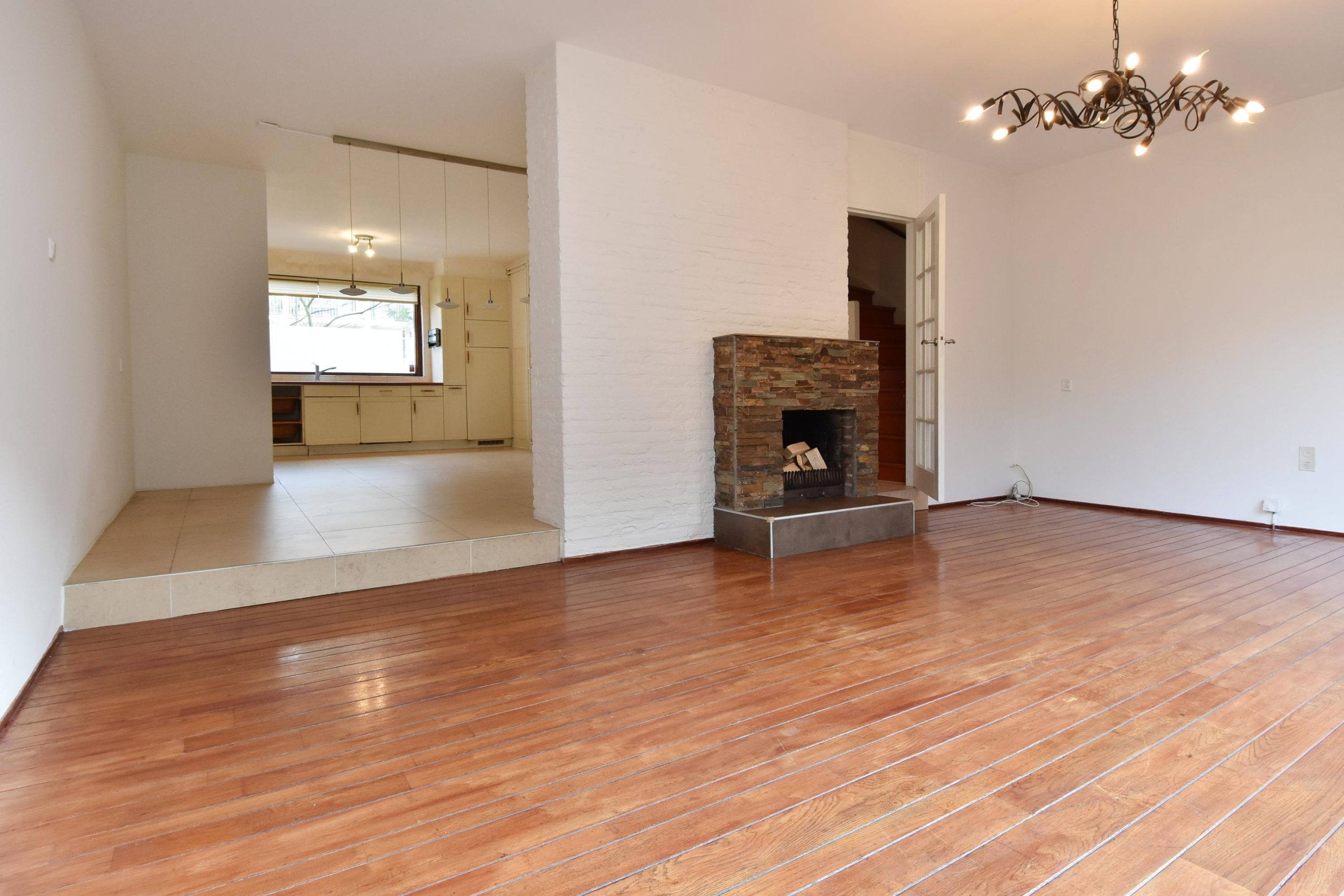 De woonkamer is licht en sfeervol, met een schouw als sfeervol middelpunt. Deze ruimte is zowel via de keuken als via de gang bereikbaar.