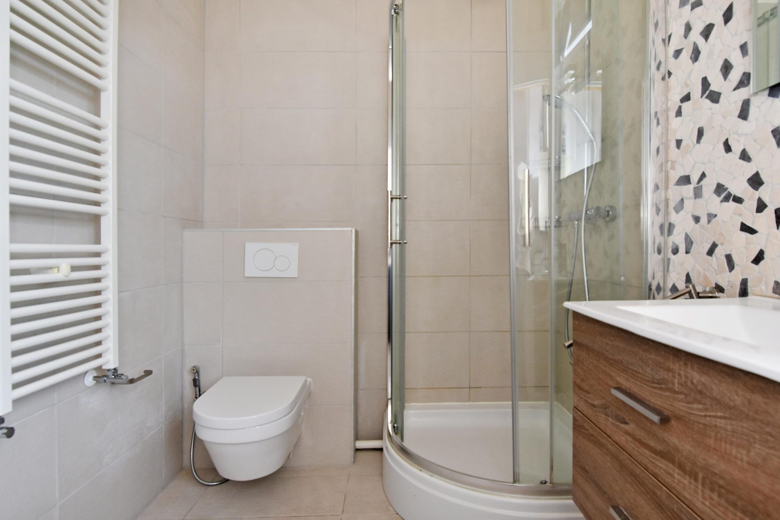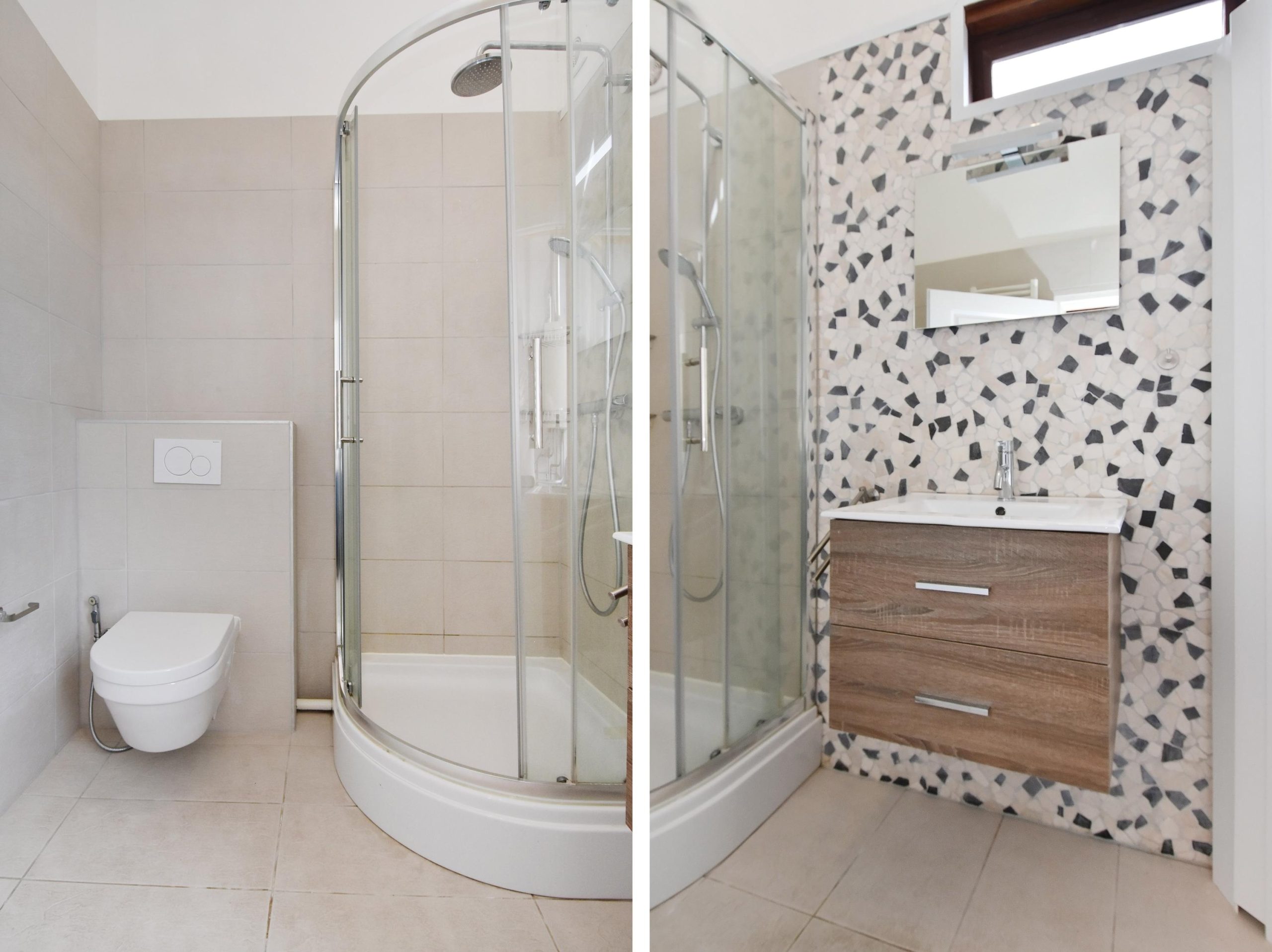 Op deze verdieping bevinden zich 2 badkamers, een van 3.01 x 2.05 met ligbad en wastafel en een van ca. 1.98 x 0,99 m met douche en vaste wastafel en een separaat toilet met fonteintje.